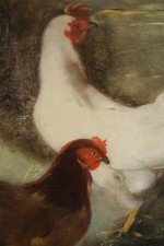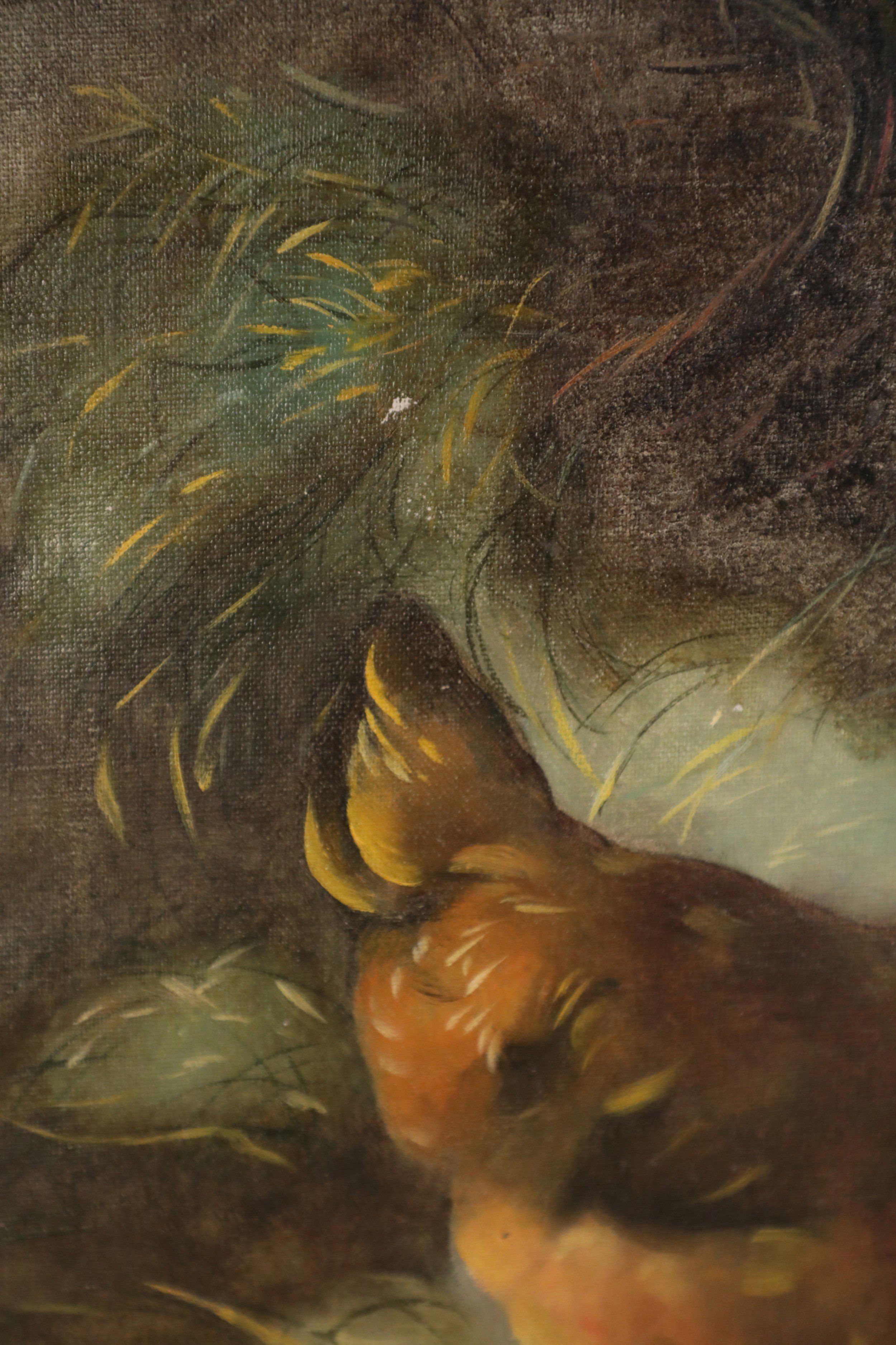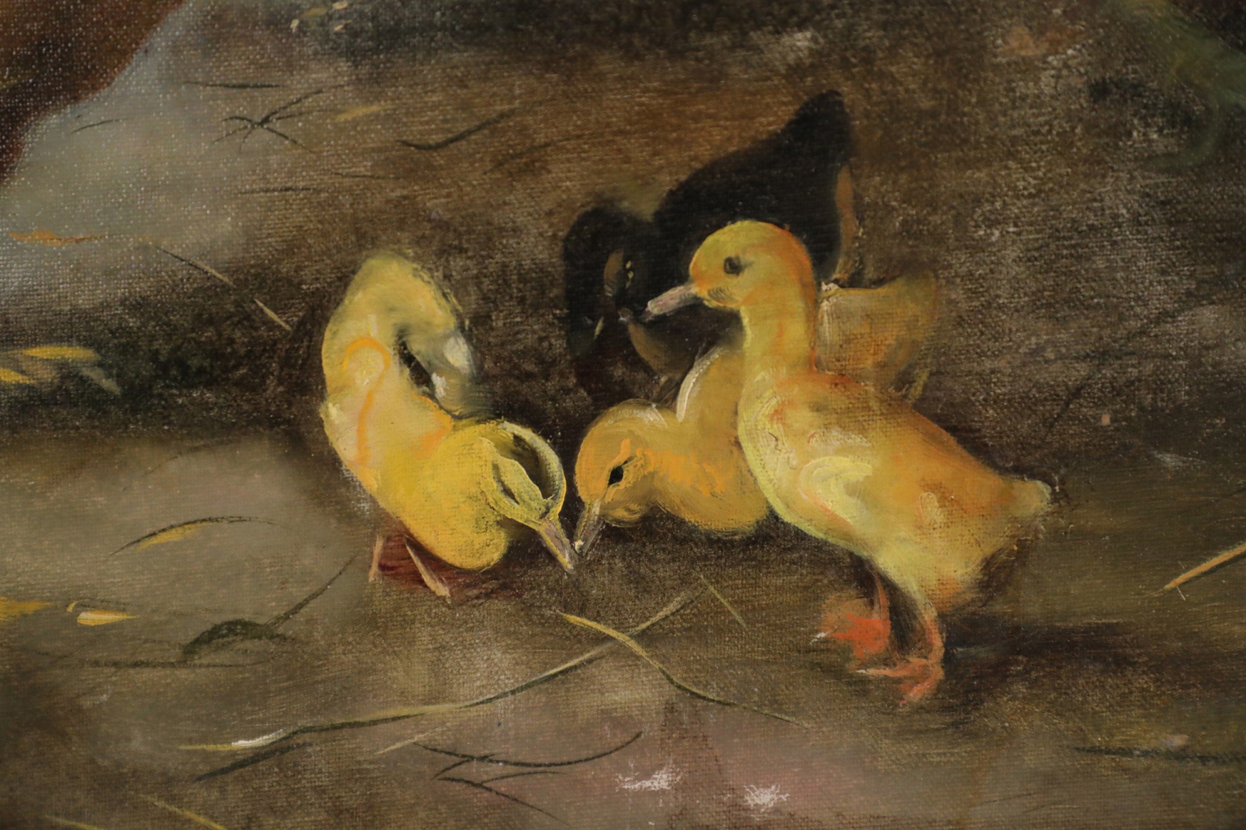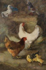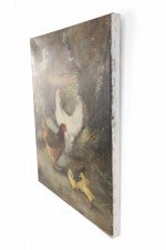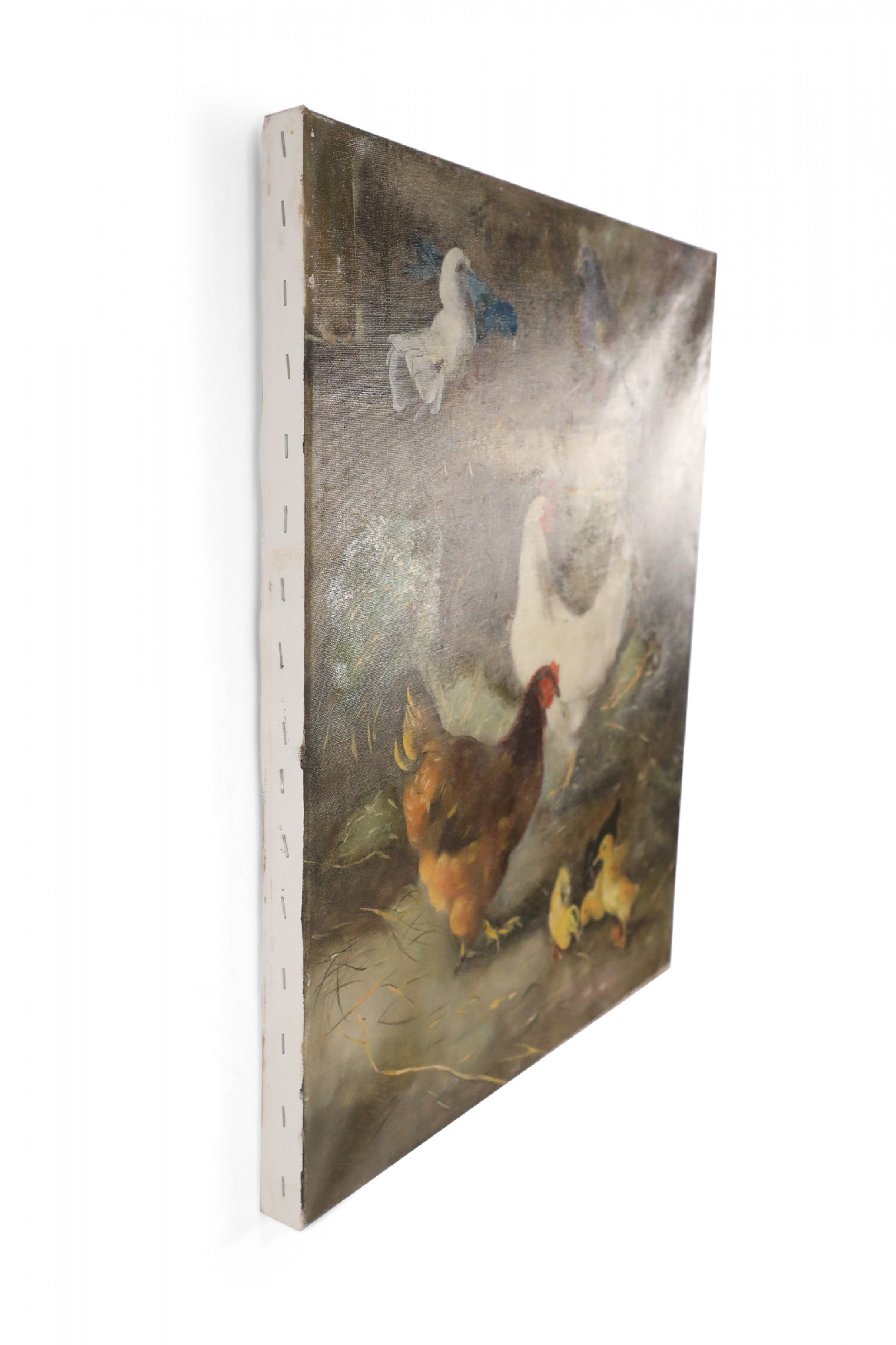 English Victorian style (20th Century) oil painting depicting chickens, ducklings, doves, and pigeons pecking for seed on a hay-covered floor, painted on rectangular, unframed canvas.