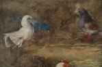 English Victorian style (20th Century) oil painting depicting chickens, ducklings, doves, and pigeons pecking for seed on a hay-covered floor, painted on rectangular, unframed canvas..