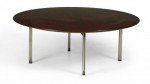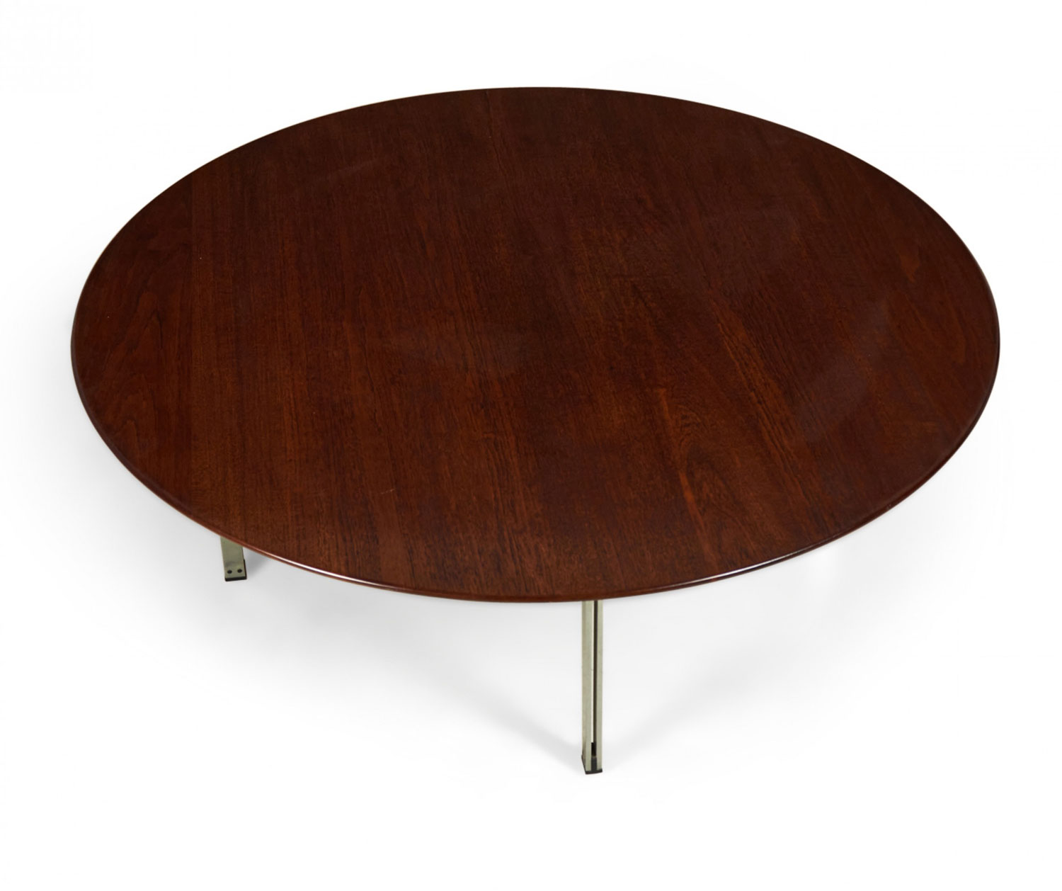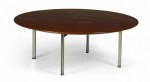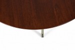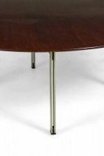 American Mid-Century 'Parallel Bar' cocktail / coffee table with a circular walnut top supported by three satin chrome-plated steel legs. (FLORENCE KNOLL)