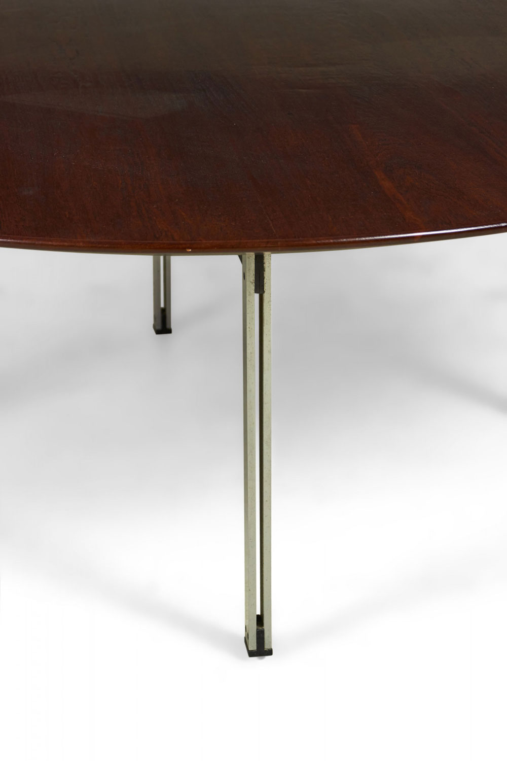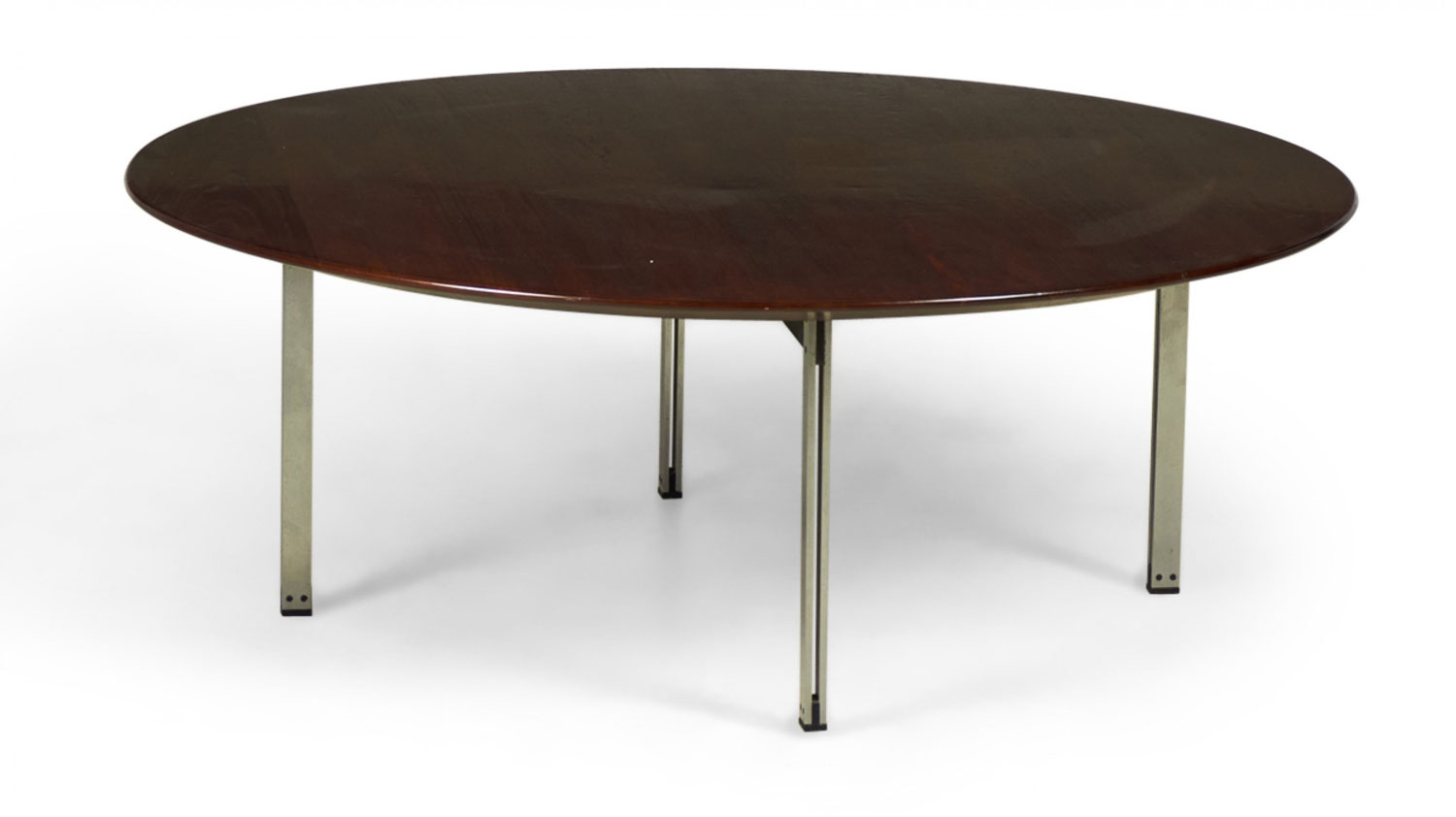 Style: Mid-Century Materials & Techniques: Chrome, ebonized, metal, steel, walnut, wood Category: Tables Condition: Restored wood finish. Good; Wear consistent with age and use