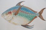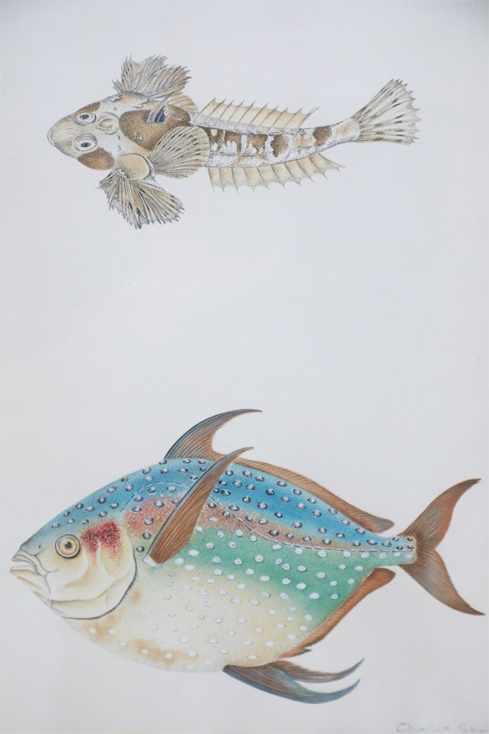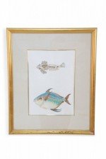 English Victorian style lithograph of two tropical fish, one small and brown, one larger and multi-colored in a beige mat with gold bevel and a rectangular giltwood frame. (signed, Charles Skora, #9) (Companion piece: NWL2522)
