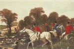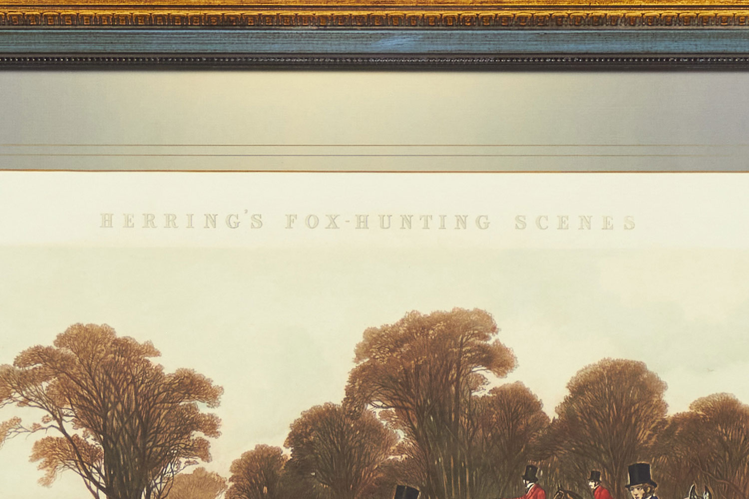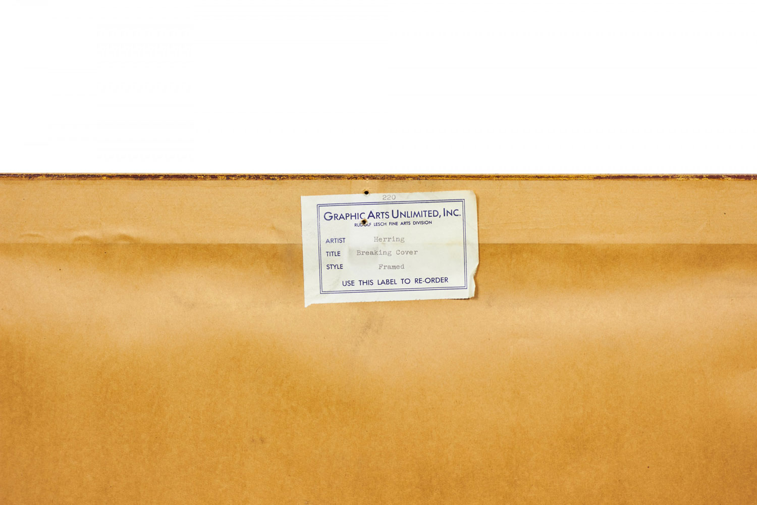 Framed English Victorian Lithograph Print of Huntsmen and Dogs Breaking Cover