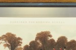 English Victorian-style lithograph print of a fox hunt scene depicting hunters on horseback and dogs breaking through the tree cover to chase their quarry in a rectangular wooden frame and gray and white mat. (similar items 062902-062921)