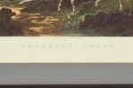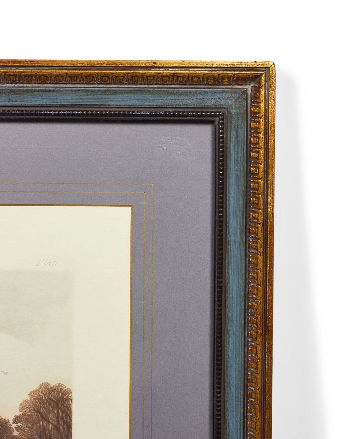 English Victorian-style lithograph print of a fox hunt scene depicting hunters on horseback and dogs breaking through the tree cover to chase their quarry in a rectangular wooden frame and gray and white mat. (similar items 062902-062921).