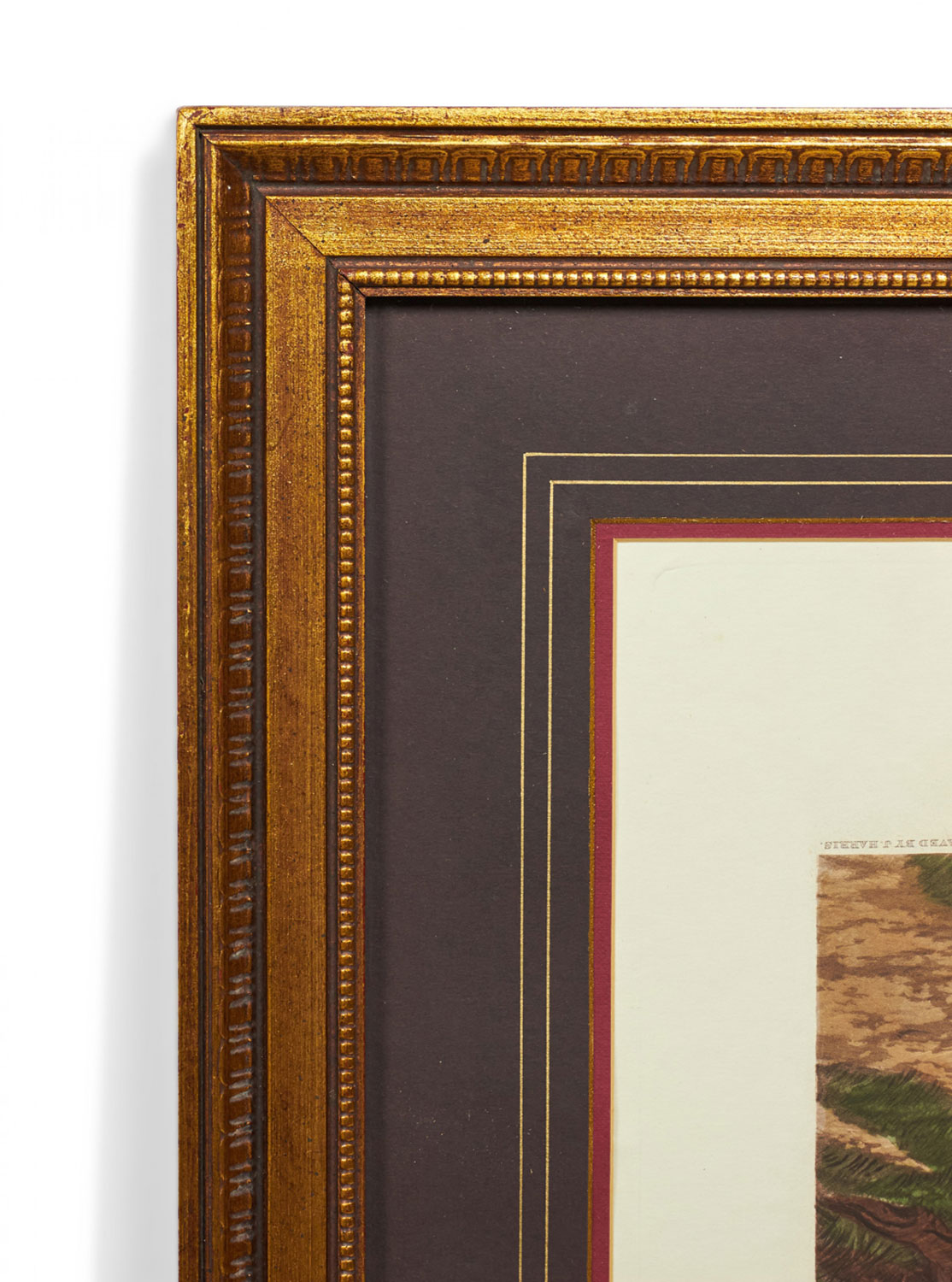 English Victorian lithograph print of a fox hunt depicting a hunter holding a captured fox aloft above a pack of hunting dogs while other huntsmen look on in a rectangular wooden frame and dark blue mat. (similar items 062902-062921).