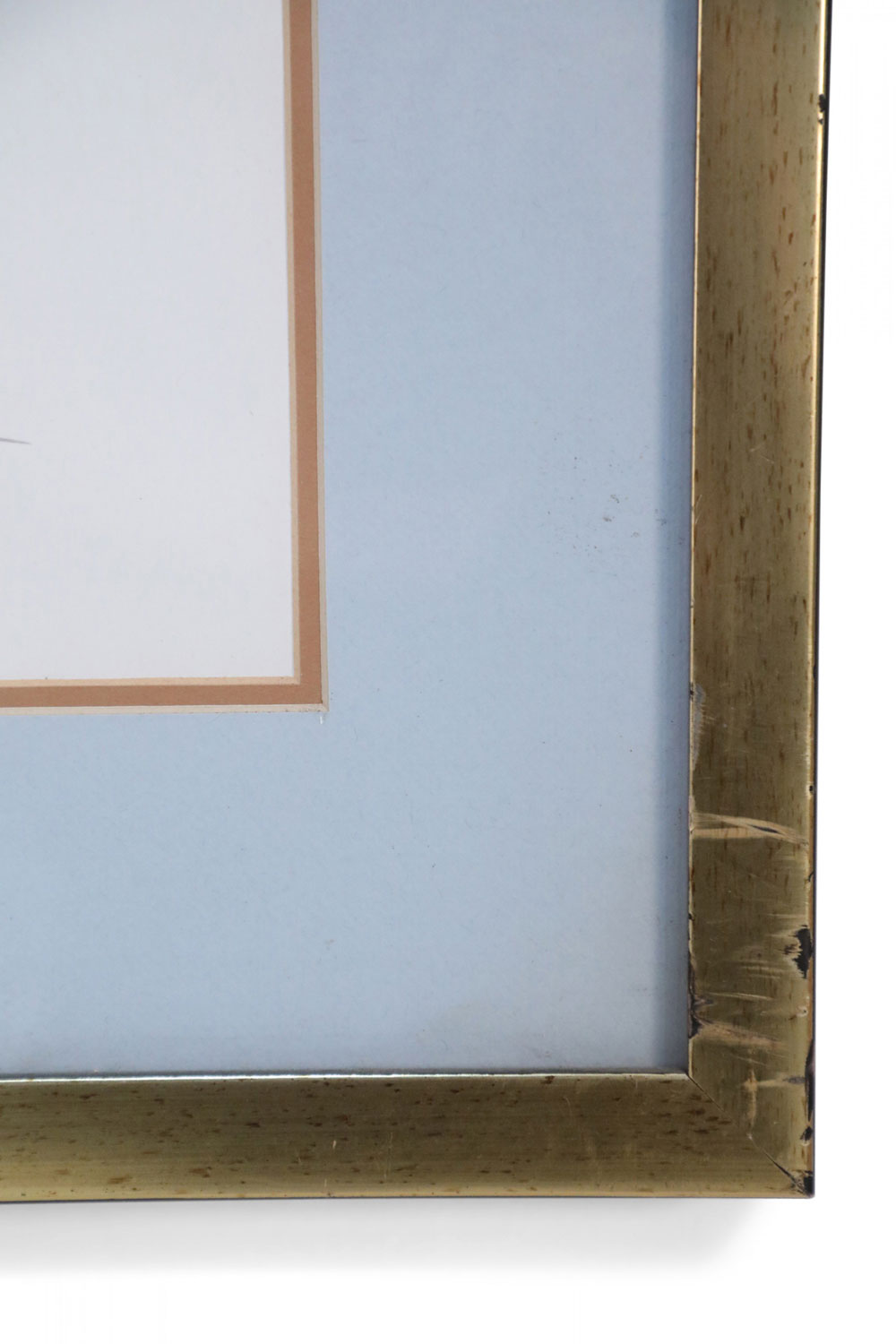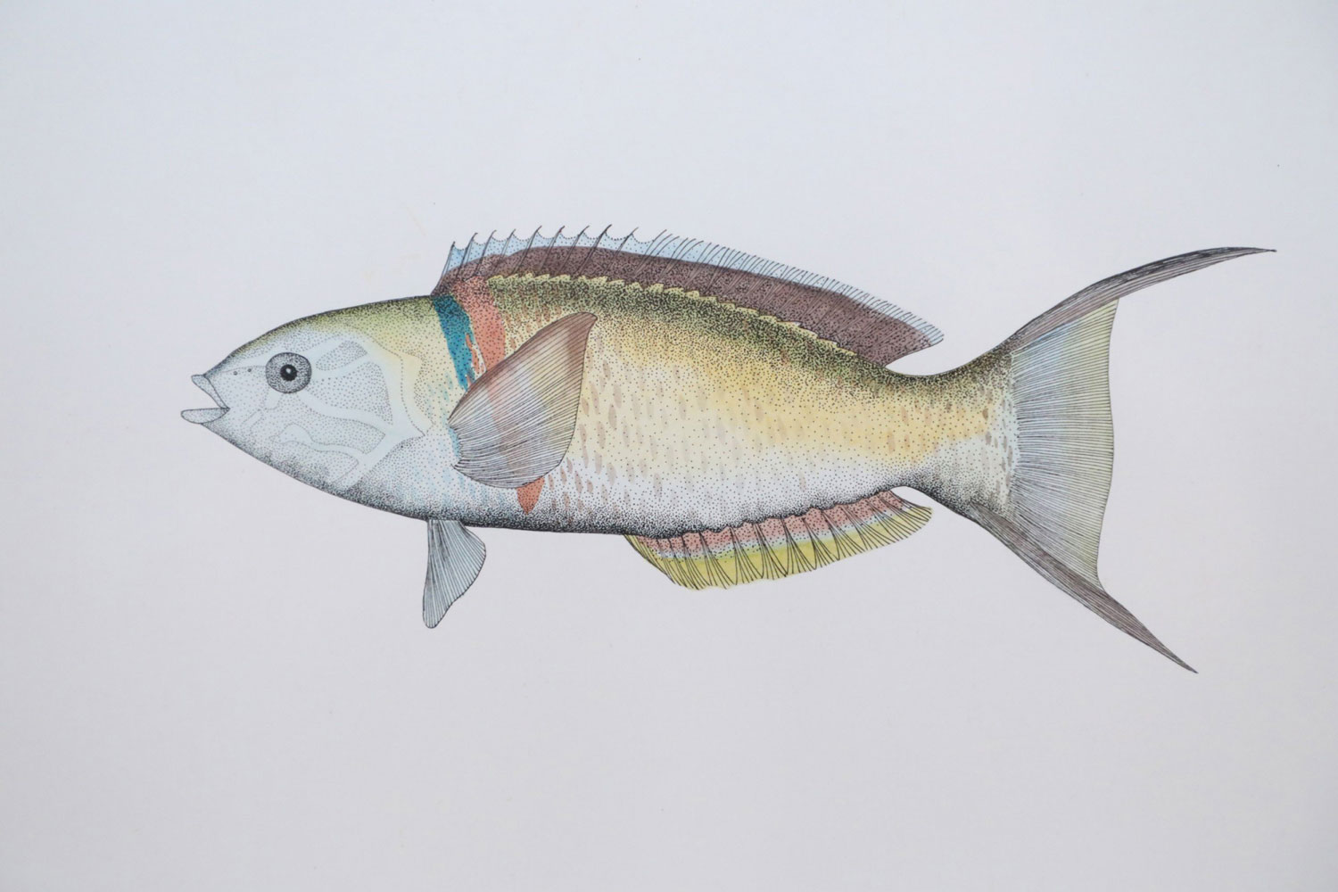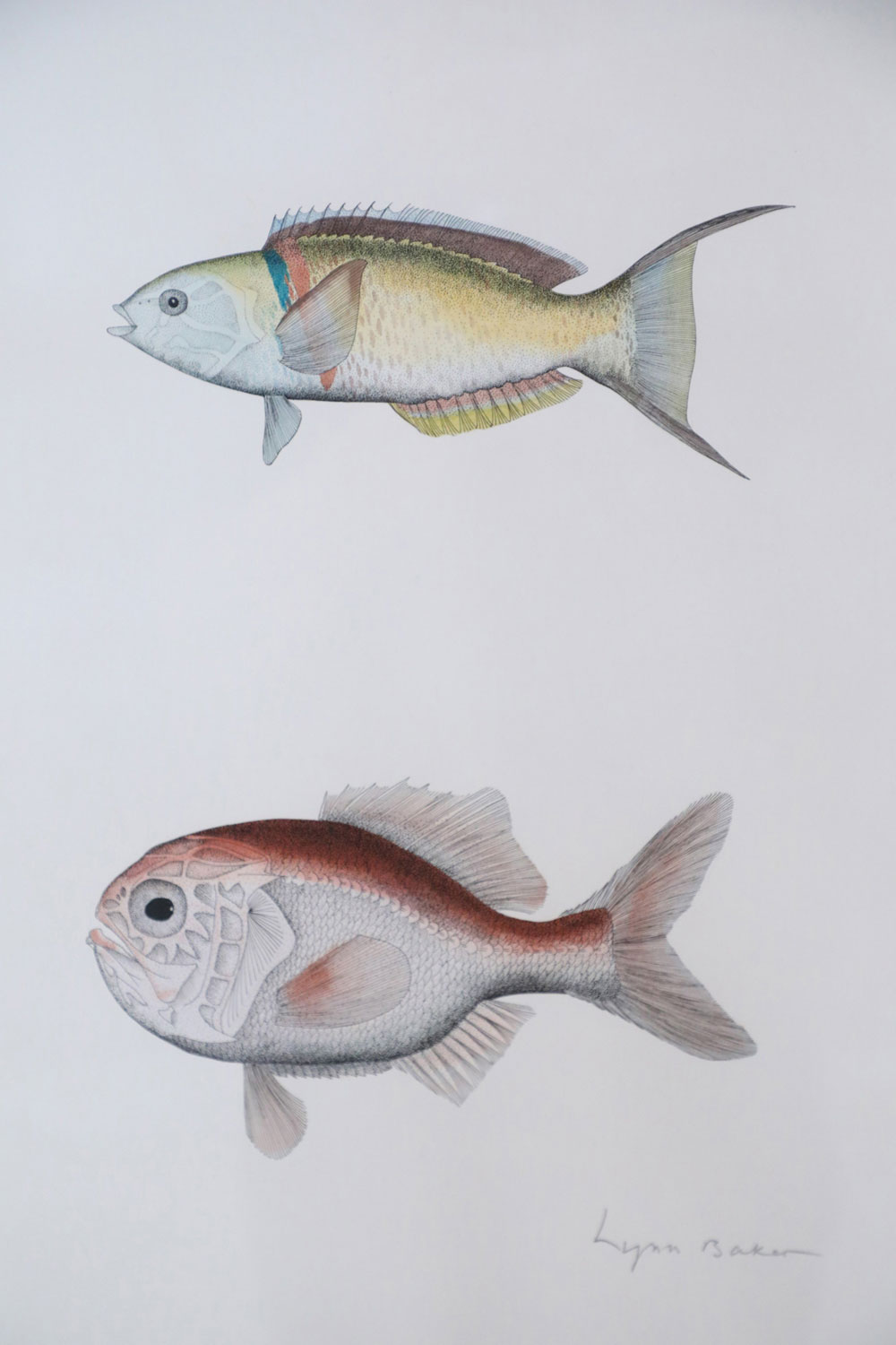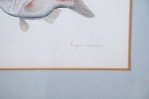 English Victorian style lithograph of two multi-colored tropical fish in profile in a taupe and light blue double mat and a rectangular silver and green frame. (signed, LYNN BAKER) (Available in green/silver frame: NWL2508)