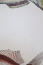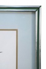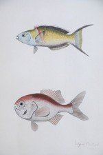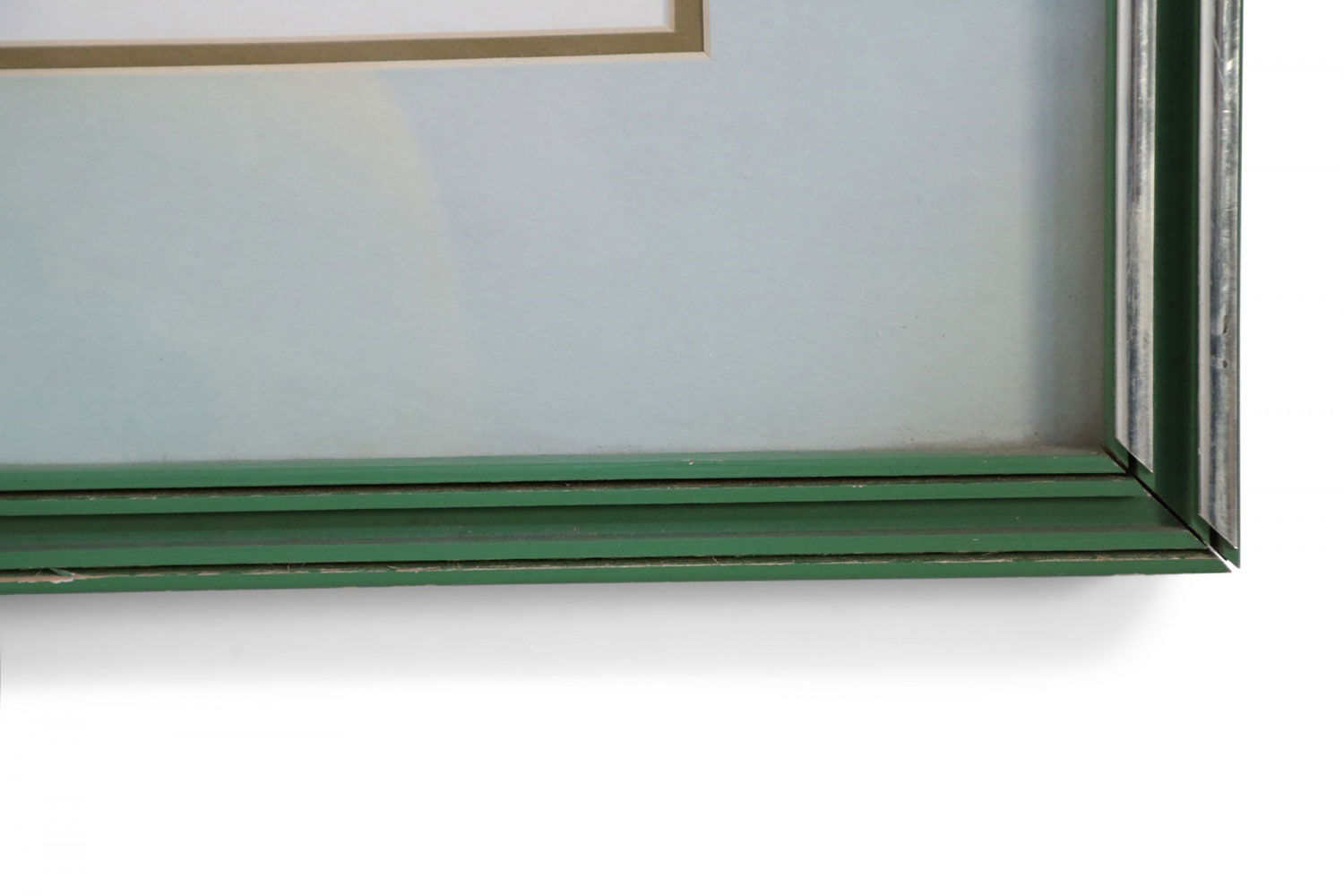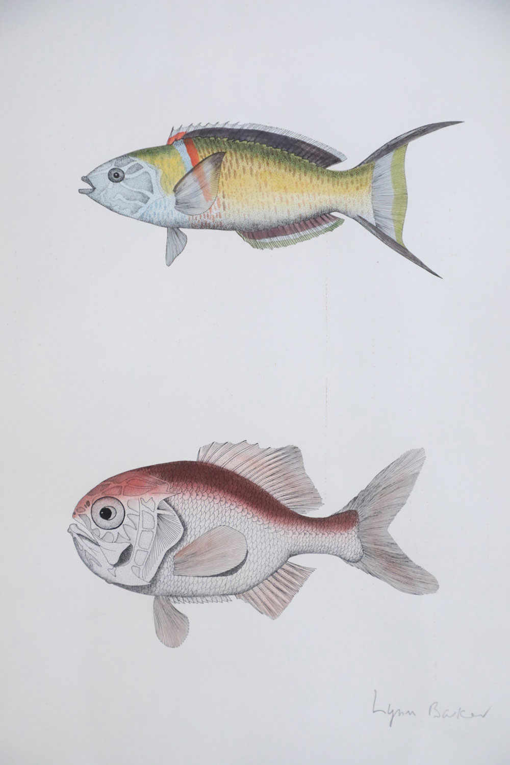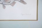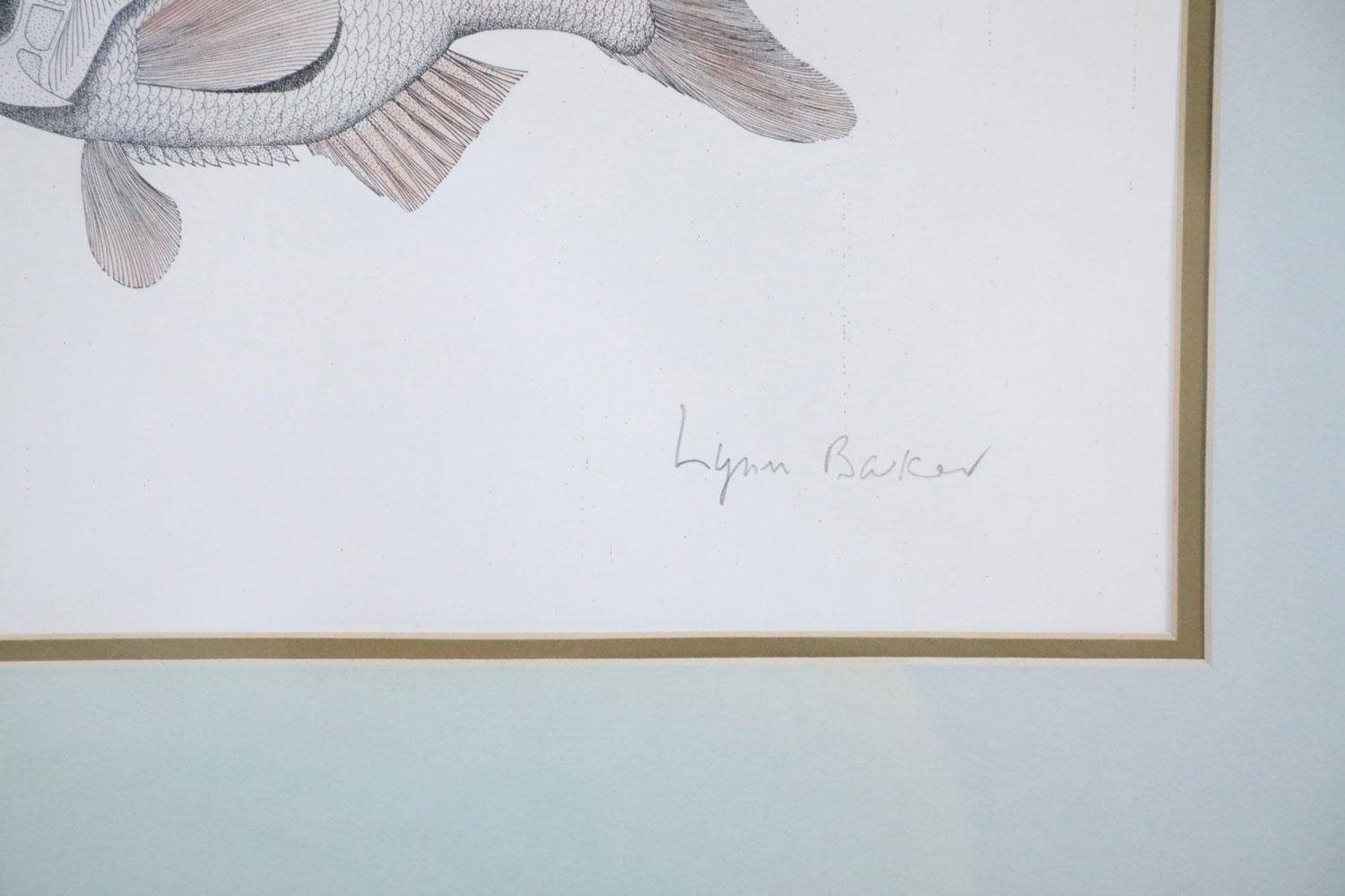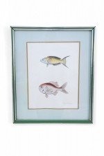 English Victorian style lithograph of two multi-colored tropical fish in profile in a taupe and light blue double mat and a rectangular silver and green frame. (signed, LYNN BAKER) (Available in gold/black frame: NWL2510, Companion piece: NWL2509)