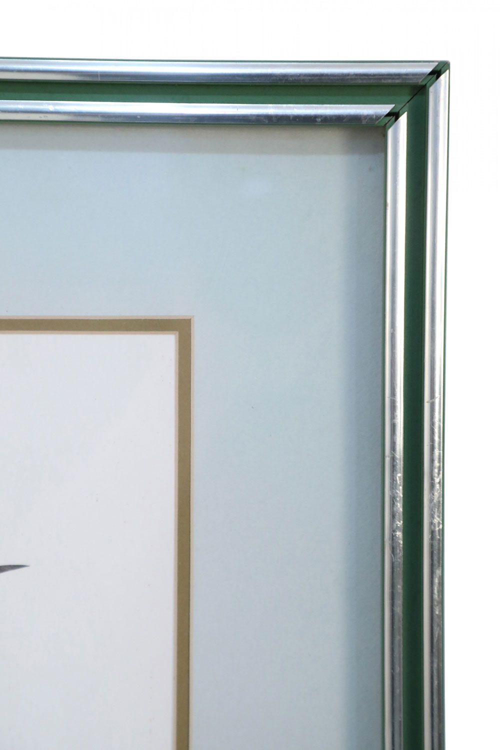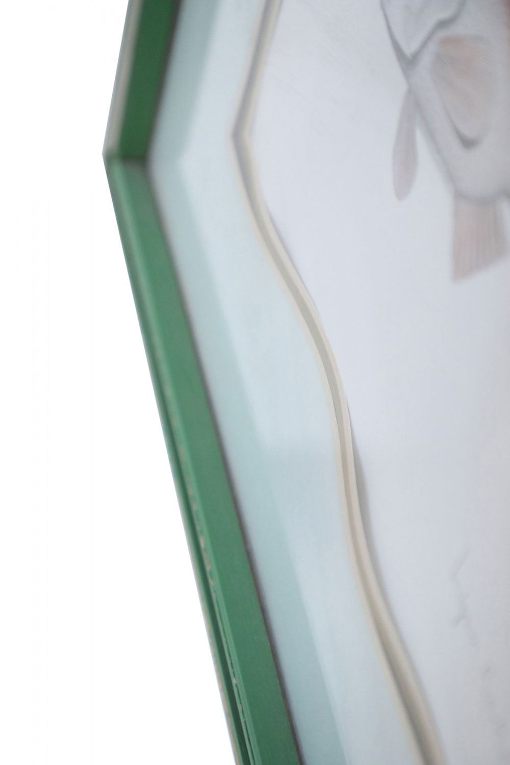 English Victorian style lithograph of two multi-colored tropical fish in profile in a taupe and light blue double mat and a rectangular silver and green frame. (signed, LYNN BAKER) (Available in gold/black frame: NWL2510, Companion piece: NWL2509).