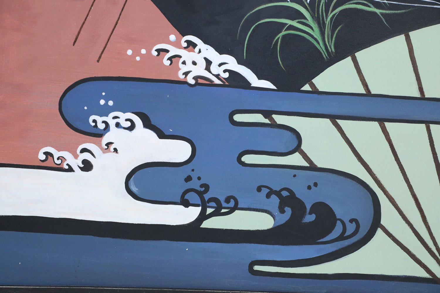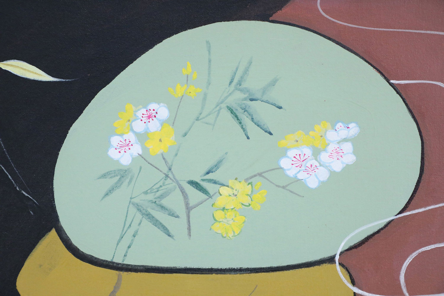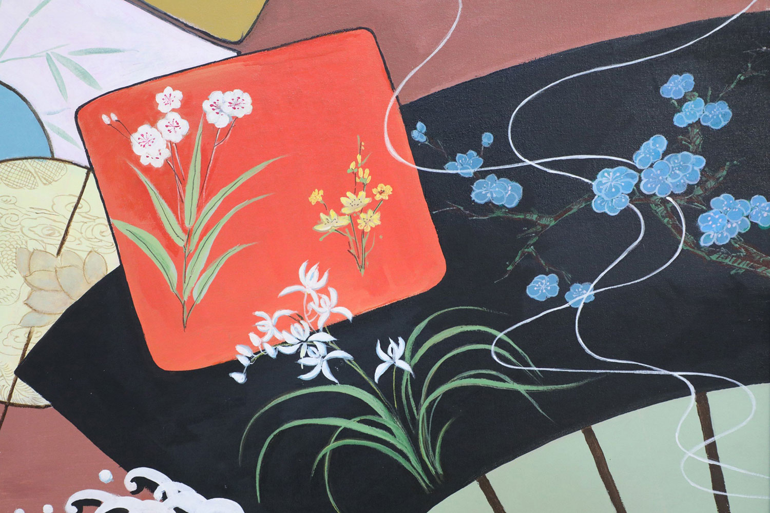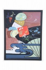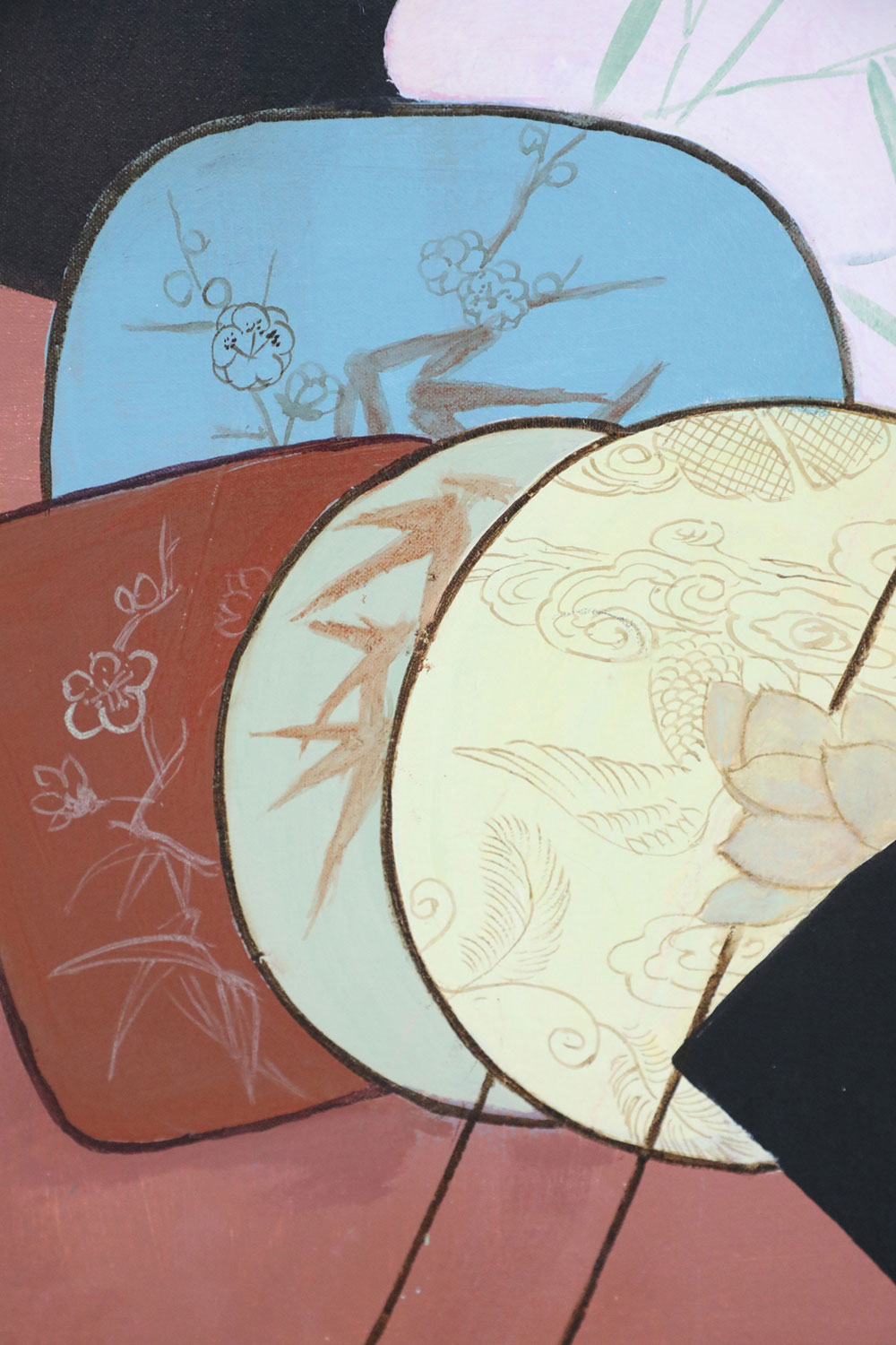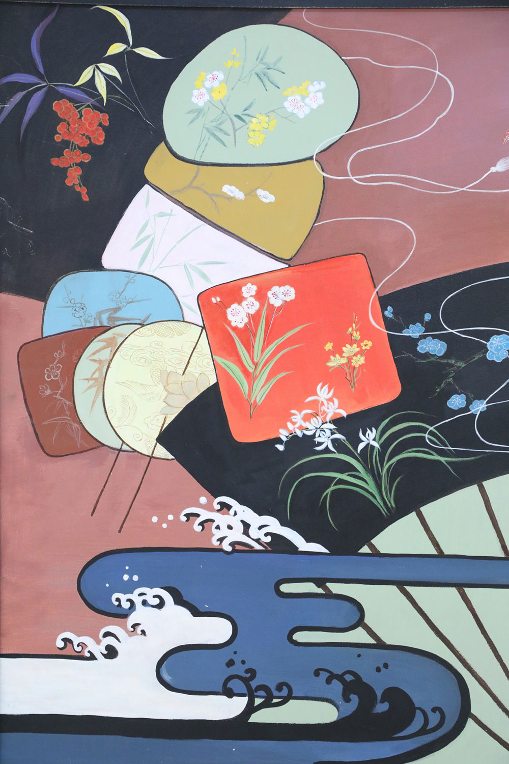 Framed Vintage Chinese Acylic Abstract Painting of Shapes, Waves, and Fans
