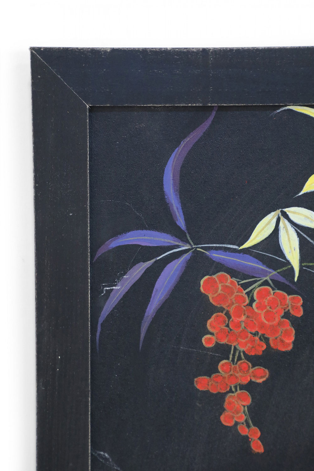 Contemporary acrylic on canvas abstract painting of black and warm toned multi-colored swirls and waves interspersed with florals, leaves, and fans in a rectangular black painted wooden frame. (Companion piece: NWL2582)