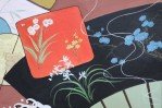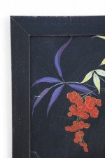 Contemporary acrylic on canvas abstract painting of black and warm toned multi-colored swirls and waves interspersed with florals, leaves, and fans in a rectangular black painted wooden frame. (Companion piece: NWL2582).