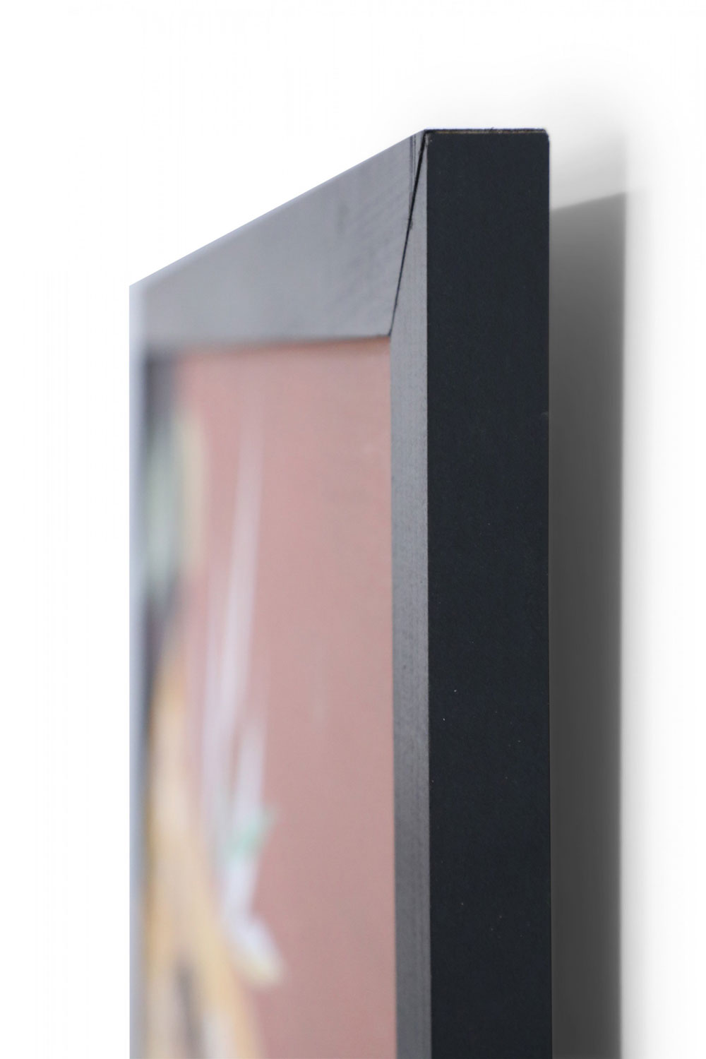 Contemporary acrylic on canvas abstract painting of black and warm toned multi-colored swirls and waves interspersed with florals, leaves, and fans in a rectangular black painted wooden frame. (Companion piece: NWL2533)