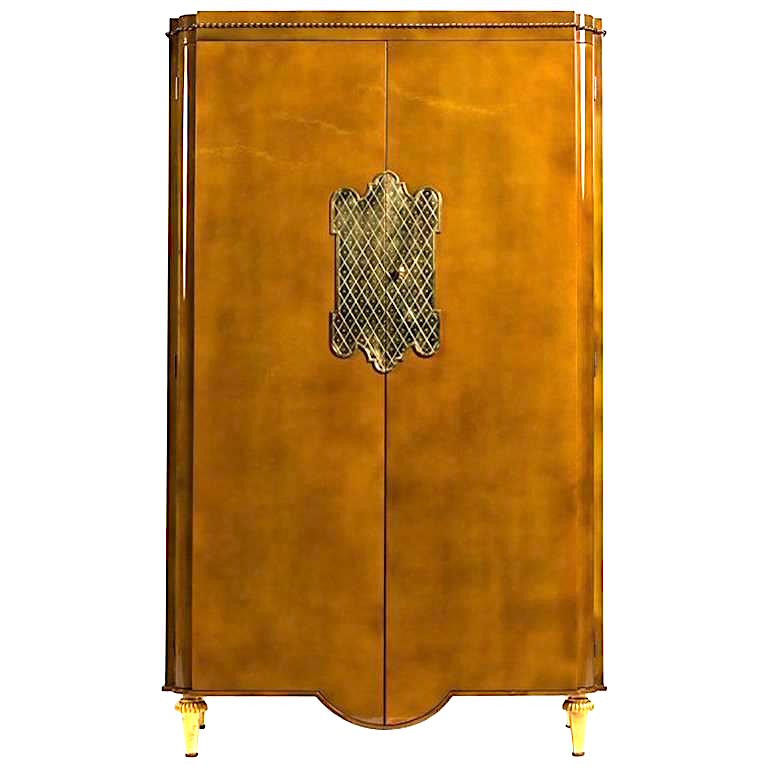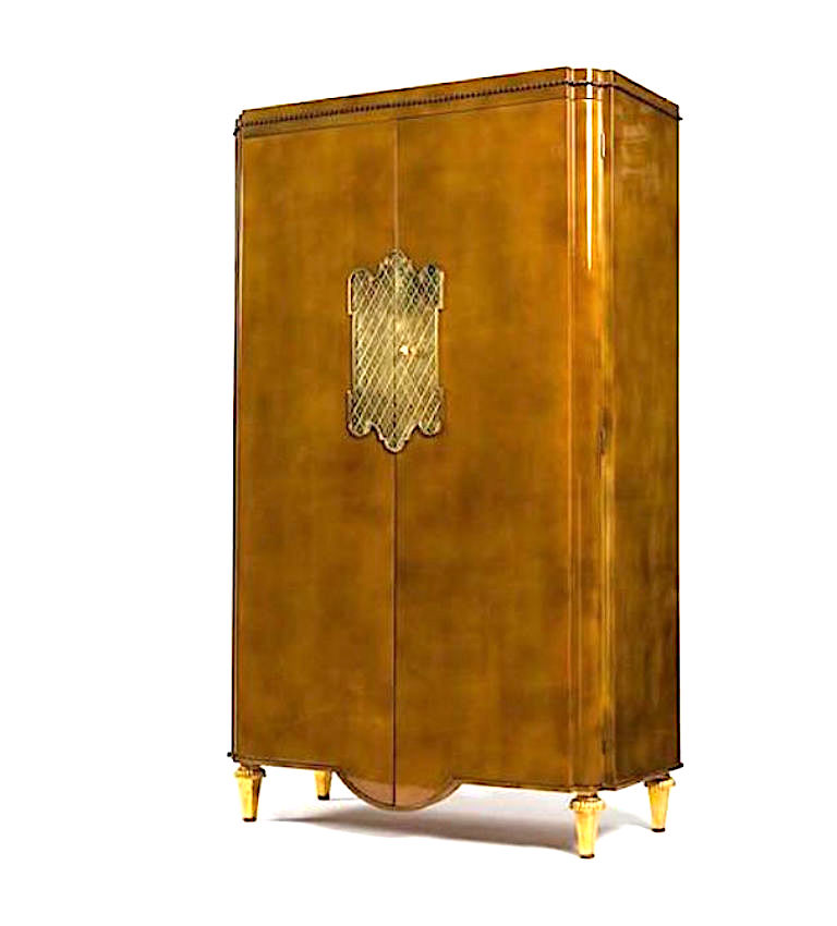 French Mid-Century light brown lacquered 2 door armoire cabinet with bronze rope trim & door lock plate on gilt cylindrical feet with a Siena marble top. (Atelier Sain et Tambute Paris) (ANDRE ARBUS - GILBERT POILLERAT) (ref: ARBUS, by Brunhammer, pg 8)