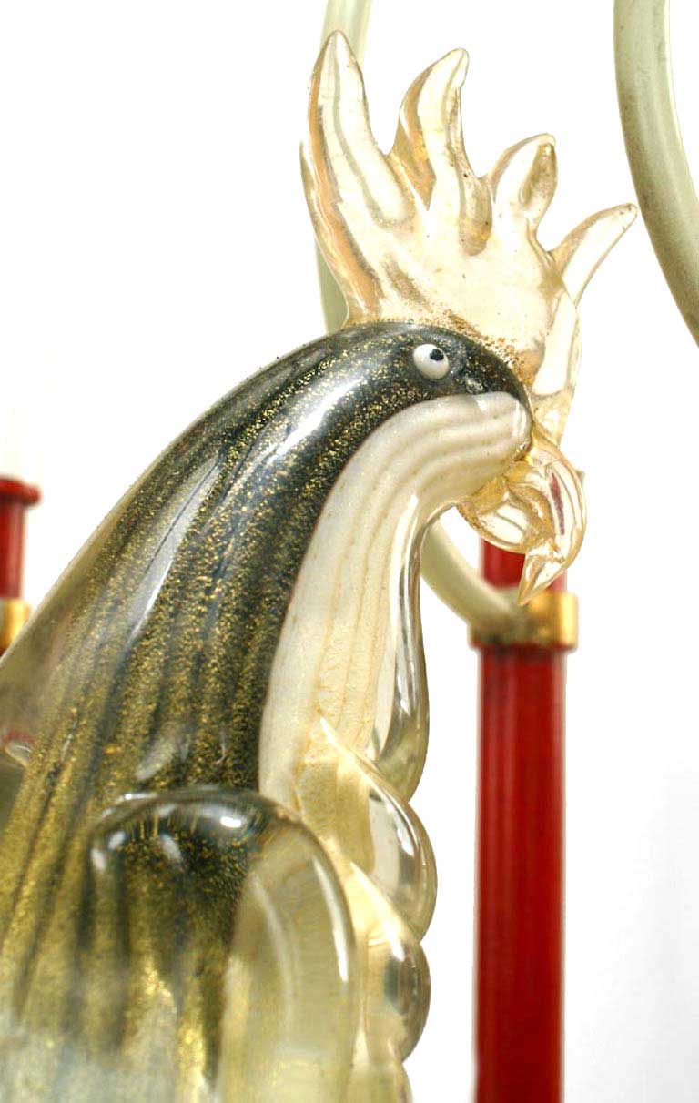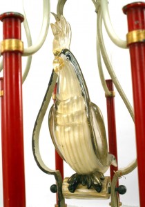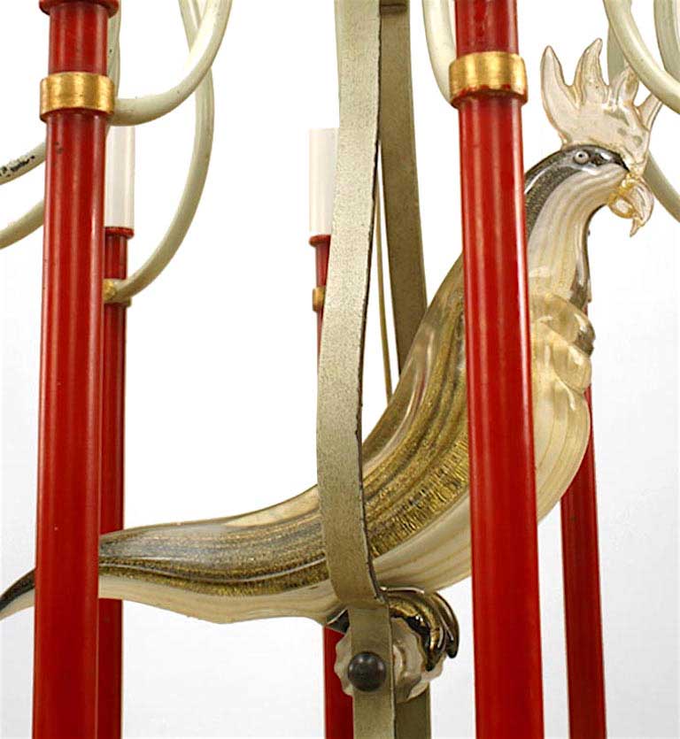 French Mid-Century (1940s) red and white painted metal 10 arm chandelier with Murano glass bird in center with canopy. (Attributed to BAGUES)