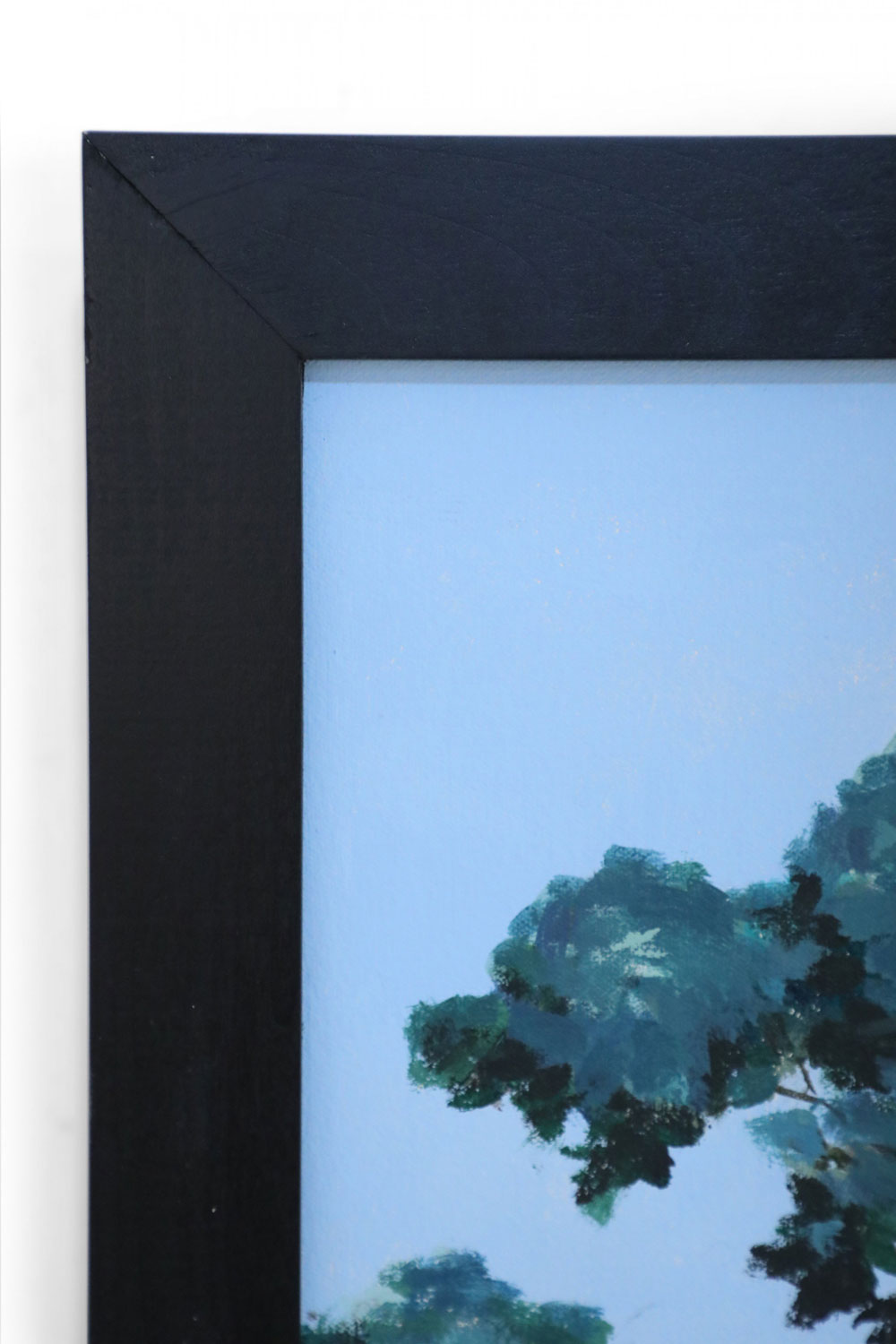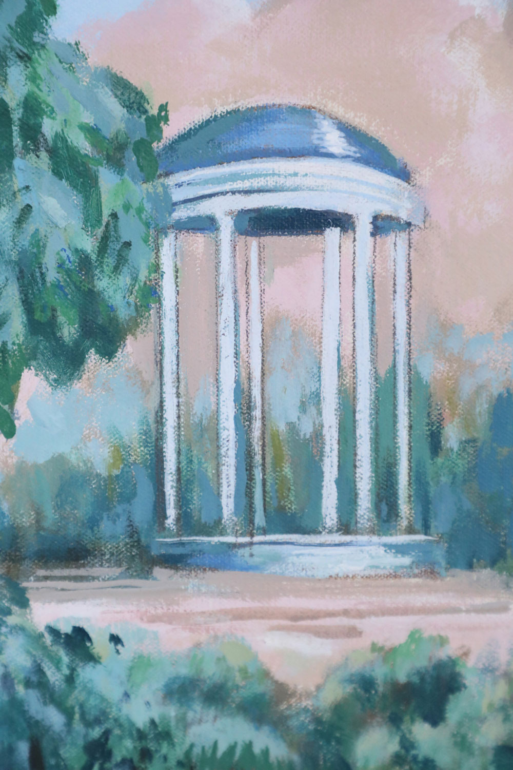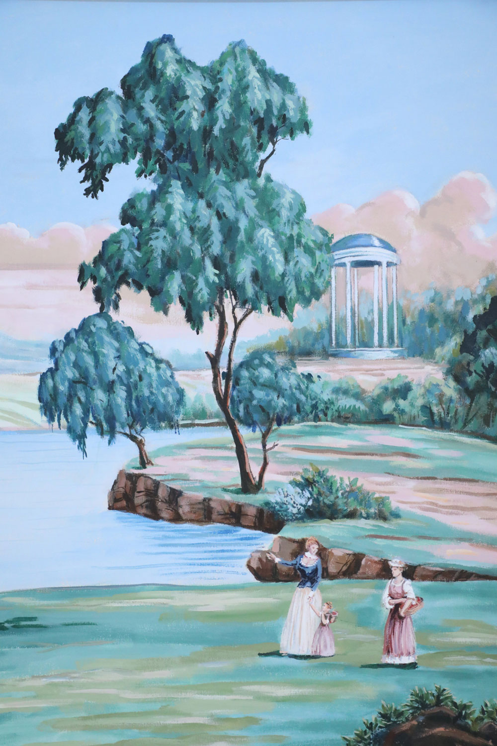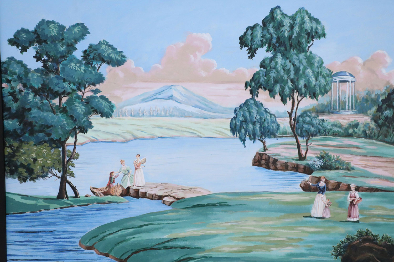 French Provincial-style (mid-20th Century) oil on canvas painting depicting a pastoral scene of women and children next to a lake with mountains and a gazebo in the distance in a rectangular black painted wooden frame..
