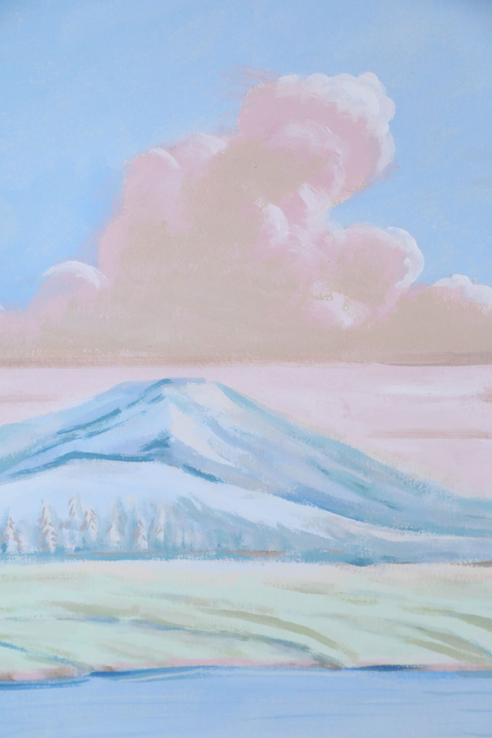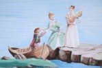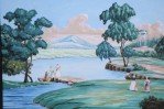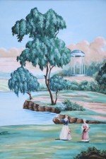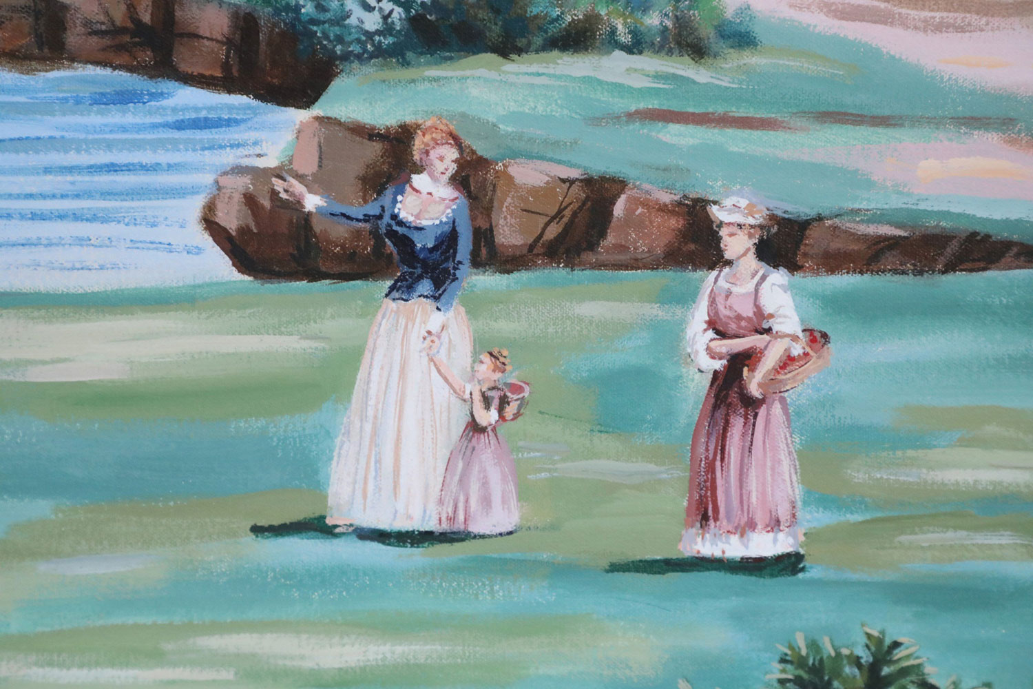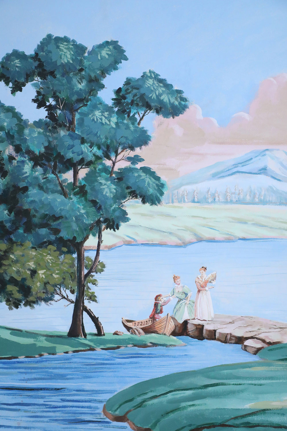 French Provincial-style (mid-20th Century) oil on canvas painting depicting a pastoral scene of women and children next to a lake with mountains and a gazebo in the distance in a rectangular black painted wooden frame.