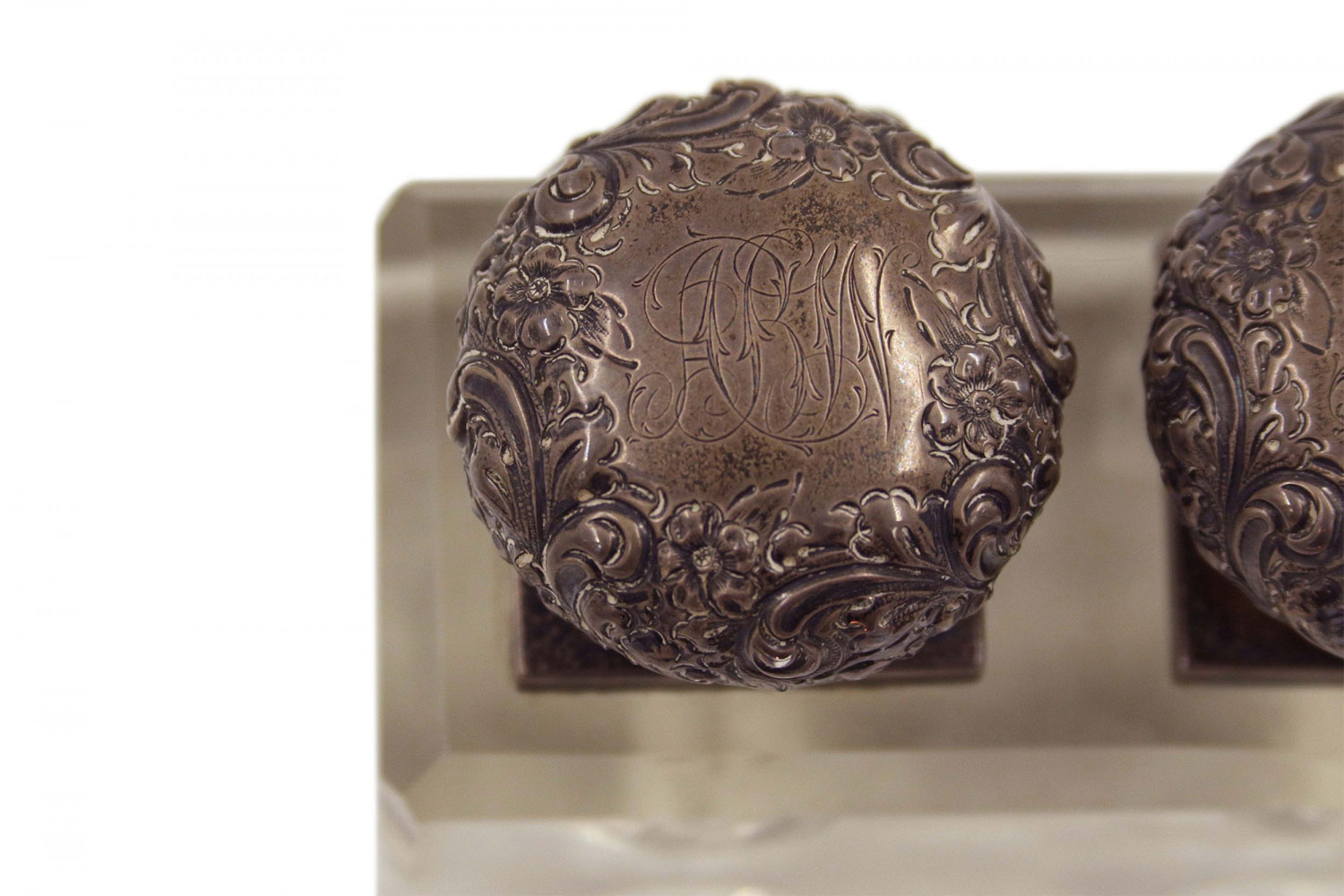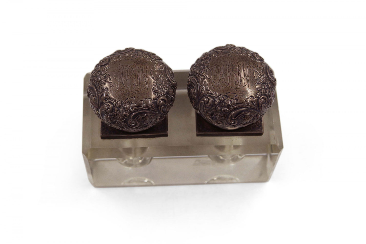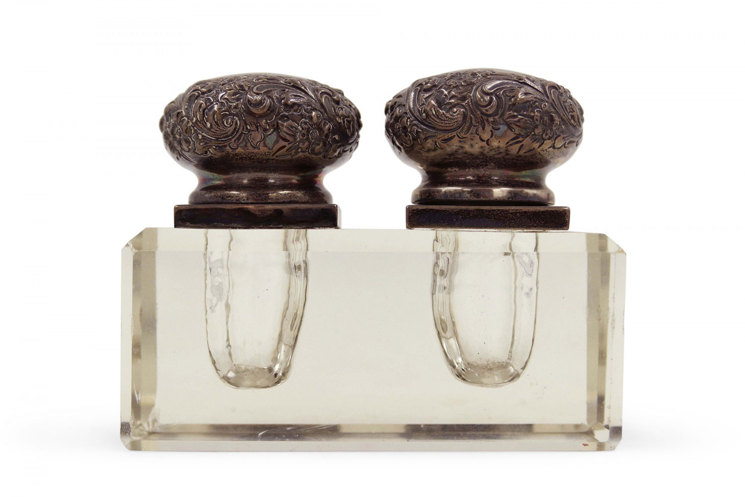 French Victorian rectangular double glass inkwell with incised monogrammed sterling silver hinged lids. (Hallmarked)