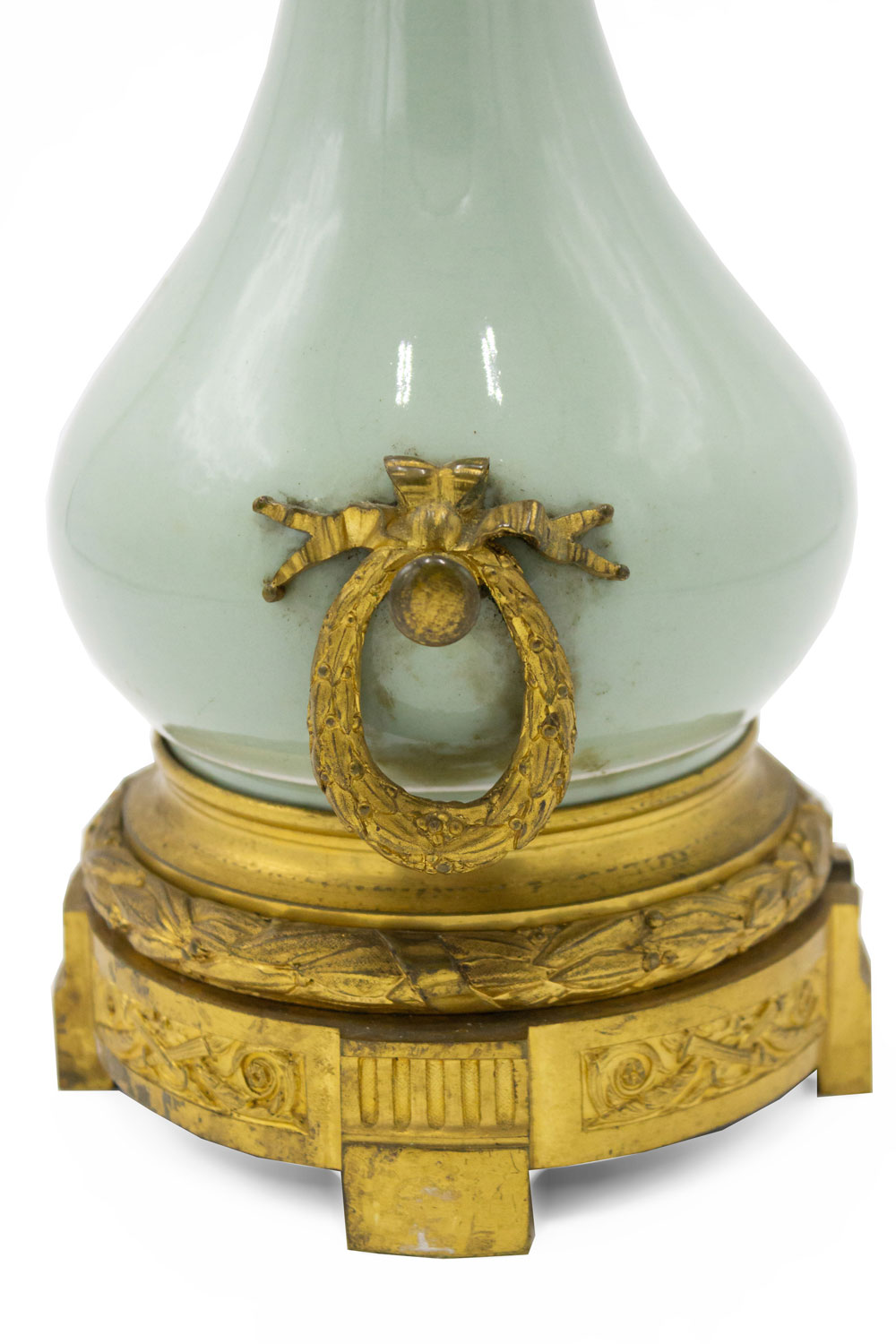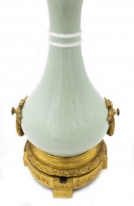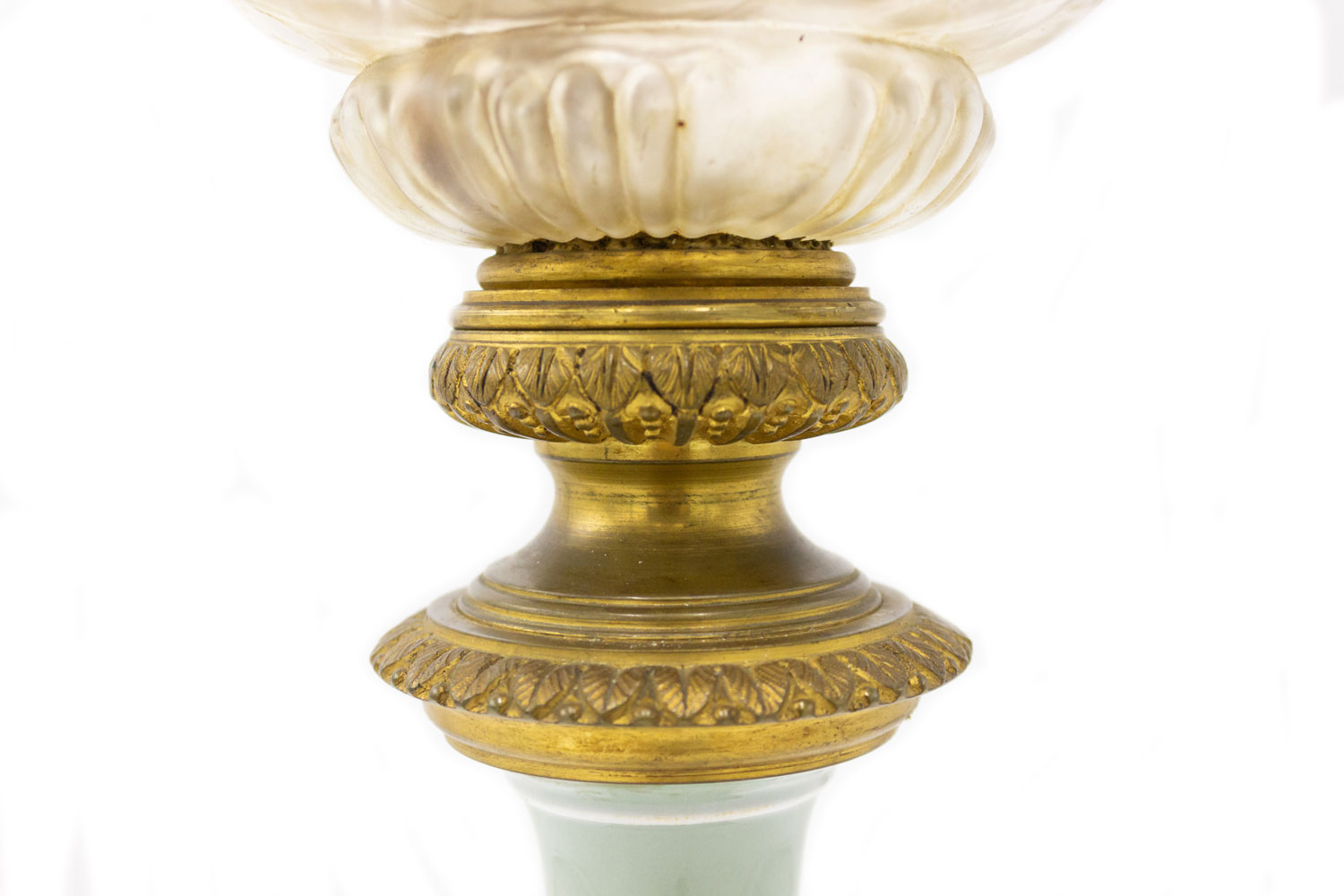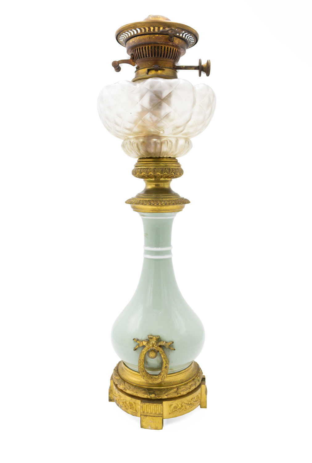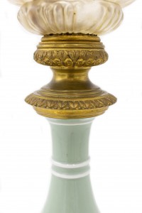 French Victorian celadon porcelain oil lamp with gilt metal mounts supporting a frosted glass fount (over an etched glass bowl and centered hurricane shade-no shown)