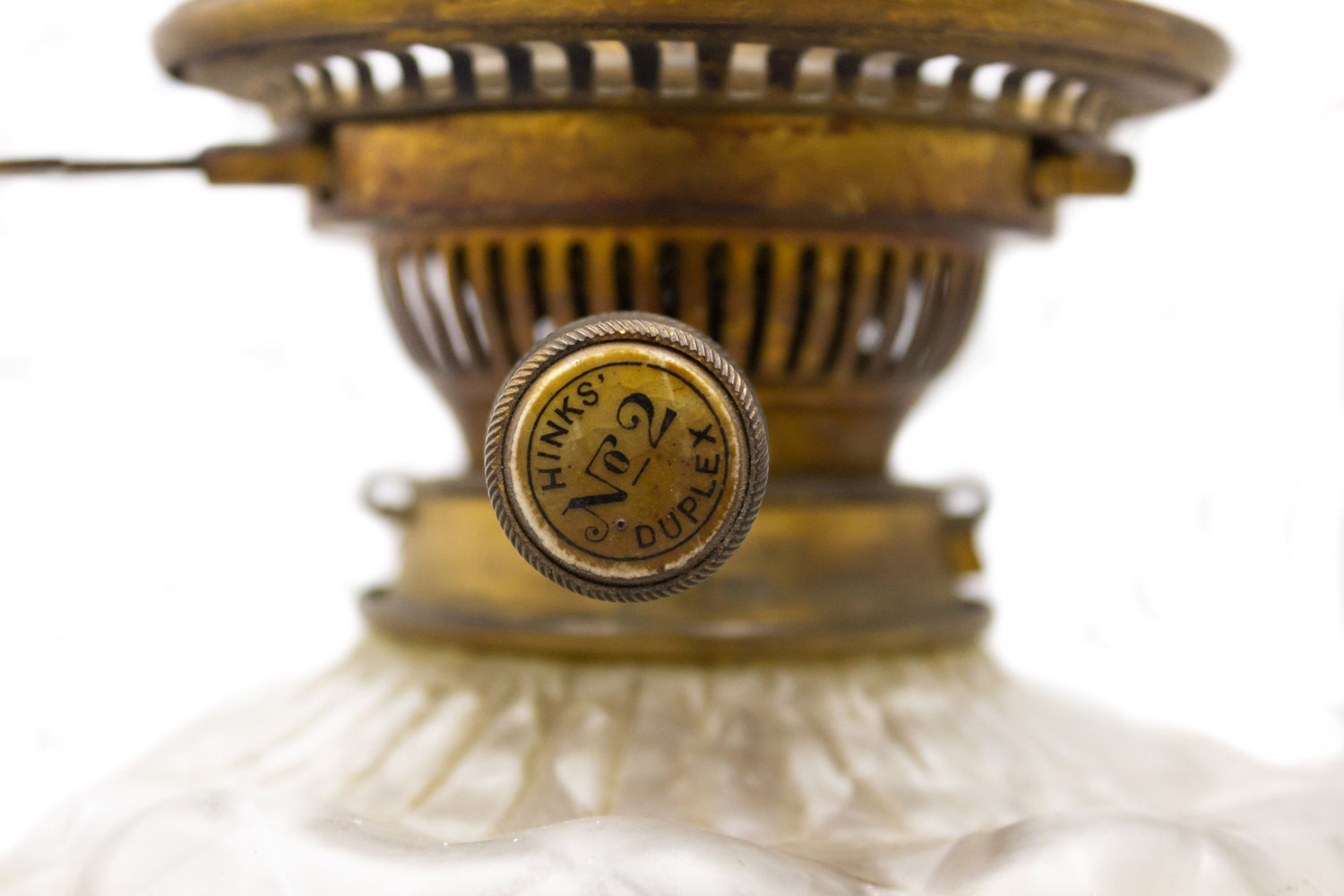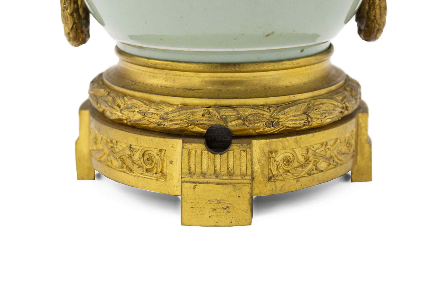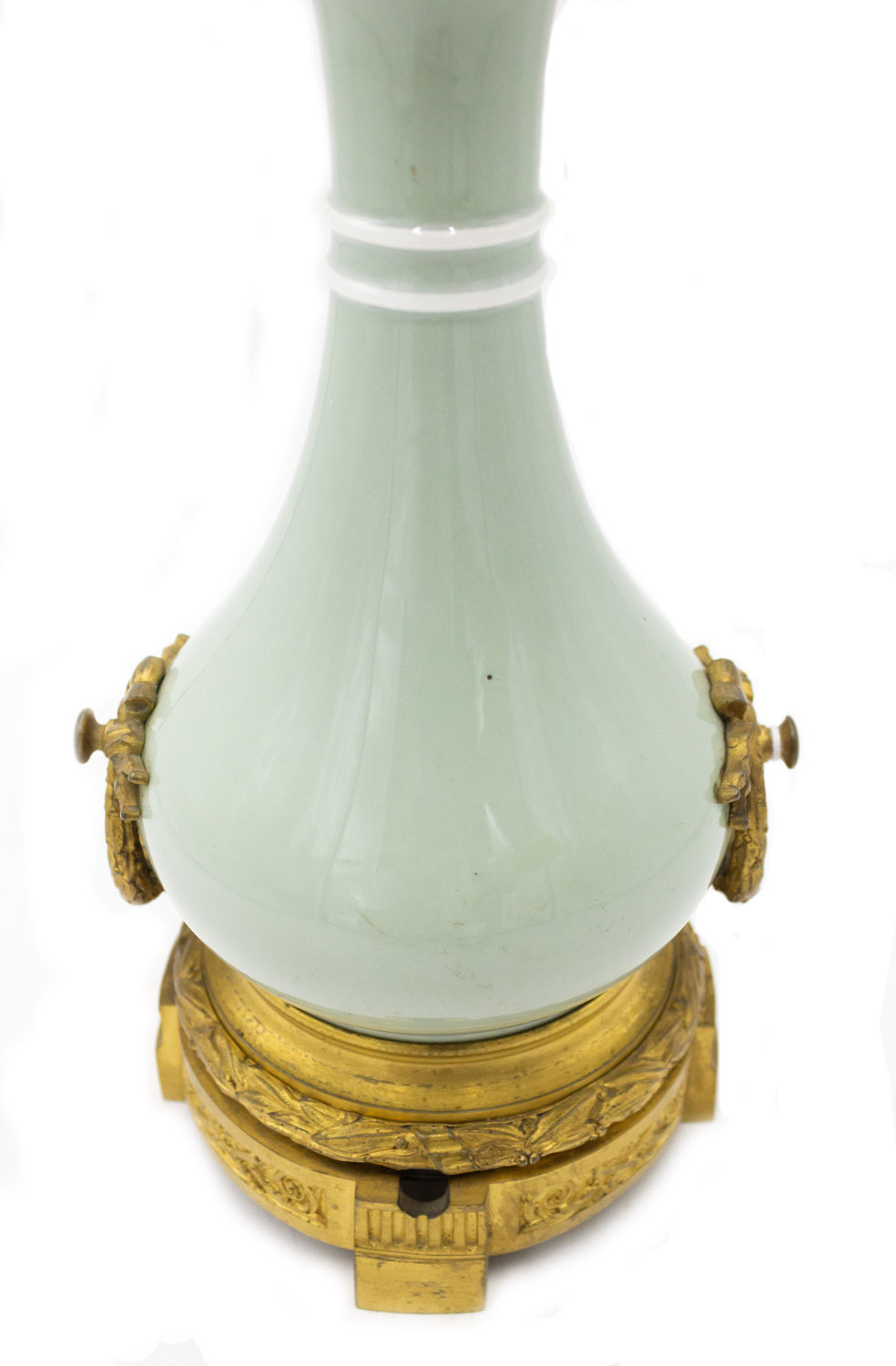 French Victorian celadon porcelain oil lamp with gilt metal mounts supporting a frosted glass fount (over an etched glass bowl and centered hurricane shade-no shown)