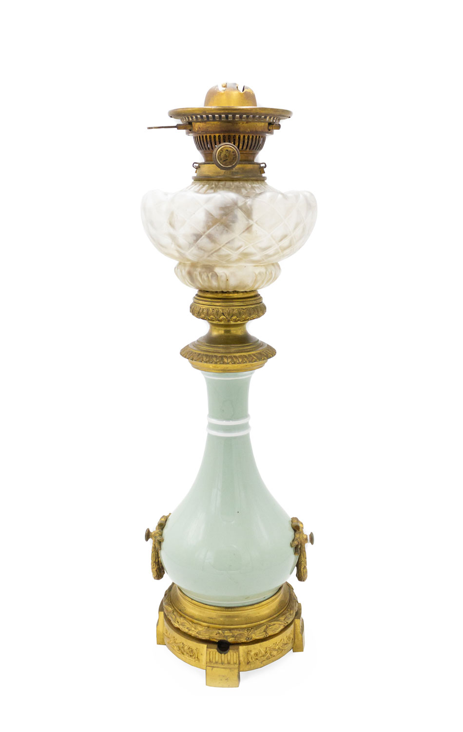 French Victorian celadon porcelain oil lamp with gilt metal mounts supporting a frosted glass fount (over an etched glass bowl and centered hurricane shade-no shown).