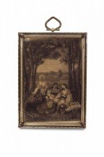 French (19th Century) engraving a genre scene of women sitting in the woods encased in a silver picture frame with velvet back..