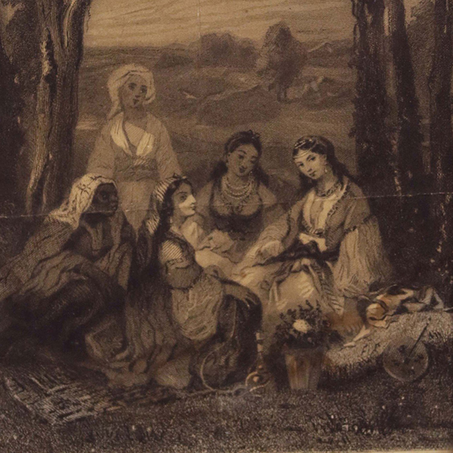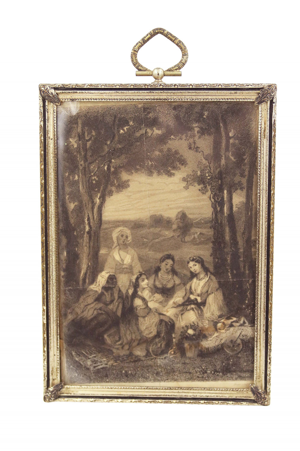 French Victorian Silver Framed Engraving of Women Having a Picnic
