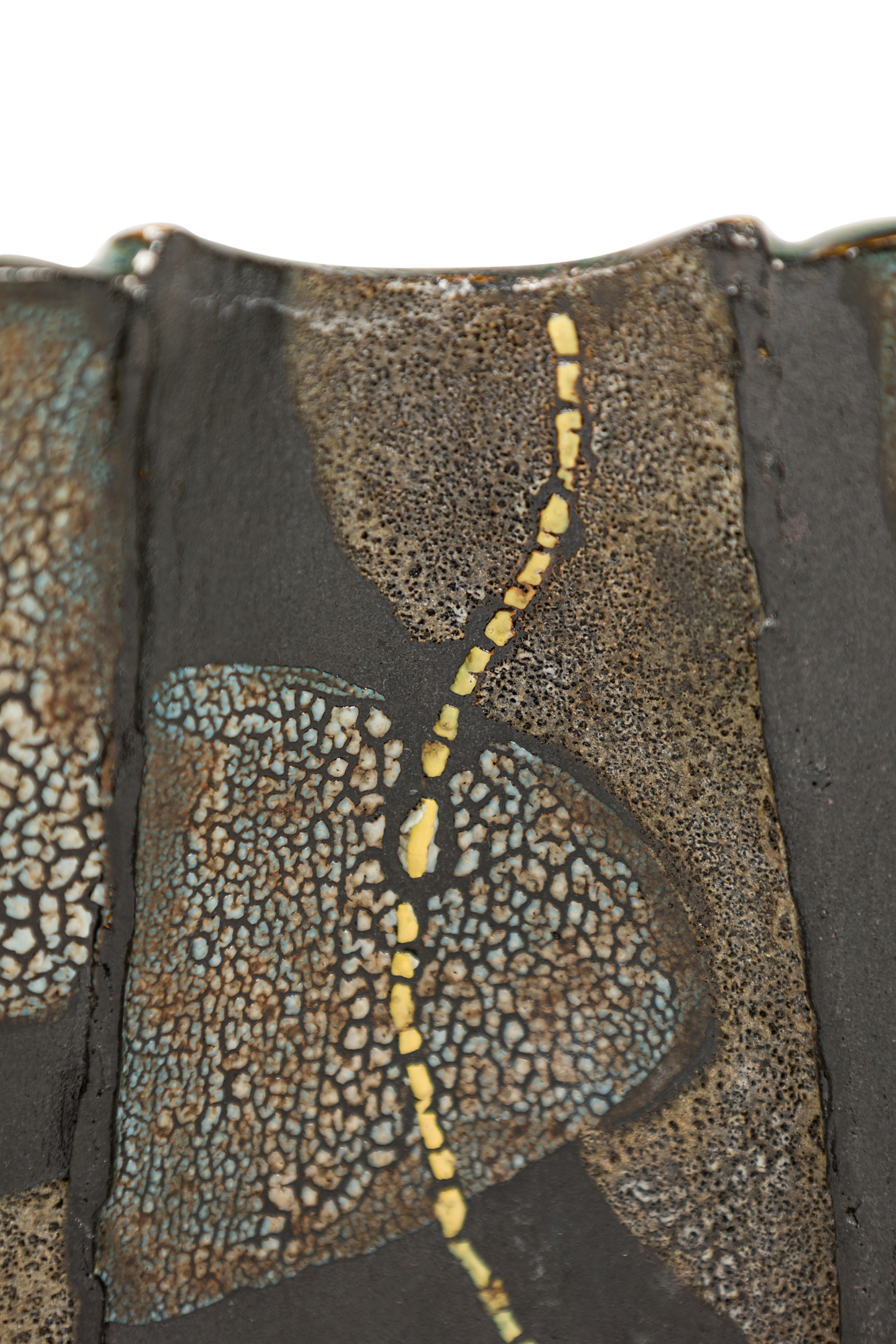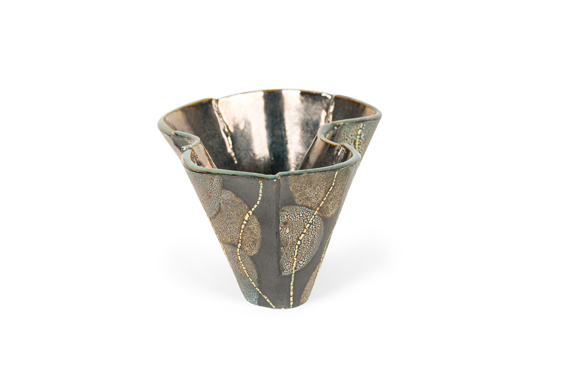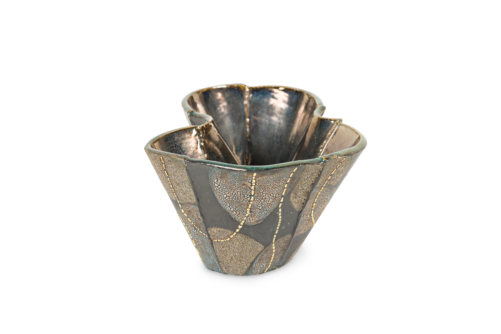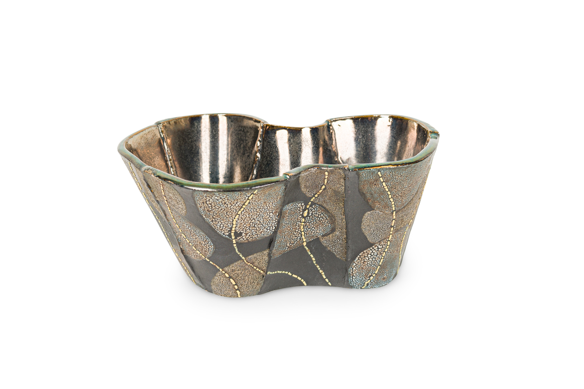 Gary DiPasquale Contemporary Low Asymmetrical Wavy Vessel with Black, White and Grey Textured Glaze and Abstract Yellow Lines.