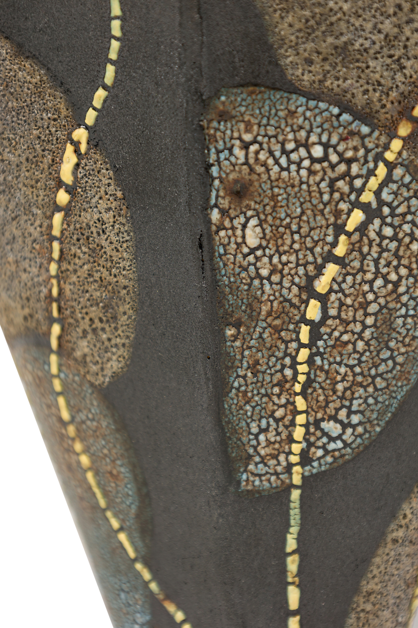 Gary DiPasquale Contemporary Low Asymmetrical Wavy Vessel with Black, White and Grey Textured Glaze and Abstract Yellow Lines