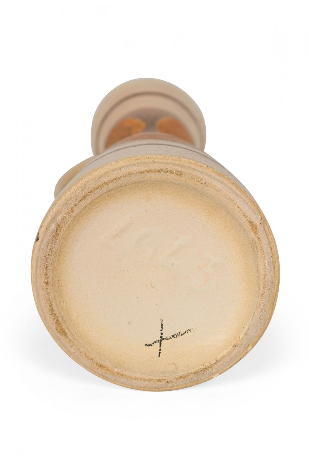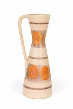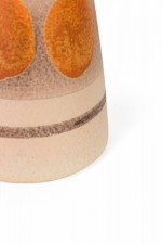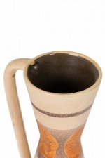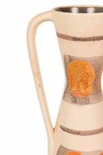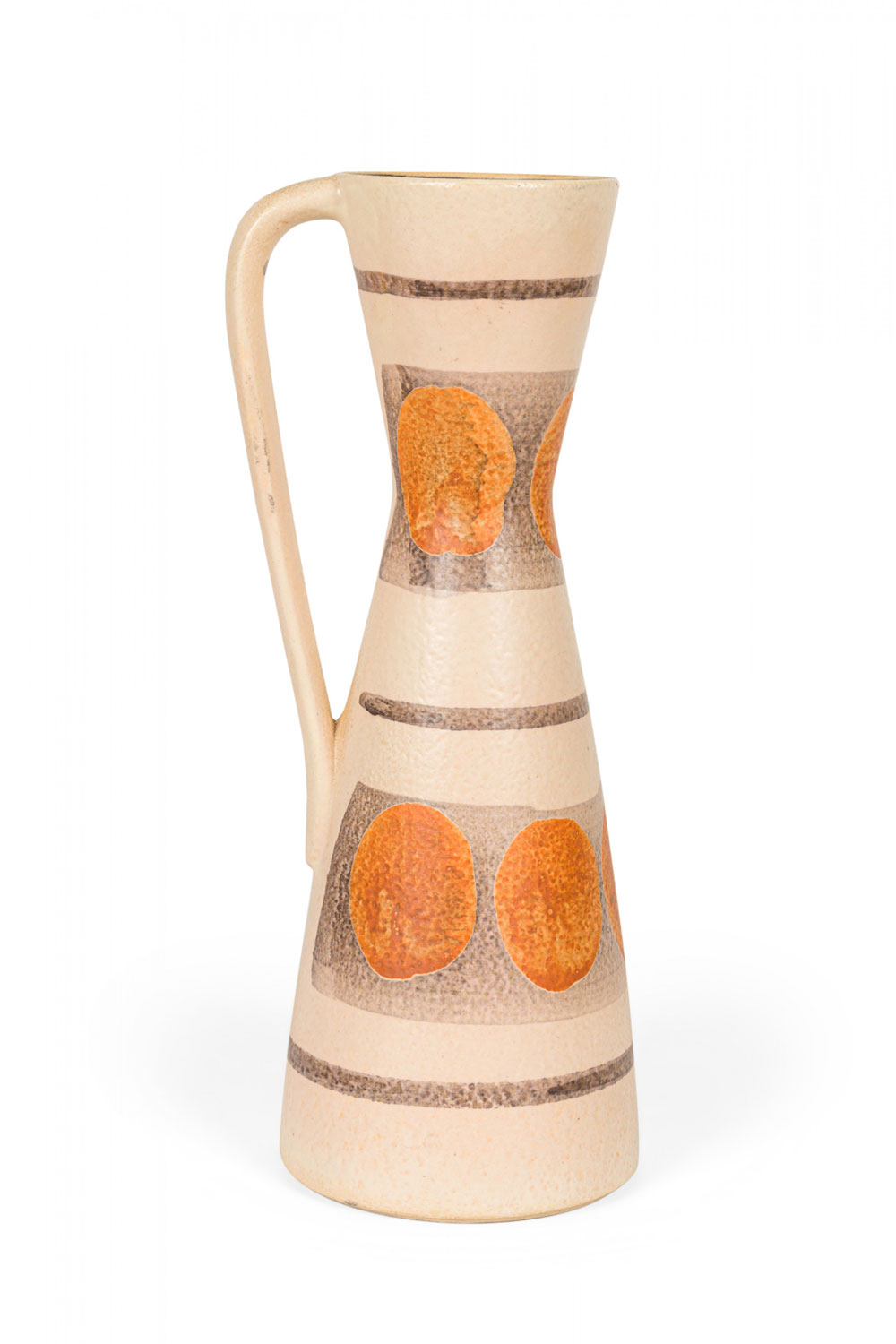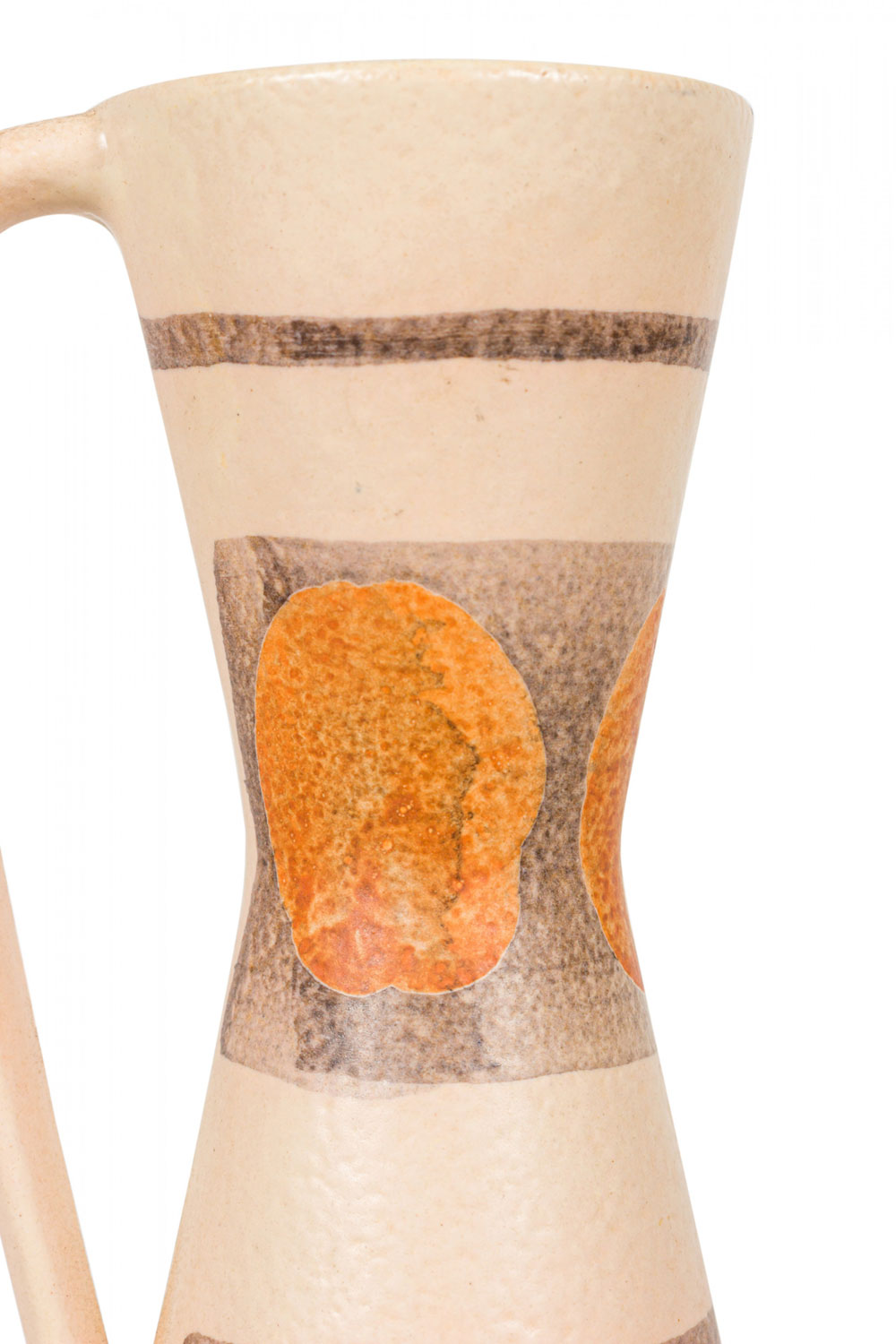 German Mid-Century hourglass-form handled ceramic vase with a horizontal brown line and orange and gray geometric banded pattern against a beige glazed ground. (mark on bottom, 4043)(Similar piece: 063154)