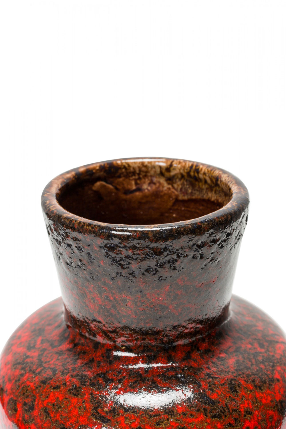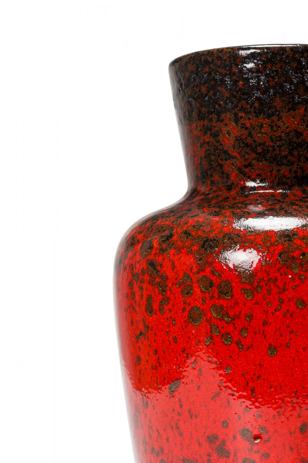 German Mid-Century ceramic urn-form vase with an extended flared mouth and a red and black fat lava-style glaze..