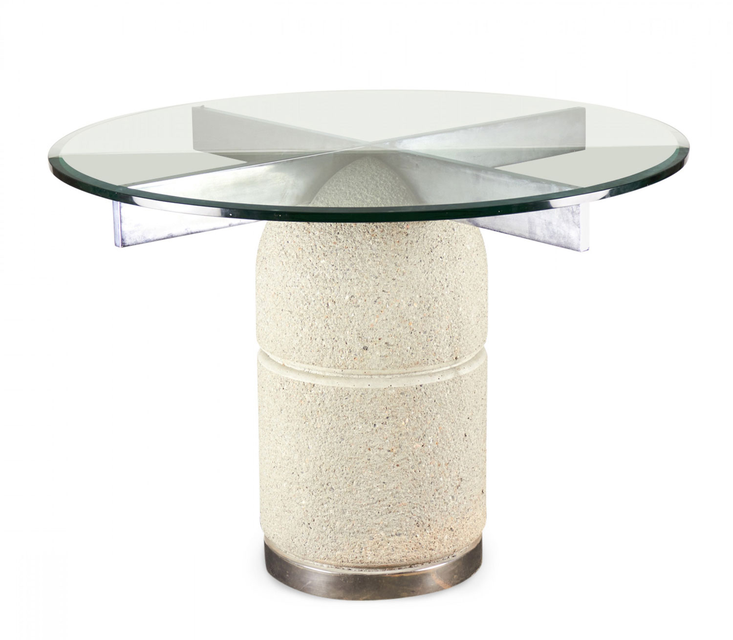 Italian Mid-Century (circa 1979) 'Paracarro' circular dining / center table with a textured concrete plinth base with an inset polished chrome support beneath a circular clear plate glass top. (GIOVANNI OFFREDI FOR SAPORITI).