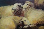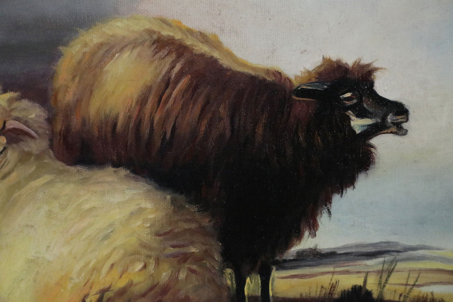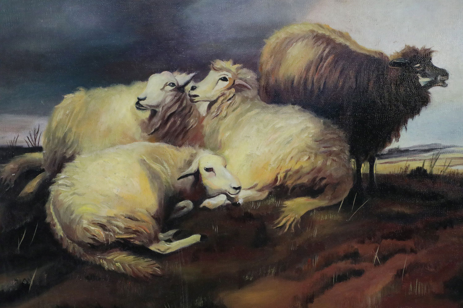 English Victorian style (20th Century) oil painting capturing a group of sheep huddled in a field of browns and greens, under a cloudy, darkening sky on rectangular, unframed canvas (Similar copies of same piece with minor variations: NWL2263A, NWL2263B).
