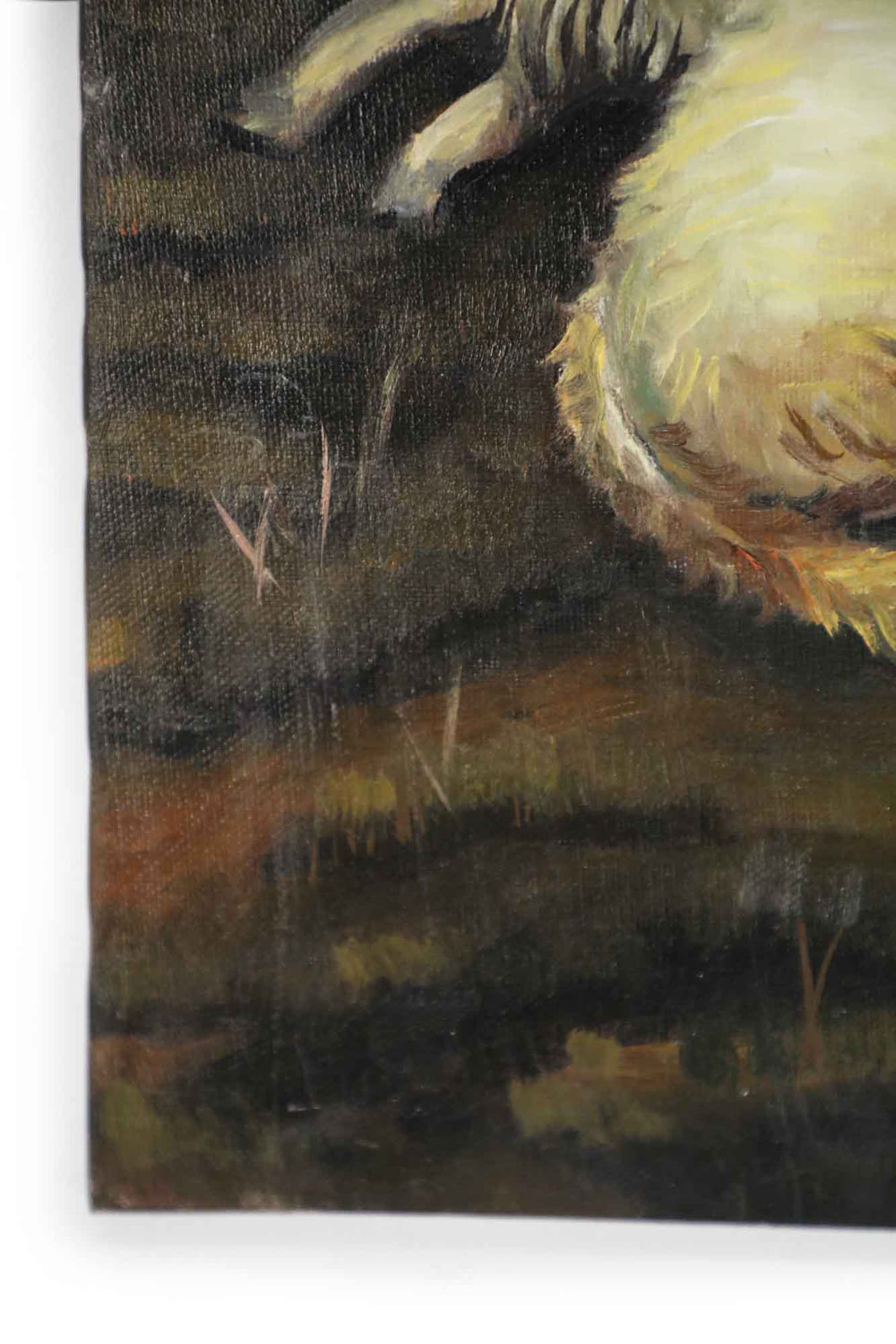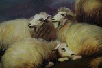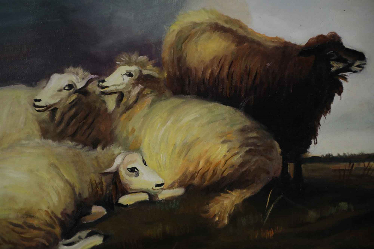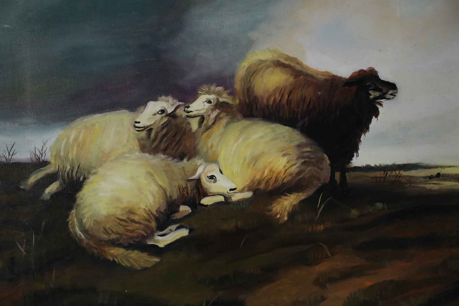 English Victorian style (20th Century) oil painting capturing a group of sheep huddled in a field of browns and greens, under a cloudy, darkening sky on rectangular, unframed canvas (Similar copies of same piece with minor variations: NWL2263B, NWL2263C)..