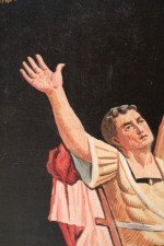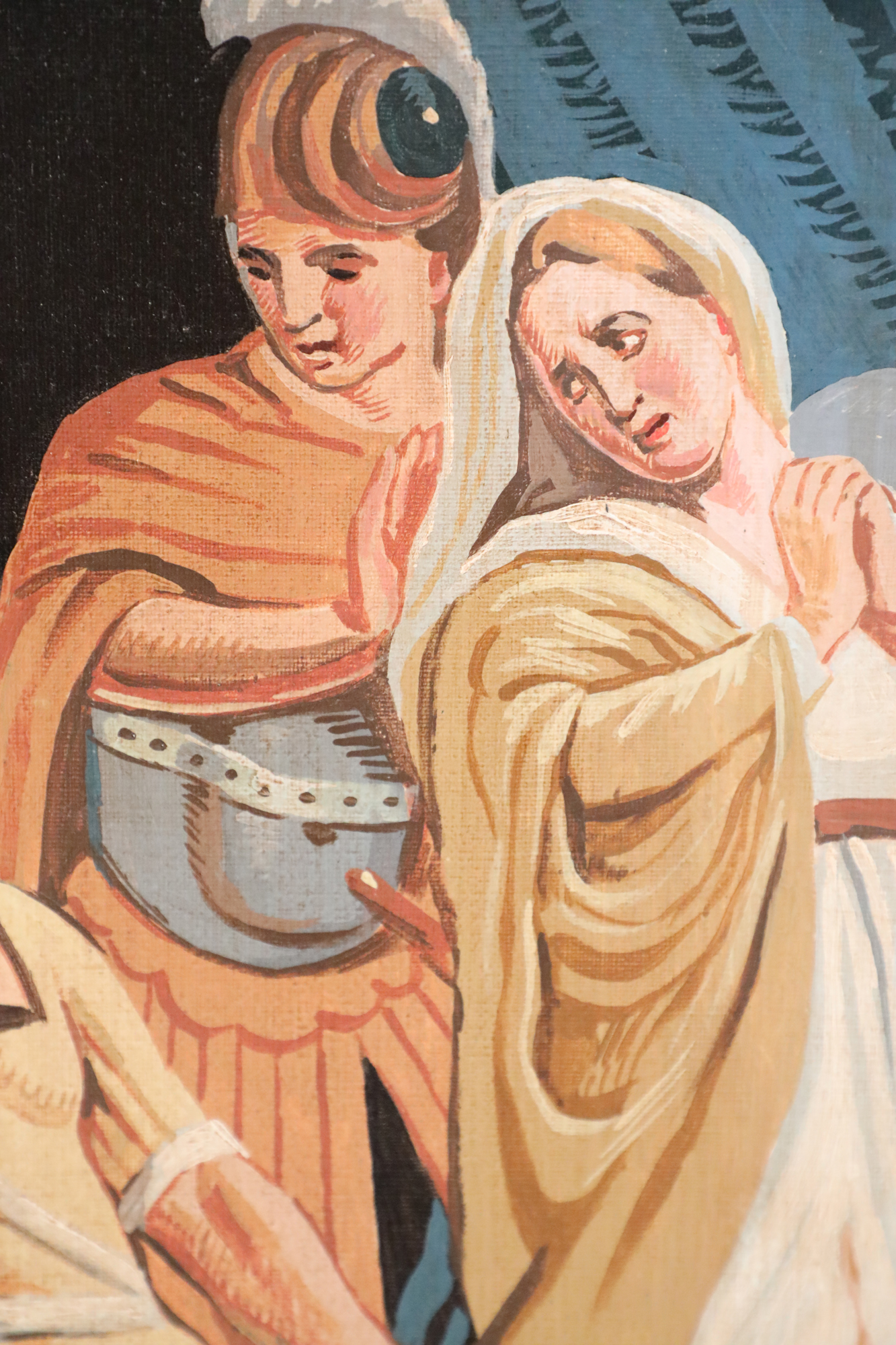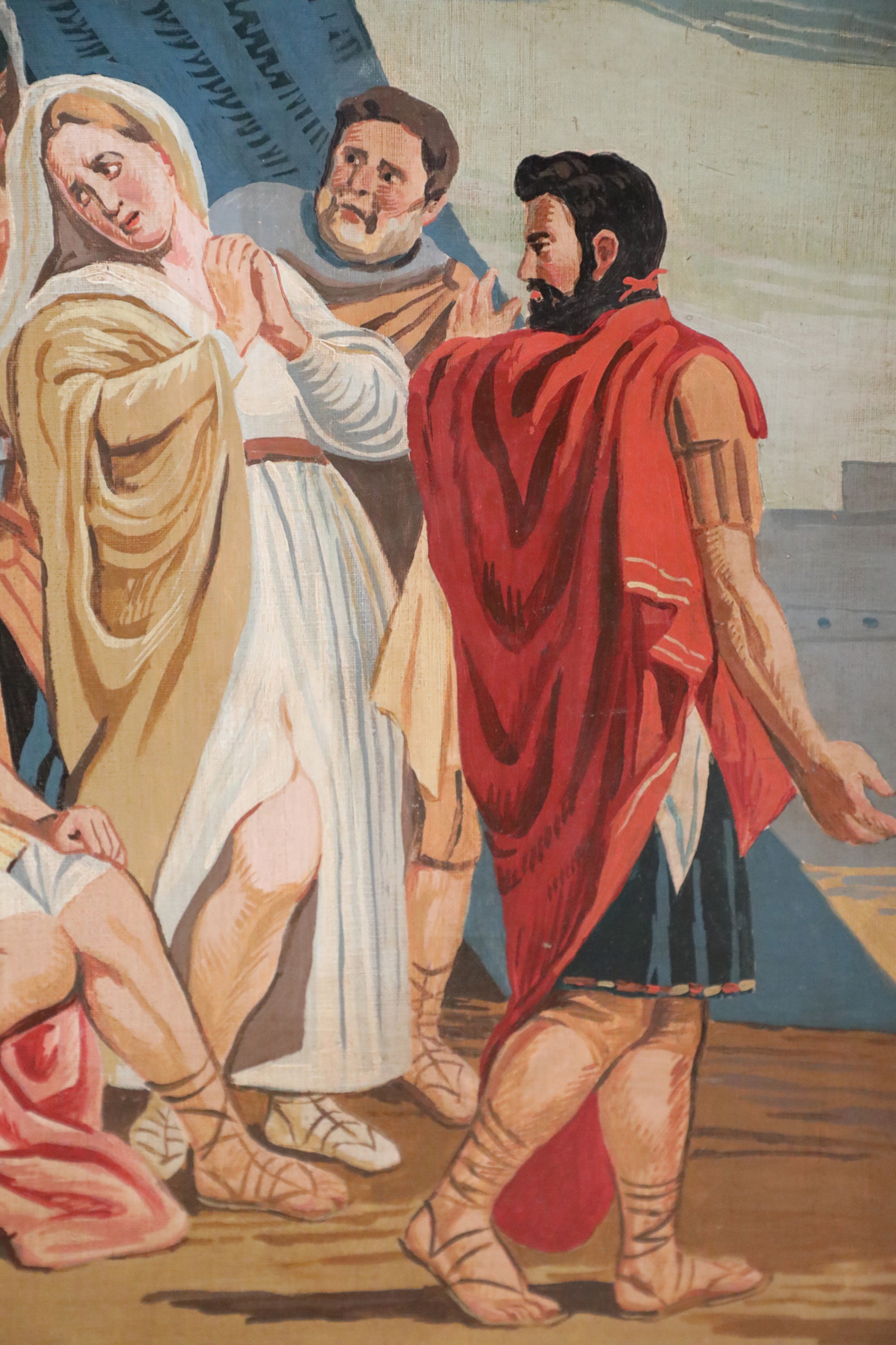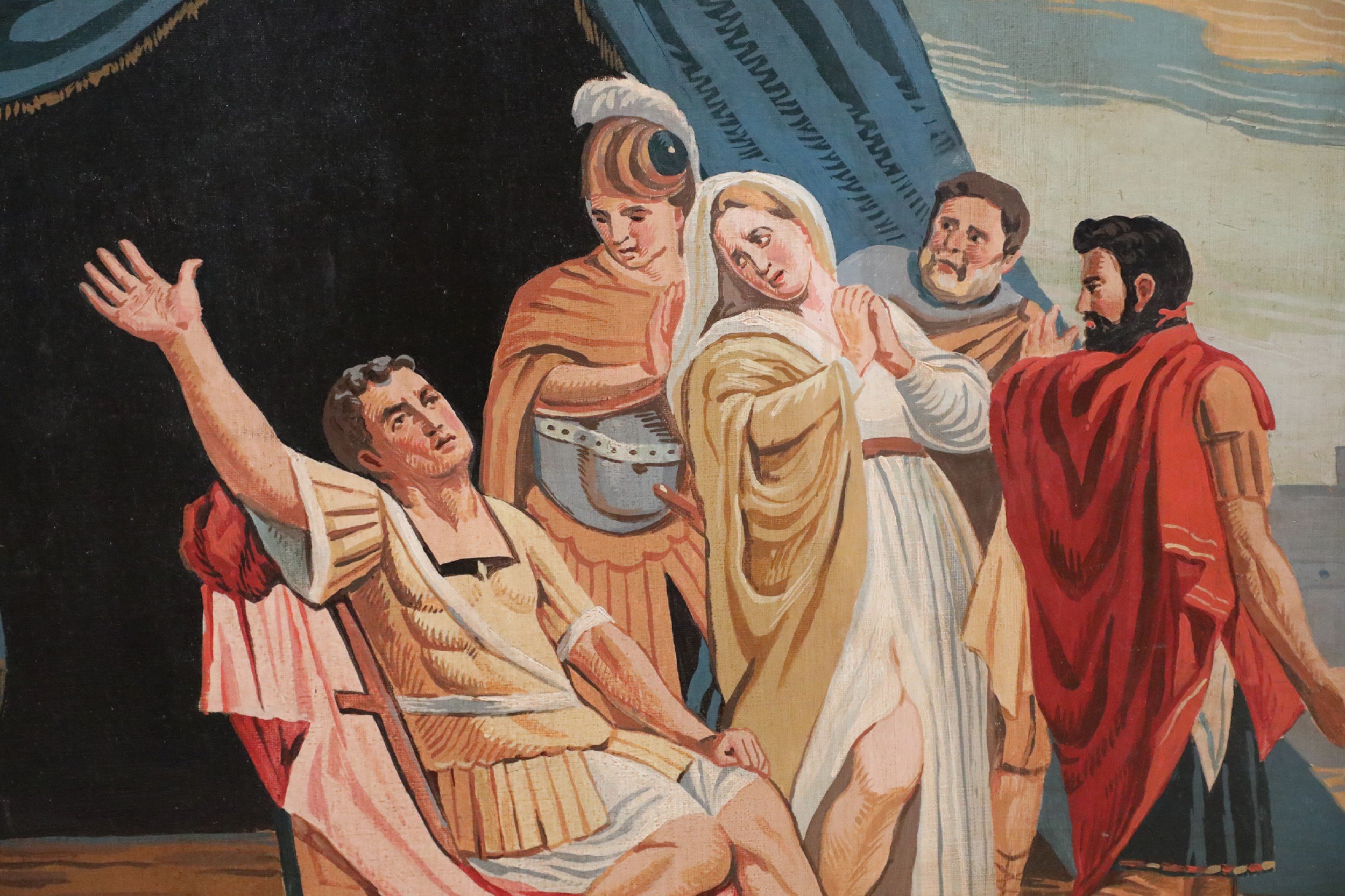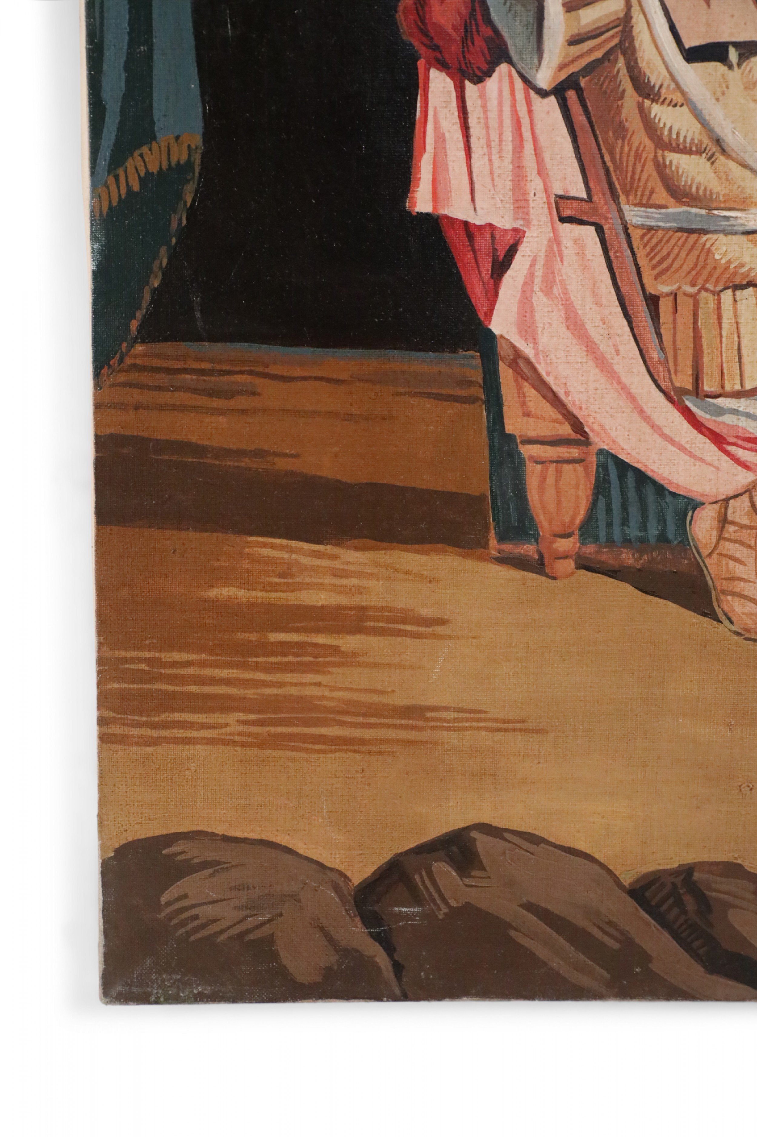 Italian Neo-classic style (20th Century) unframed painting of a gladiator seated in front of a blue tent with gold fringed drapes, making a grand gesture while four others look on adoringly, on unframed canvas. (Similar painting in slightly brighter colors: NWL2287B).