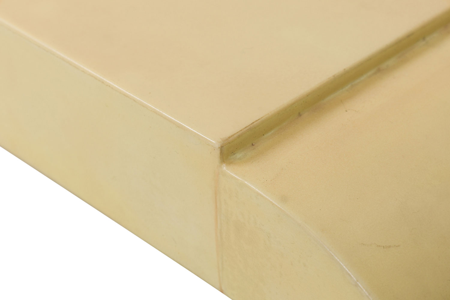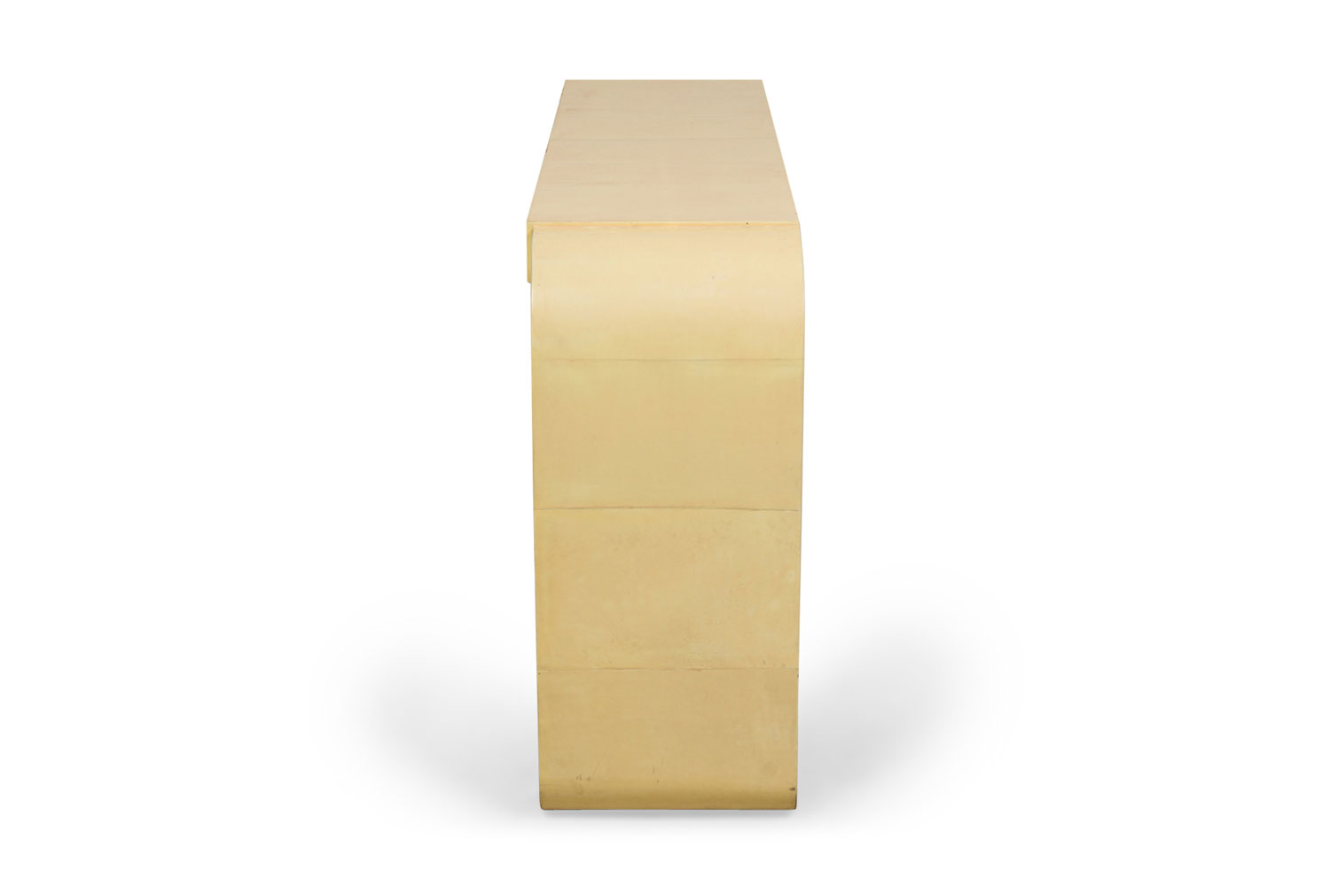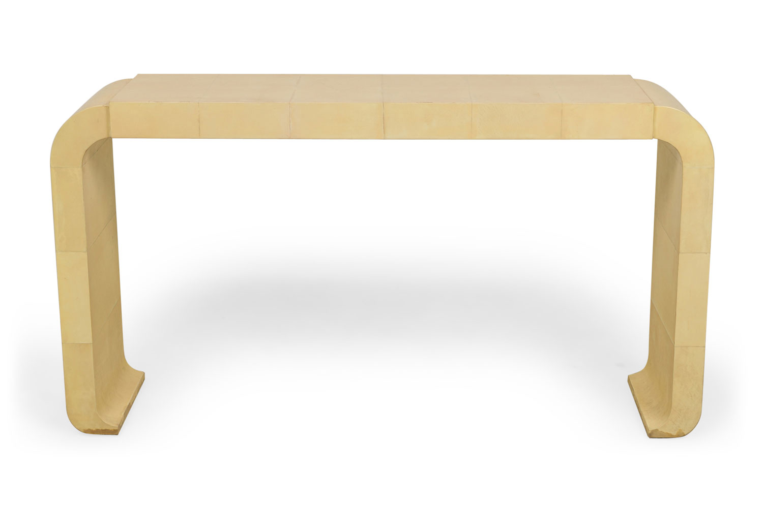 PAIR of Mid-Century Italian-style (modern) parchment veneer console tables with rounded edges and raised center sections. (PRICED AS PAIR) (NEWEL MODERN COLLECTION).