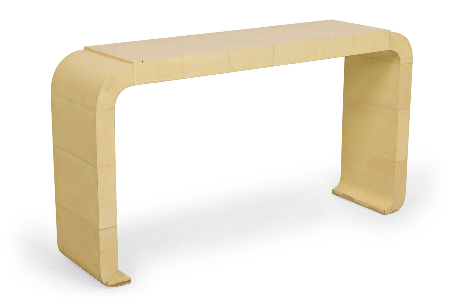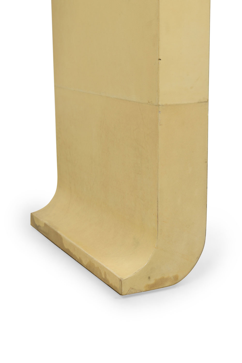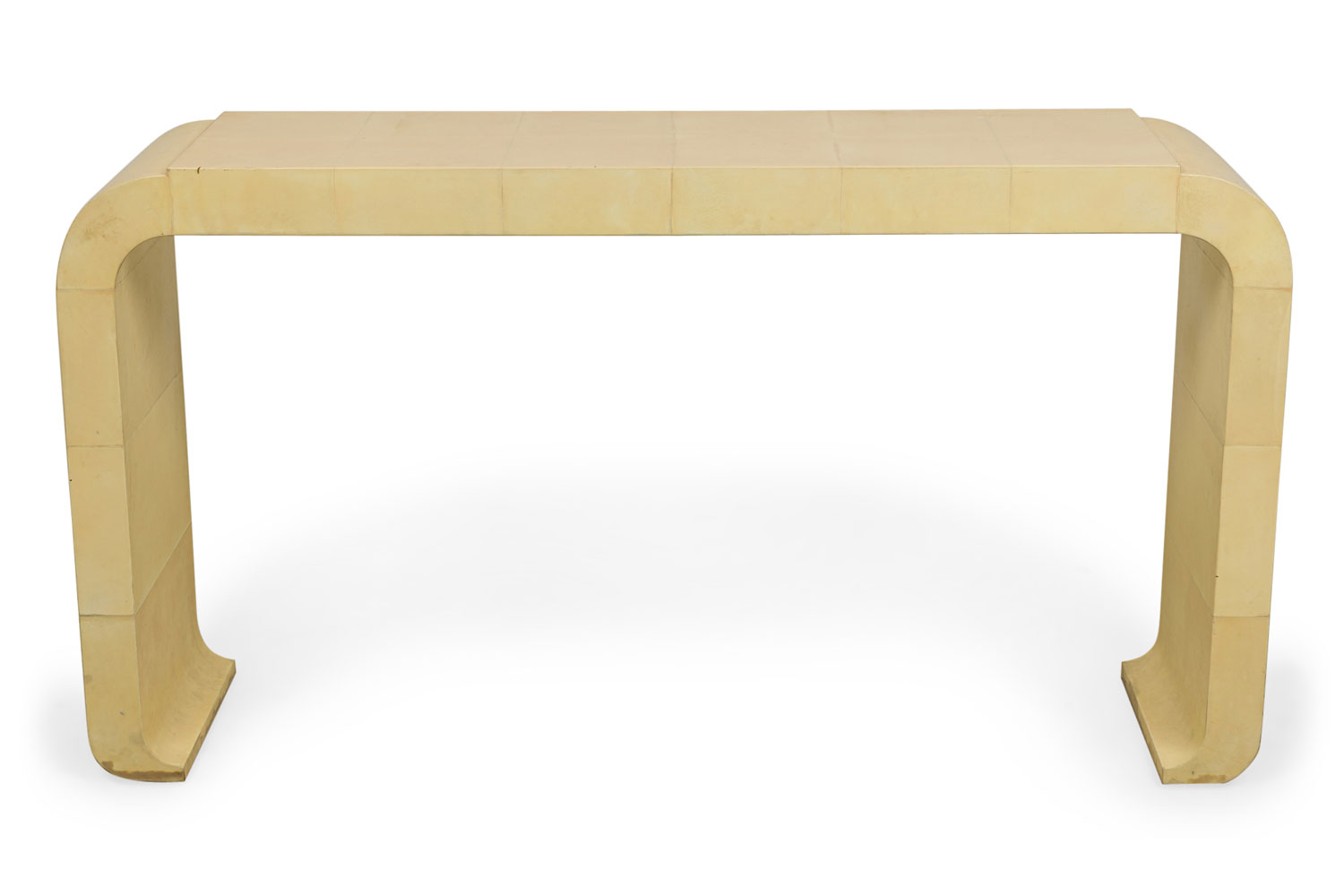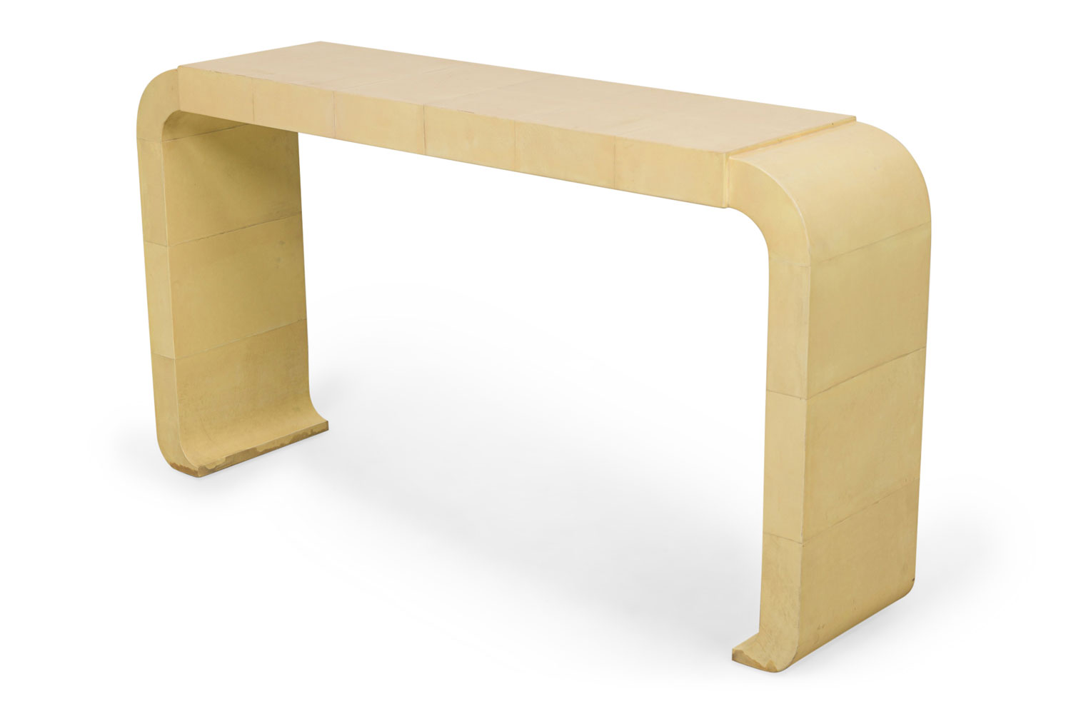 PAIR of Mid-Century Italian-style (modern) parchment veneer console tables with rounded edges and raised center sections. (PRICED AS PAIR) (NEWEL MODERN COLLECTION)