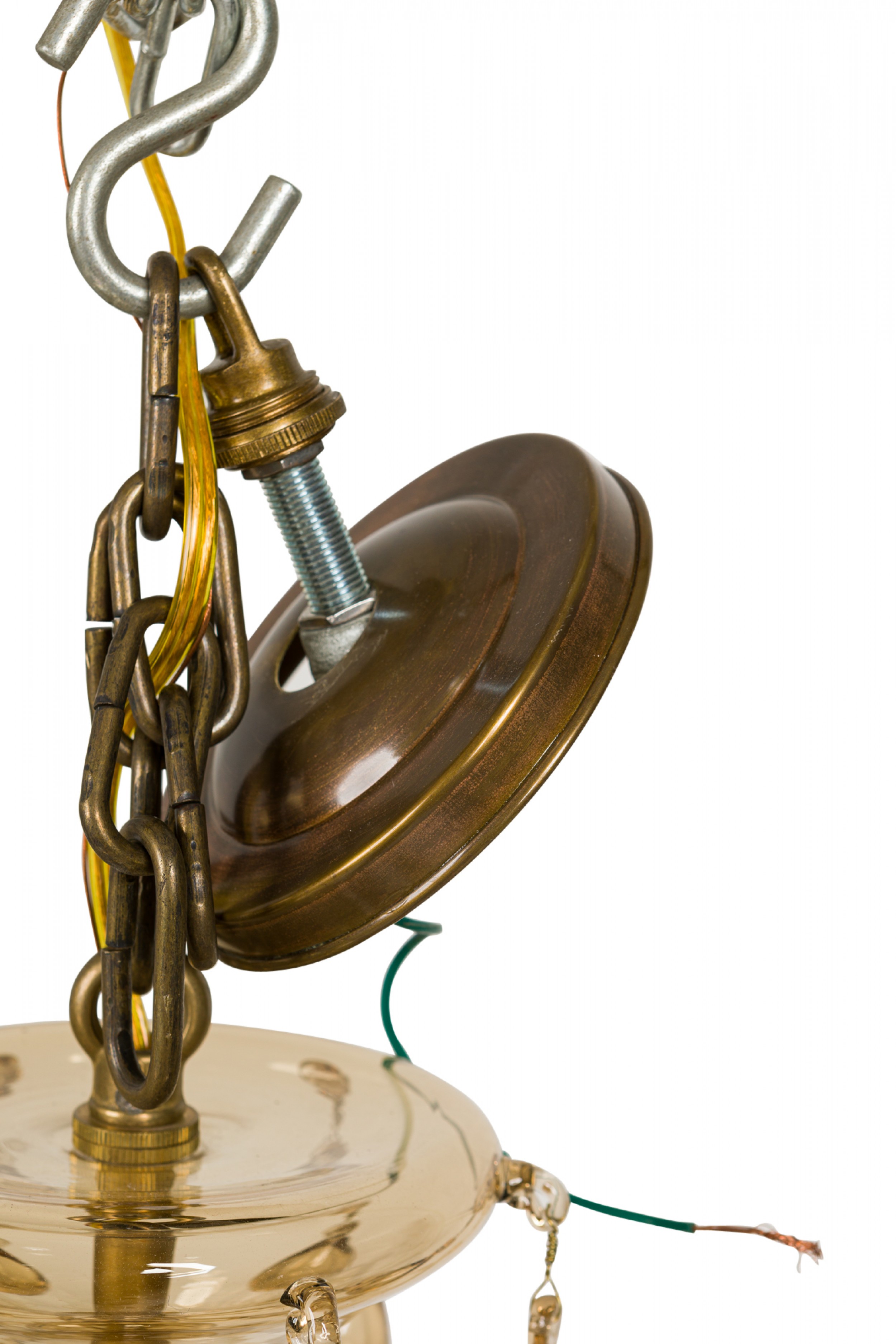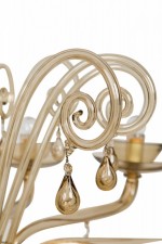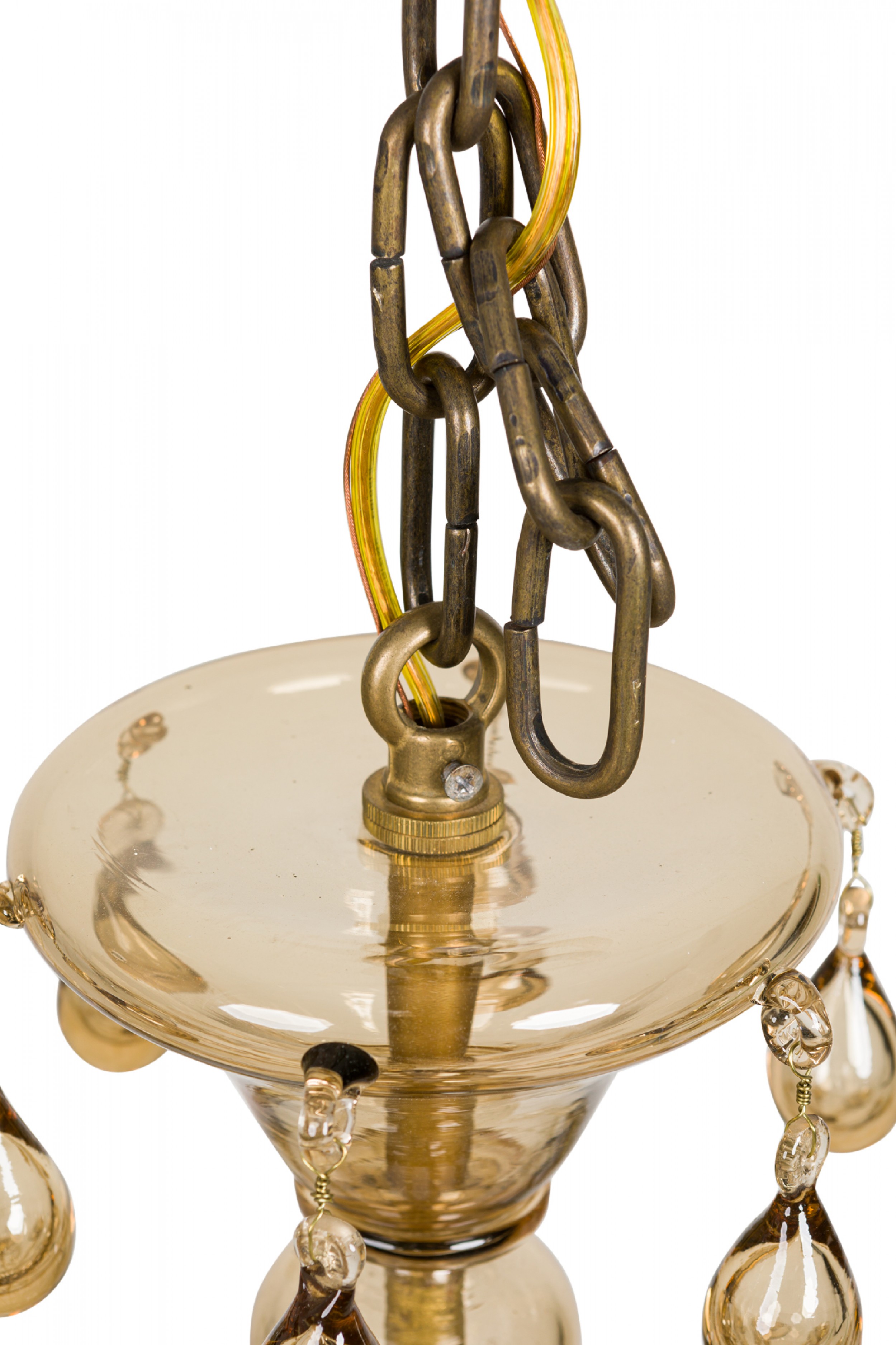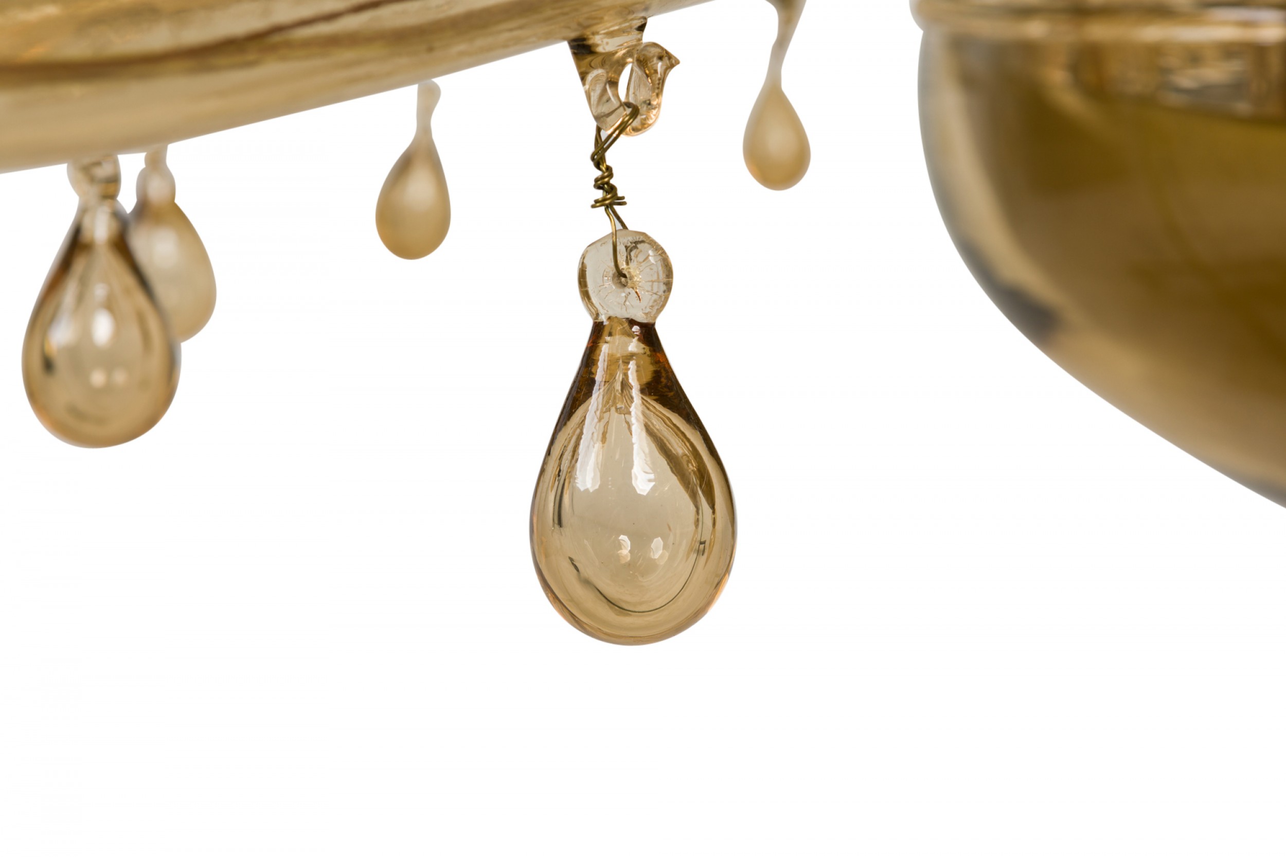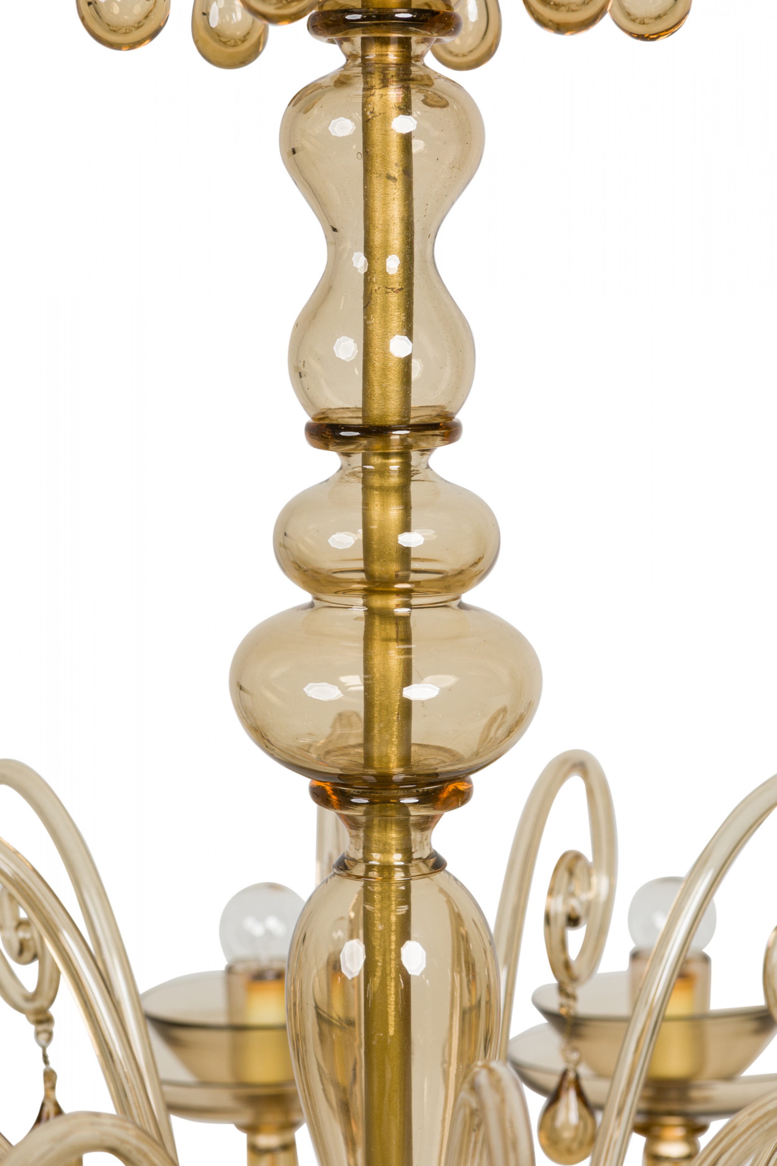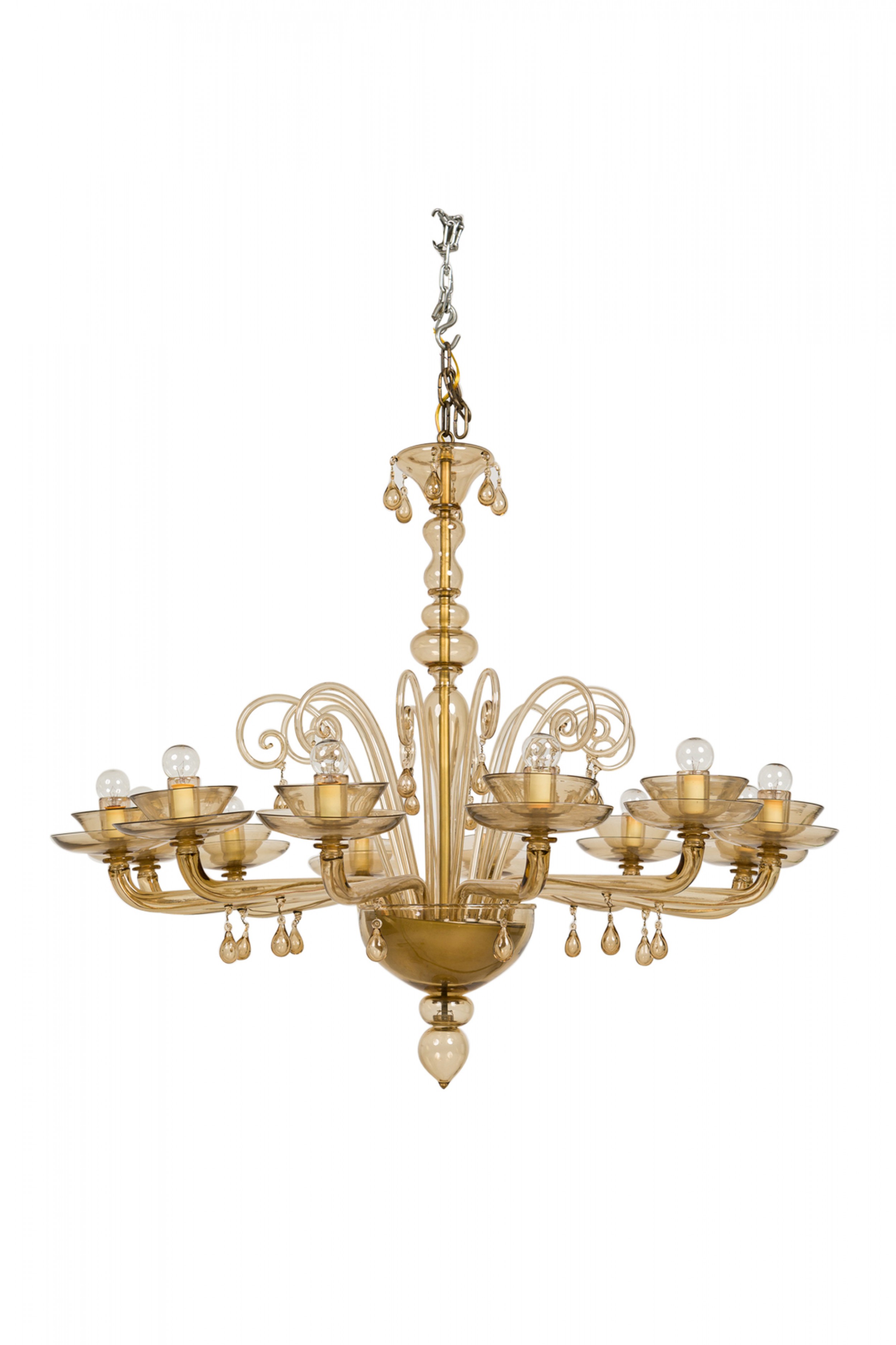 Italian Art Moderne (circa 1940) amber blown glass 12-arm chandelier with two nested bobeches beneath a tier of volutes issuing from a central dish suspended from a baluster stem and canopy with hanging drops throughout. (MURANO).
