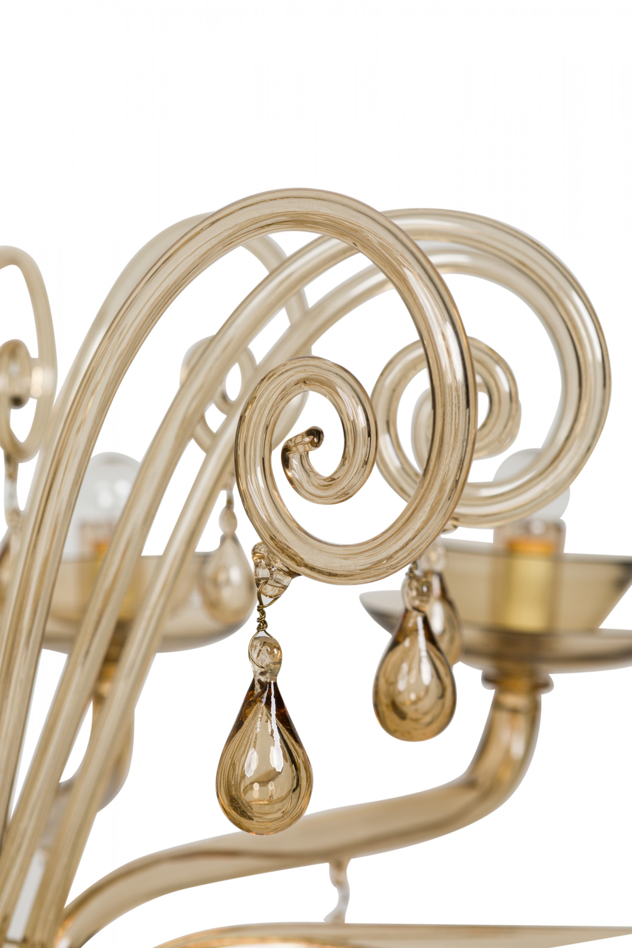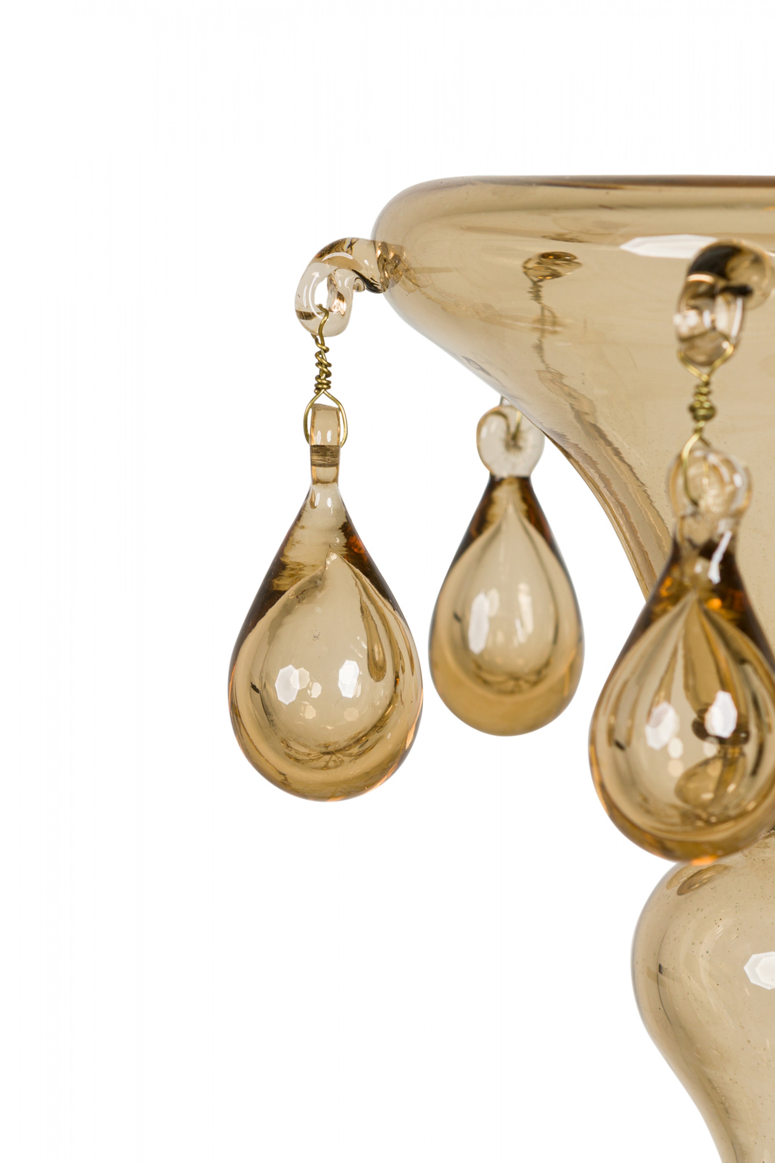Italian Art Moderne (circa 1940) amber blown glass 12-arm chandelier with two nested bobeches beneath a tier of volutes issuing from a central dish suspended from a baluster stem and canopy with hanging drops throughout. (MURANO)