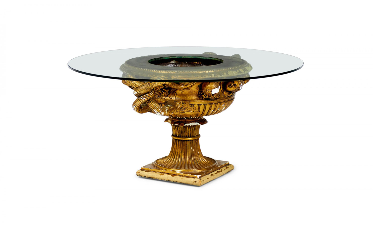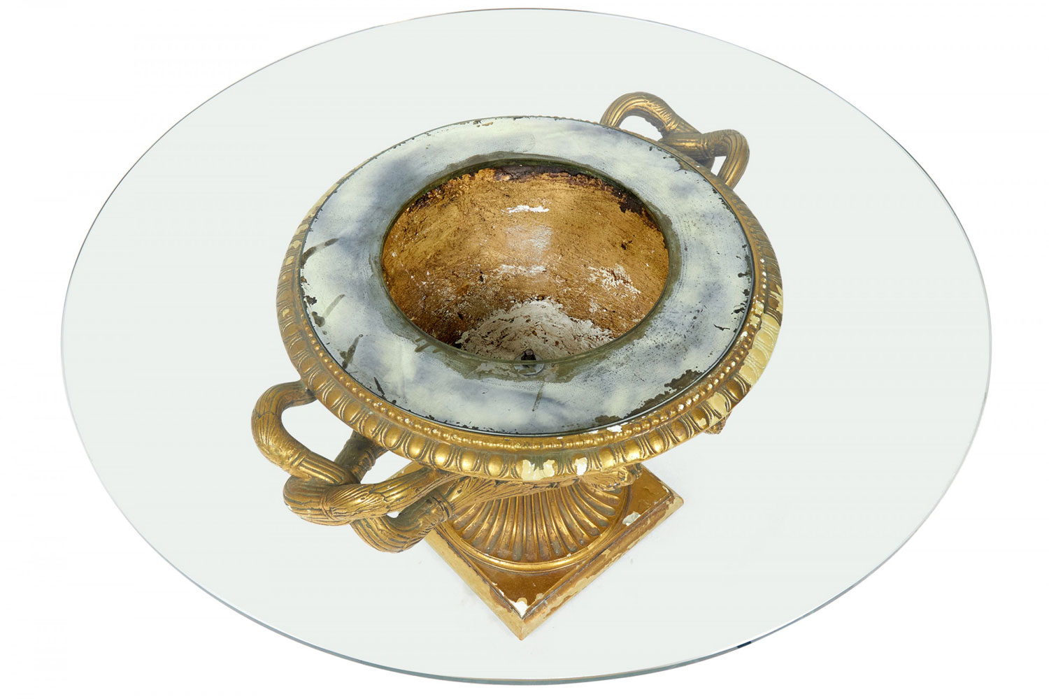 American Mid-Century High Style (circa 1940) planter coffee table comprised of a gilt finished plaster urn topped with a circular glass top with round central opening to accommodate a plant. (JAMES MONT)