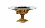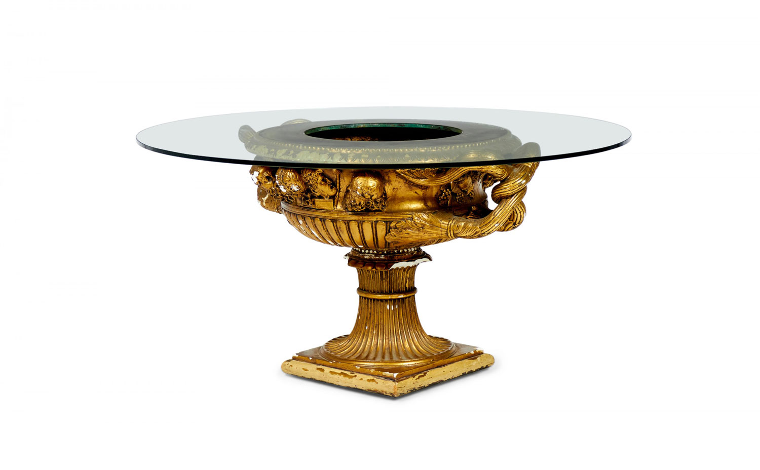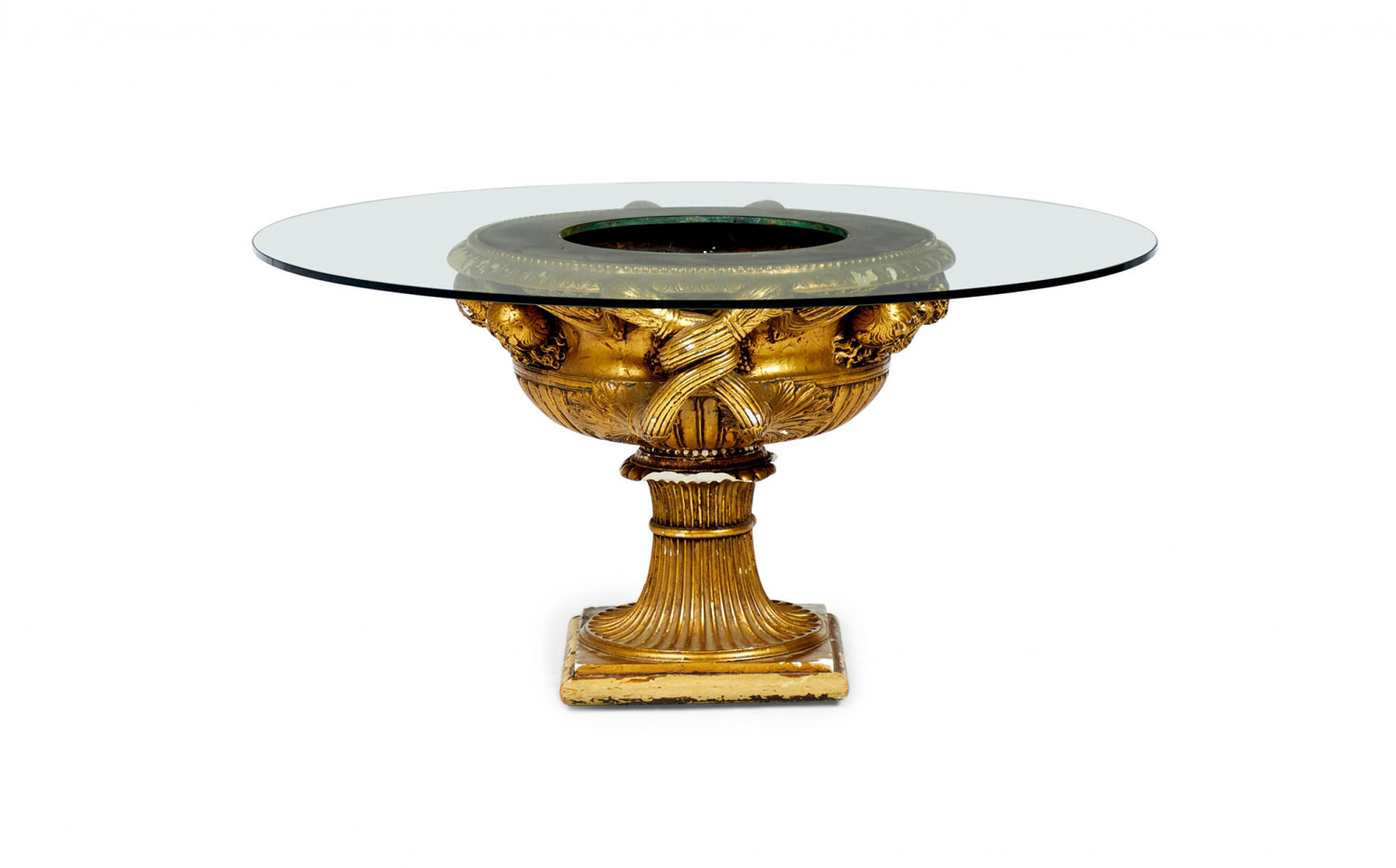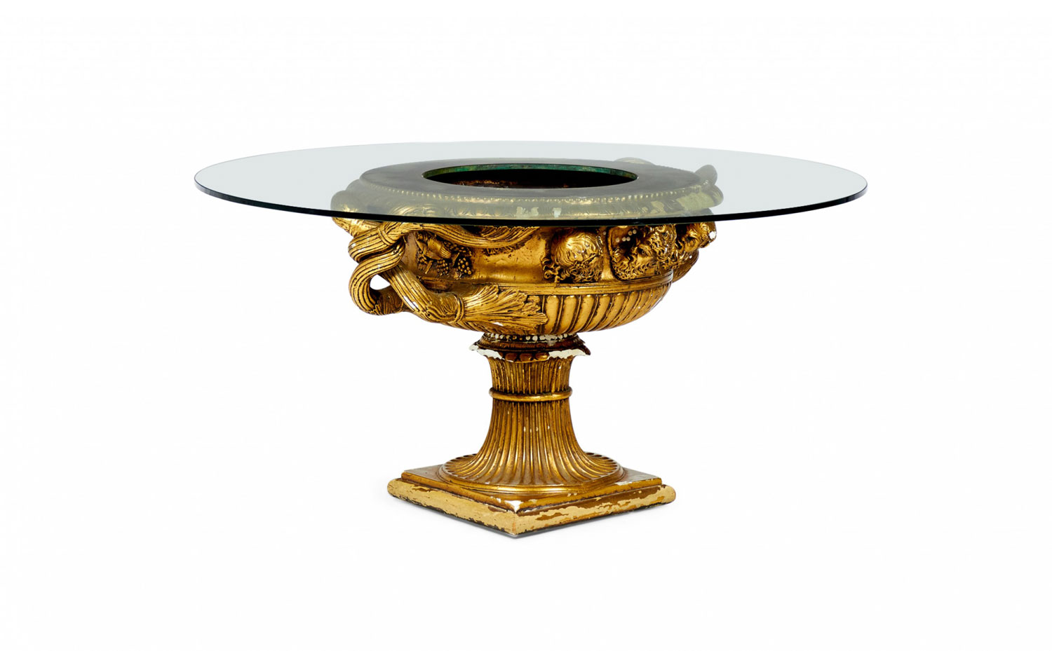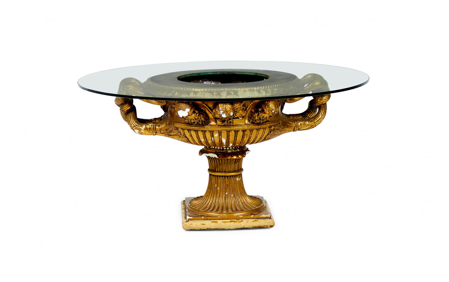 American Mid-Century High Style (circa 1940) planter coffee table comprised of a gilt finished plaster urn topped with a circular glass top with round central opening to accommodate a plant. (JAMES MONT).