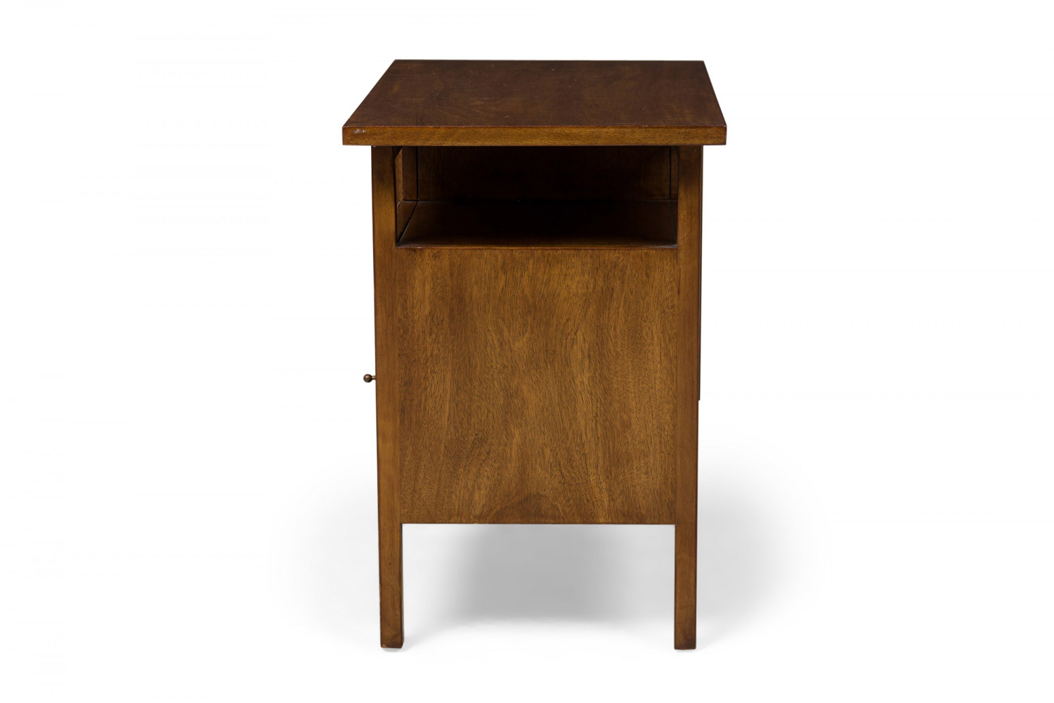 PAIR American Mid-Century walnut bedside tables / end tables with mirrored drawer and cabinet arrangements, including a single drawer and an open compartment over a mirrored base arrangement comprised of an open cabinet and a larger closed cabinet with a slat front door, resting on four square walnut legs. (JOHN STUART)(PRICED AS PAIR)..