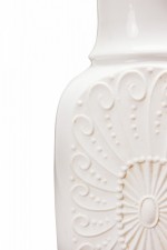 West German Mid-Century white porcelain vase with a squared base featuring a raised pattern of a central medallion with spirals and dots radiating from the center below a slightly flared cylindrical neck. (mark on bottom, ROYAL PORZELLAN BAVARIA KPM GERMANY HANDARBEIT)