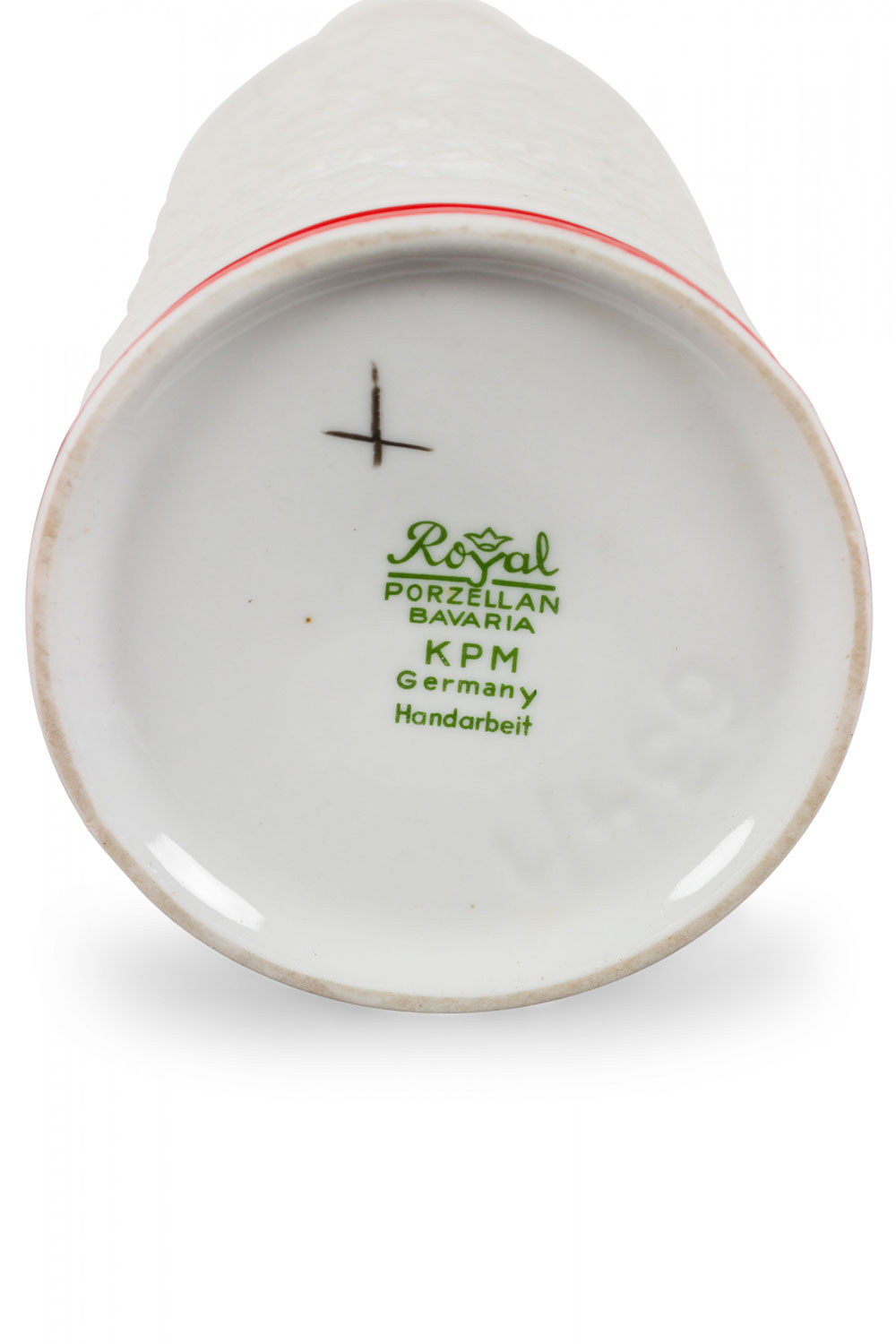 West German Mid-Century porcelain vase with a white textured cylindrical mouth and body, connected by a narrow red glazed porcelain neck. (Königliche Porzellan Manufaktur, mark on bottom, ROYAL PORZELLAN BAVARIA, KPM GERMANY, HANDARBEIT)(Similar piece in all white: 063039).