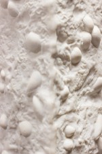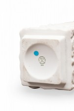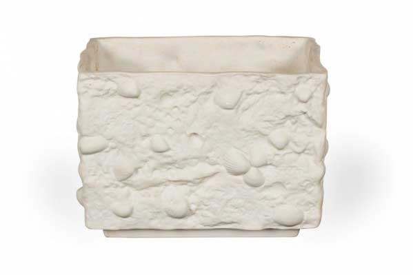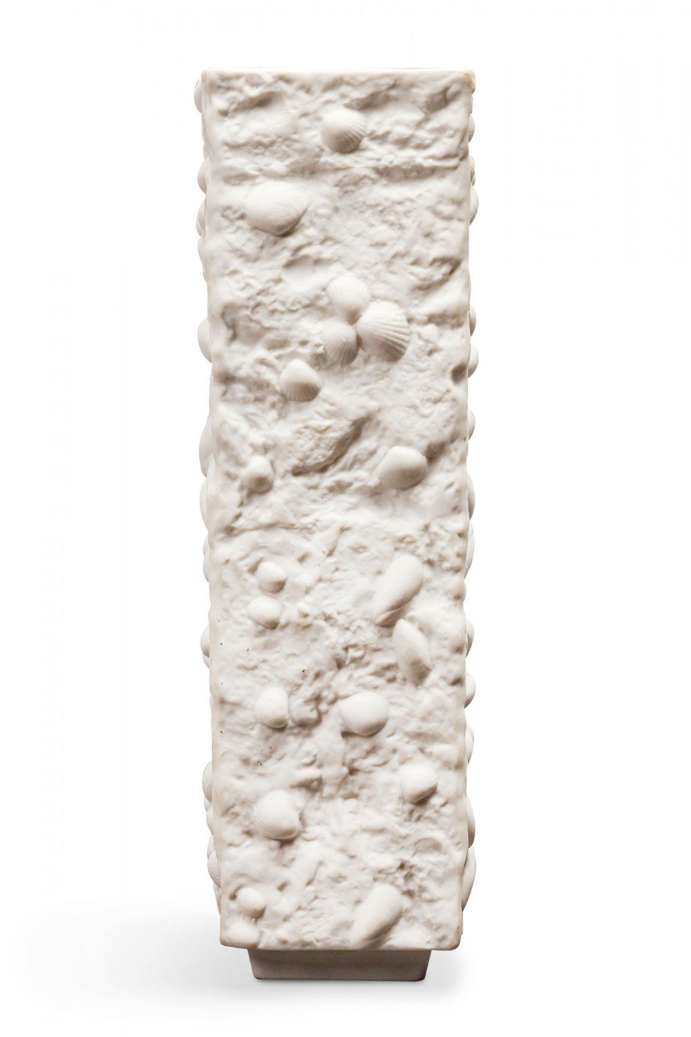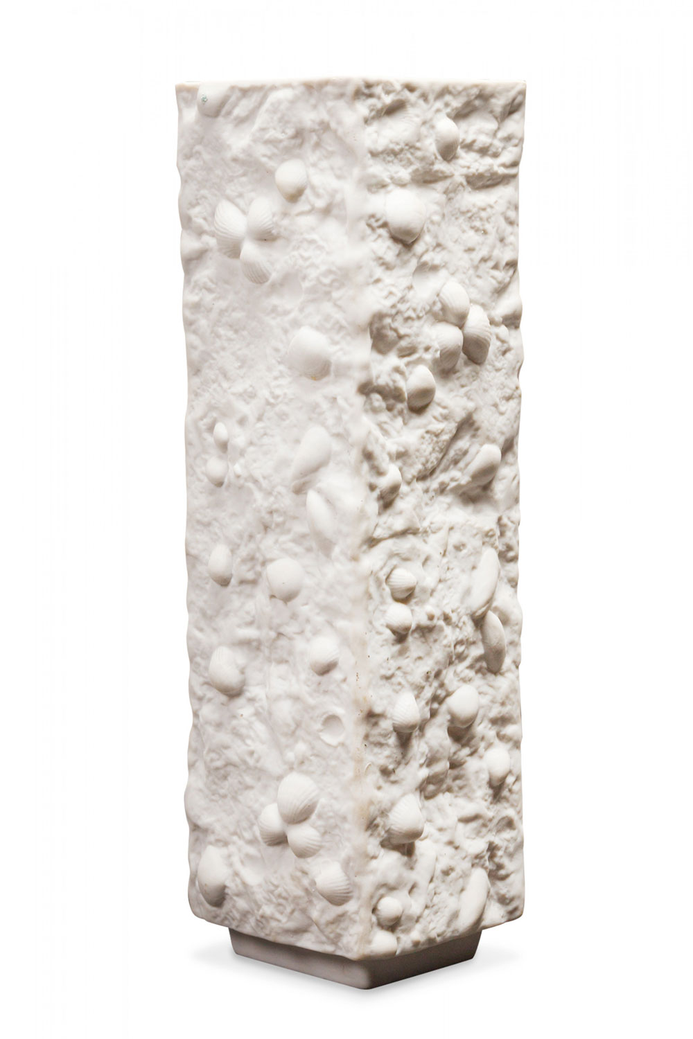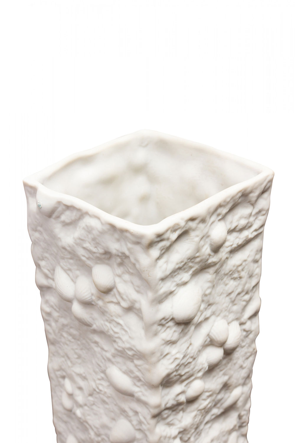 German Mid-Century square white porcelain vase with a textured exterior with small embedded seashell shapes. (mark on bottom, KUNSTPORZELLAN ILMENAU GDR)(Similar piece: 063011).