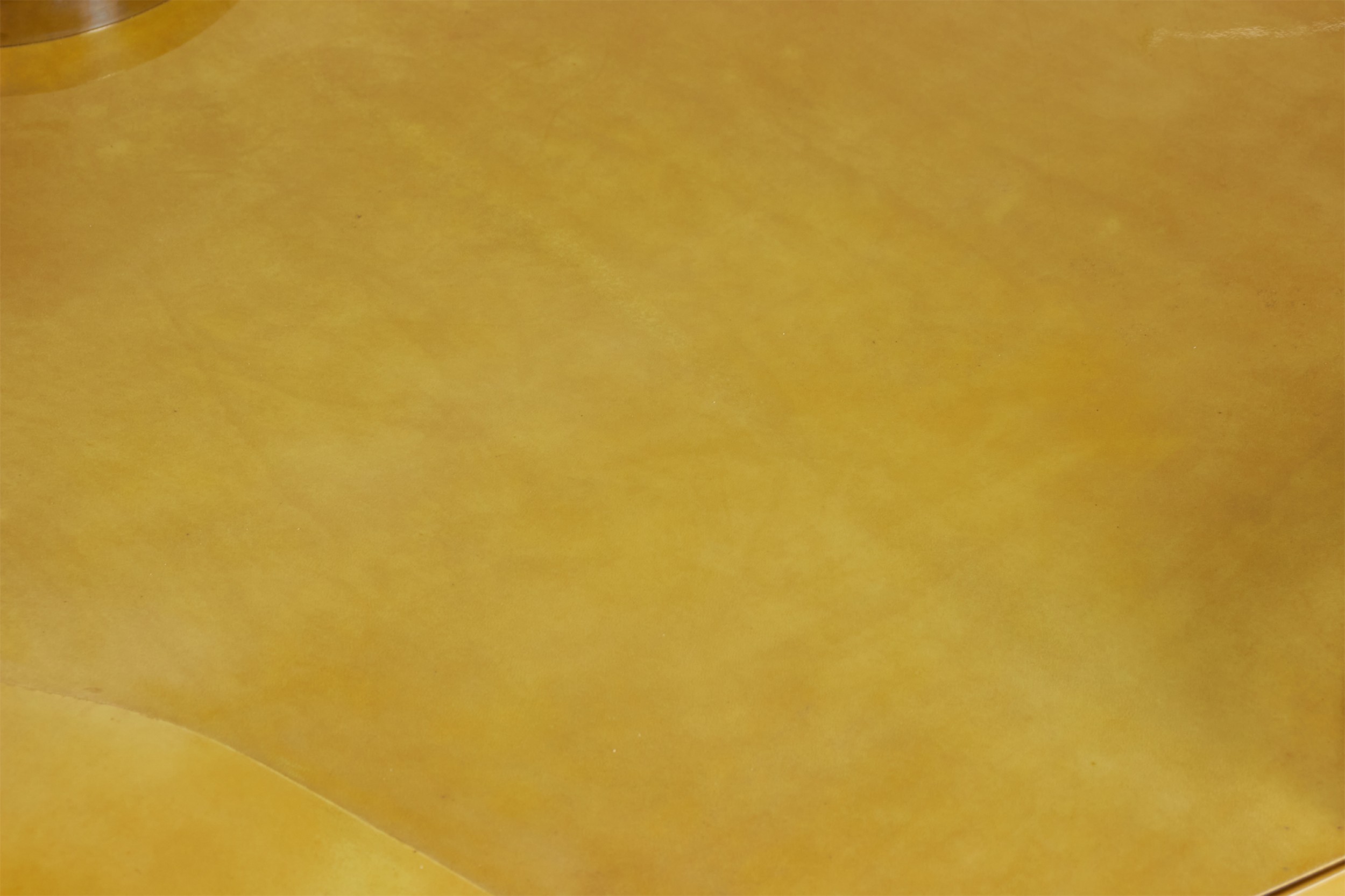 American High Style (circa 1980) articulating coffee / cocktail table with hidden articulating extensions that expand from the sides, with a parchment veneer finish and chrome accents and base. (LORIN MARSH).