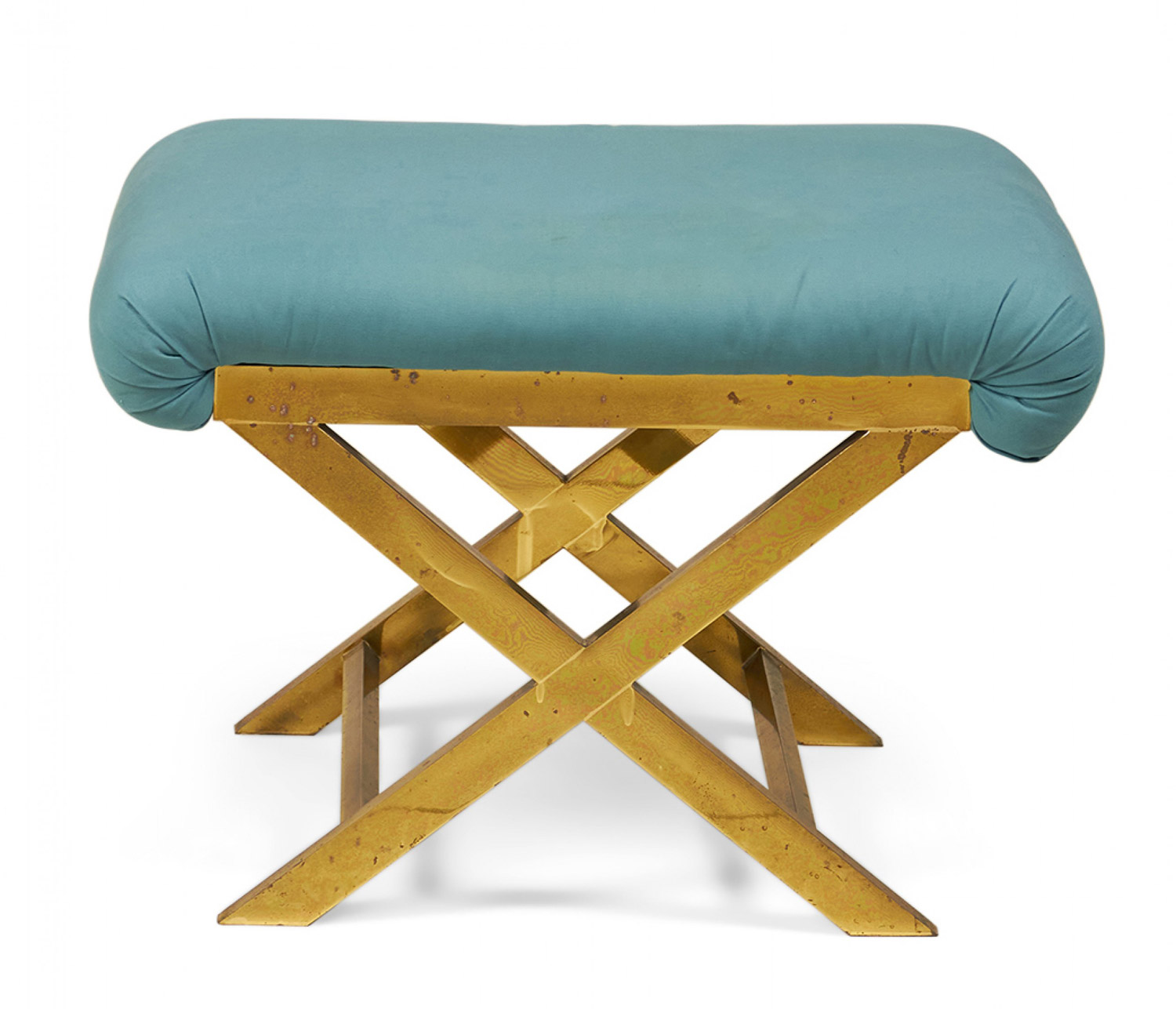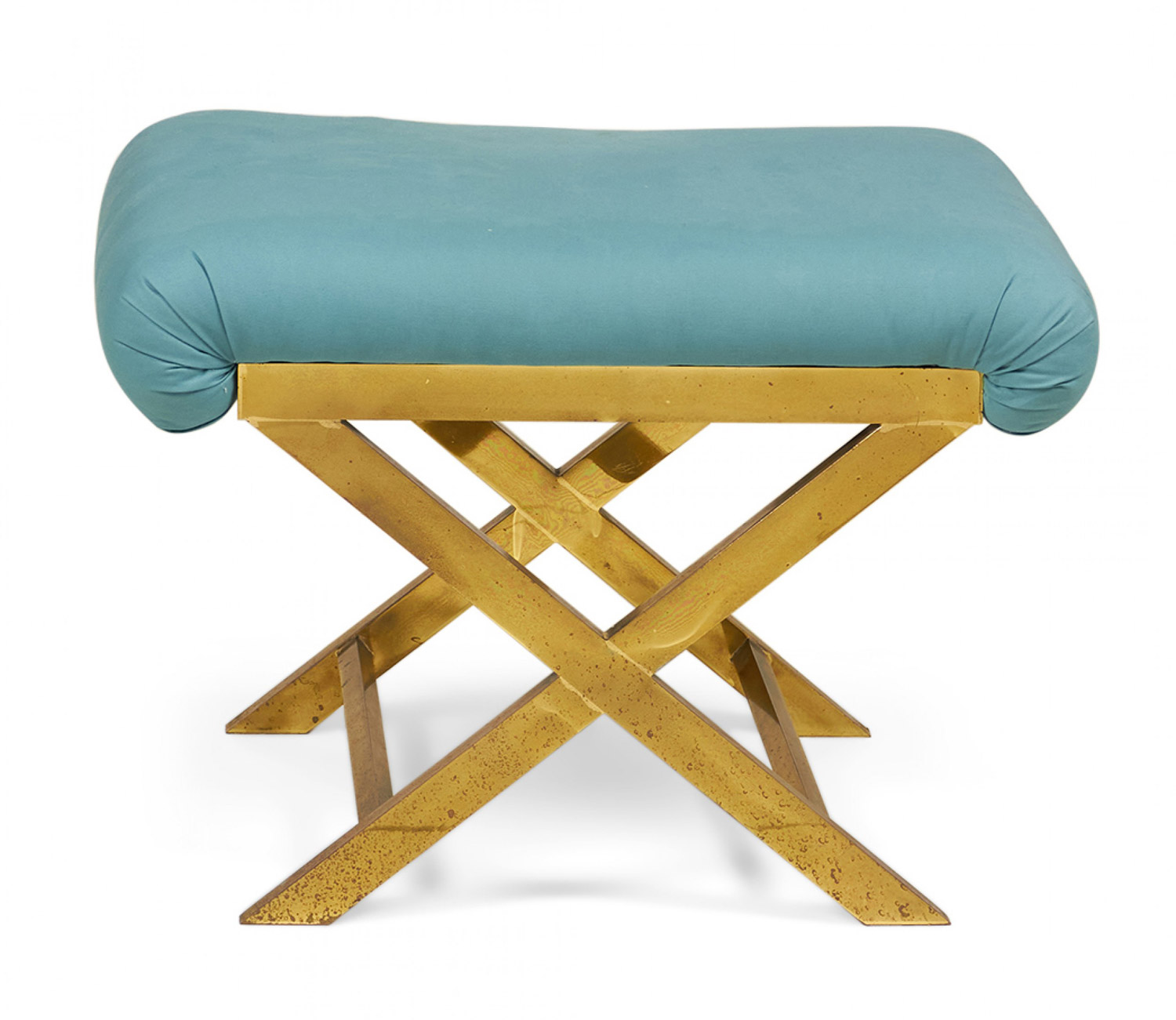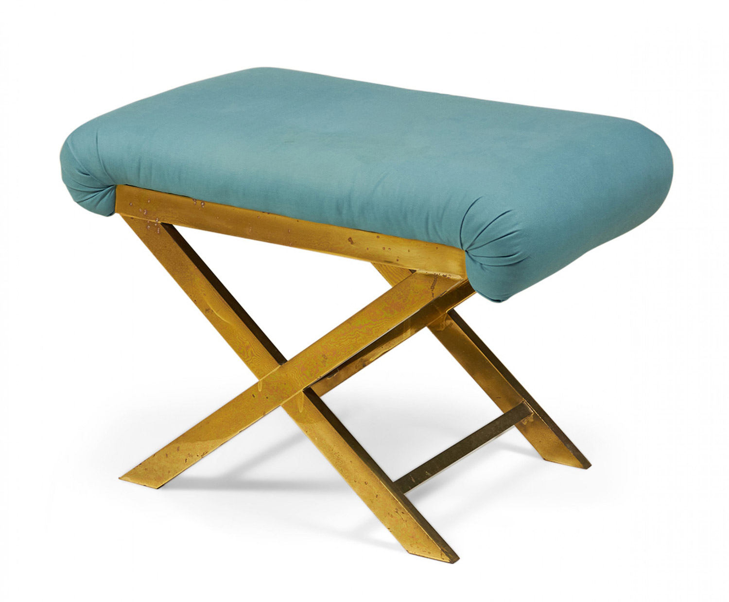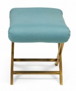 Mid-Century x-bench with a brass frame topped with a teal cotton upholstered seat. (Same benches with different upholstery: DUF0056-DUF0060)