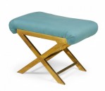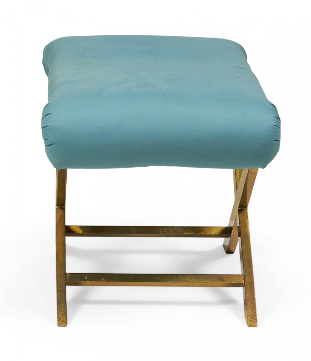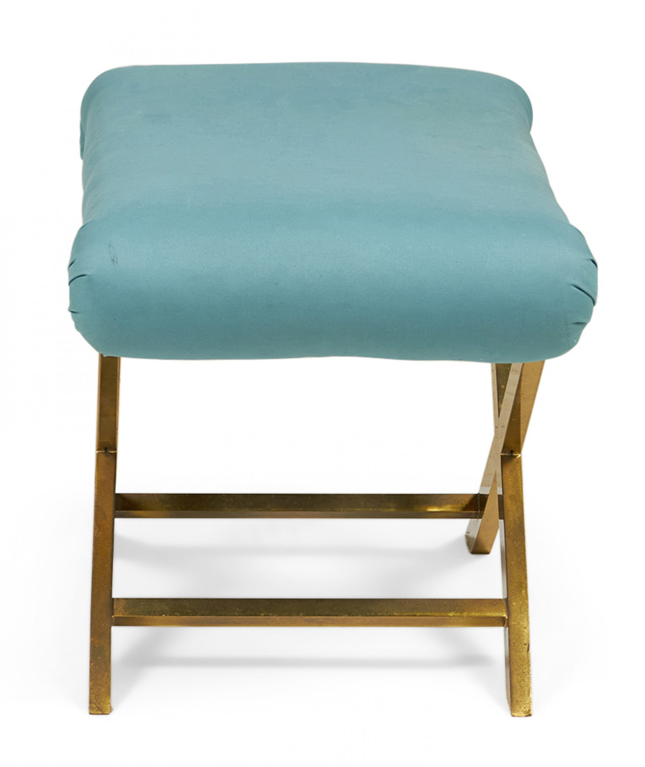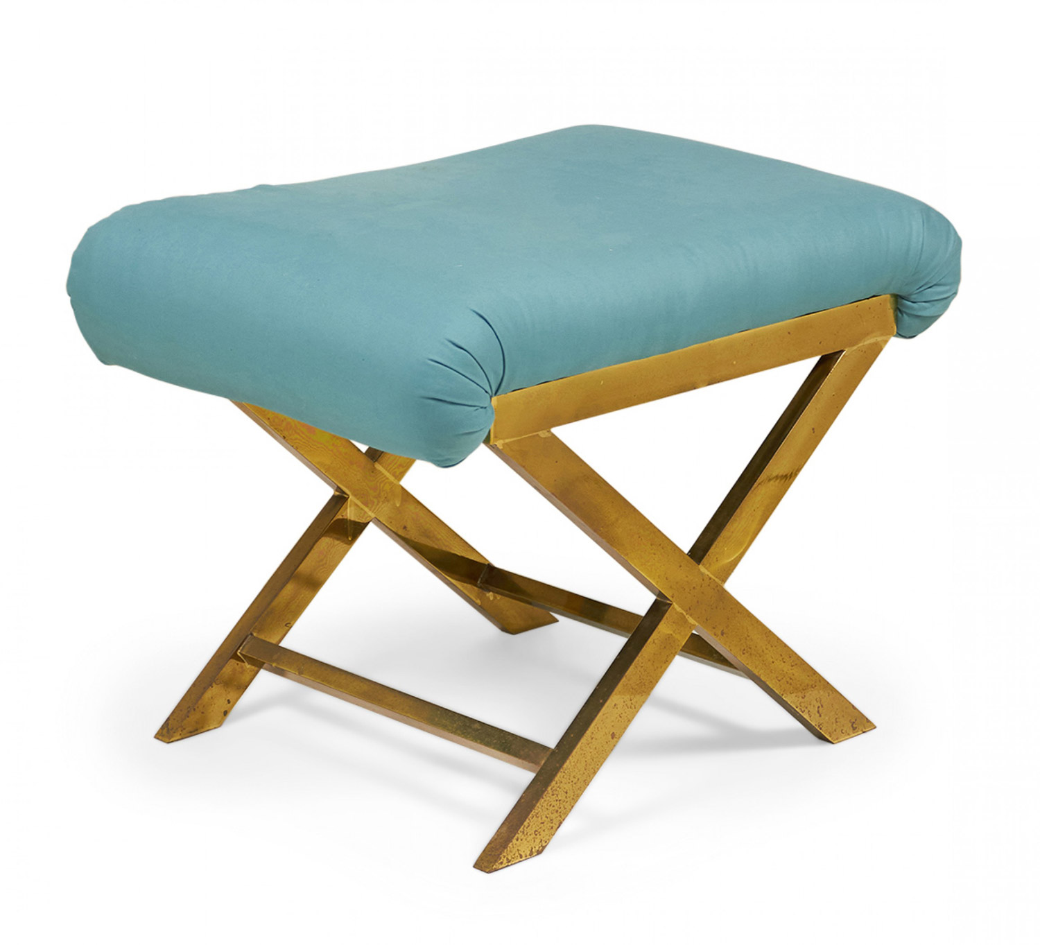 Mid-Century x-bench with a brass frame topped with a teal cotton upholstered seat. (Same benches with different upholstery: DUF0056-DUF0060)