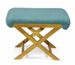 Mid-Century x-bench with a brass frame topped with a teal cotton upholstered seat. (Same benches with different upholstery: DUF0056-DUF0060).
