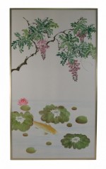 Mid-Century Koi Fish and Tree Painted Silk Panel