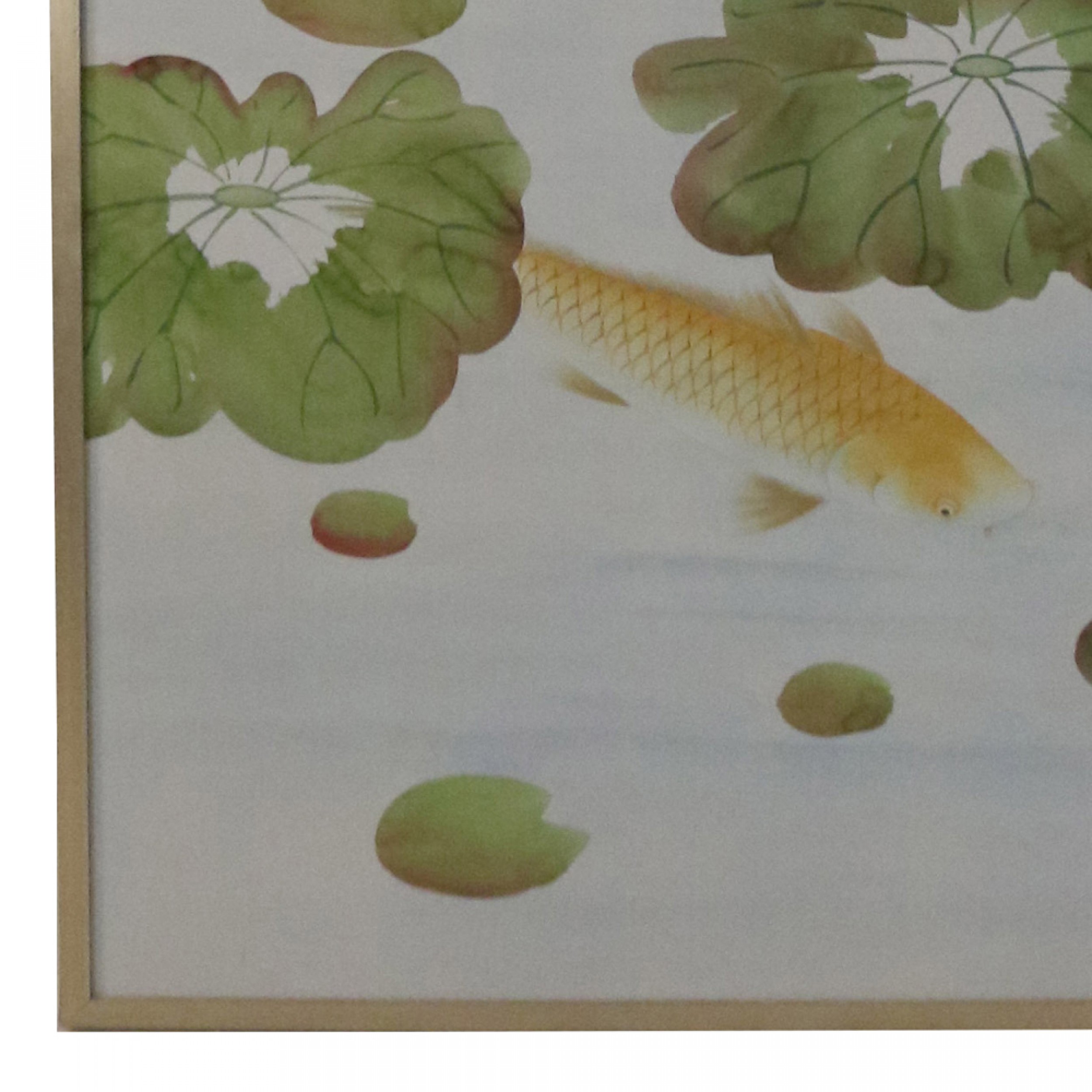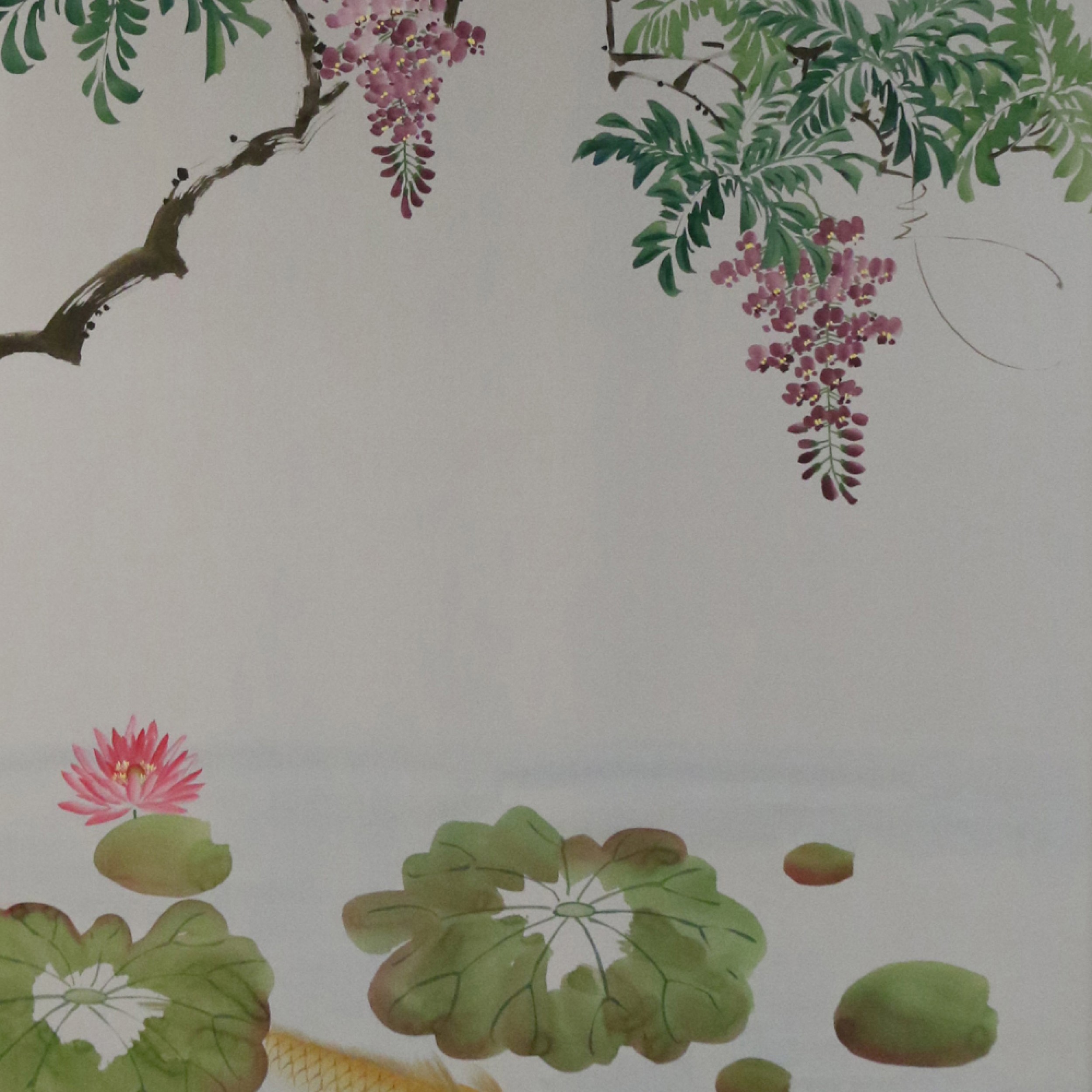 Mid-Century painted gray silk panel featuring a pond scene with koi fish, lily pads, and trees. (Similar pieces: NWL0614)